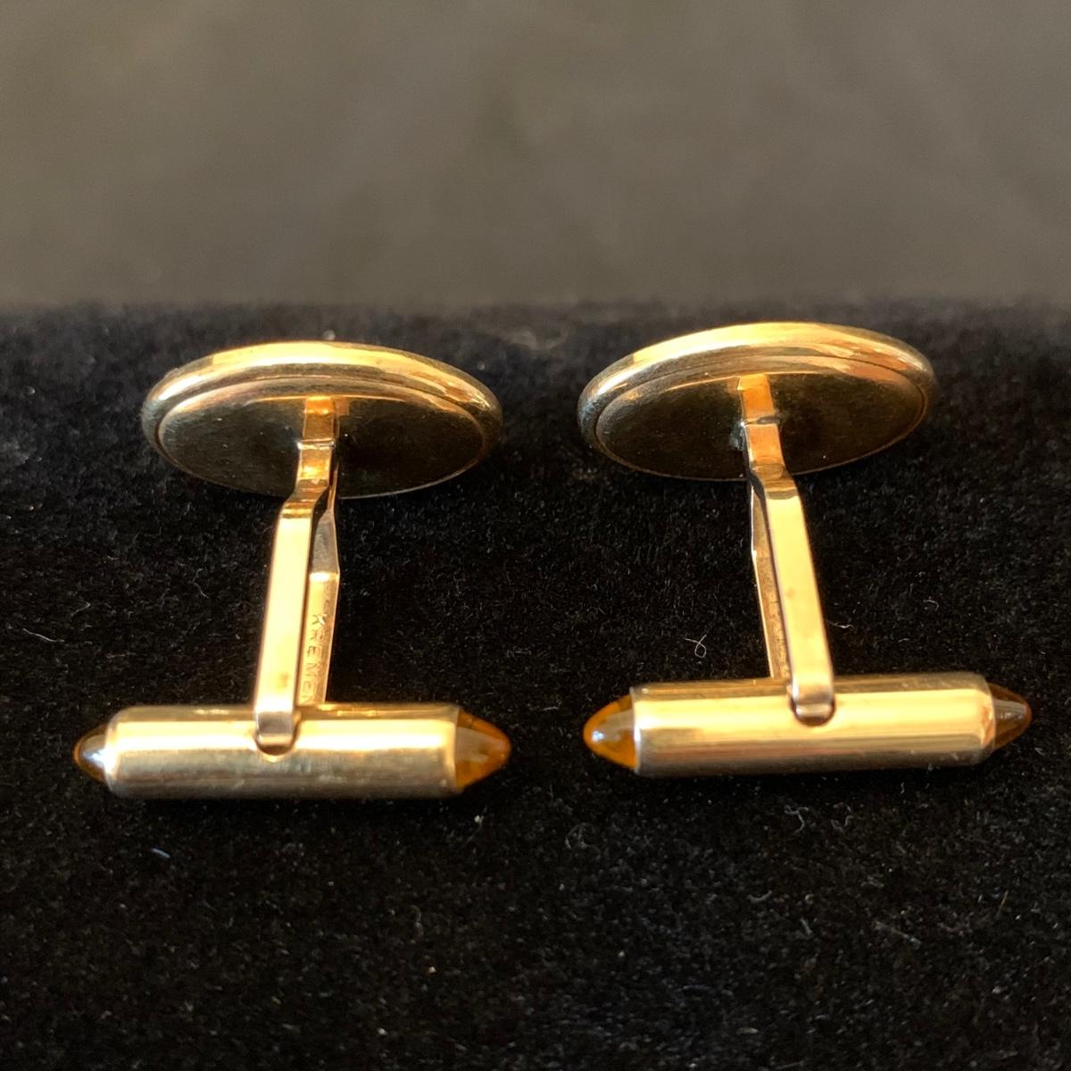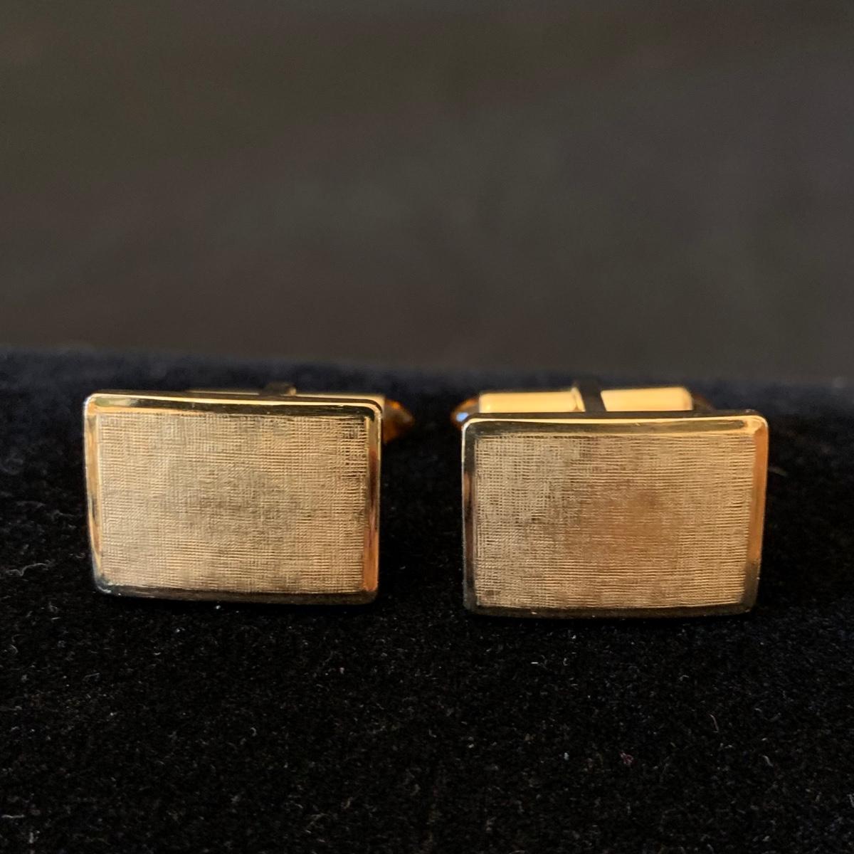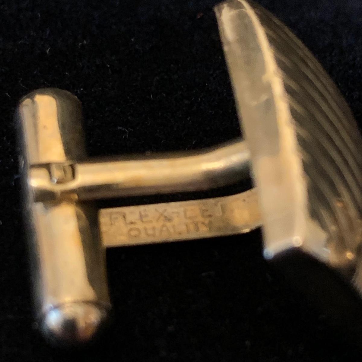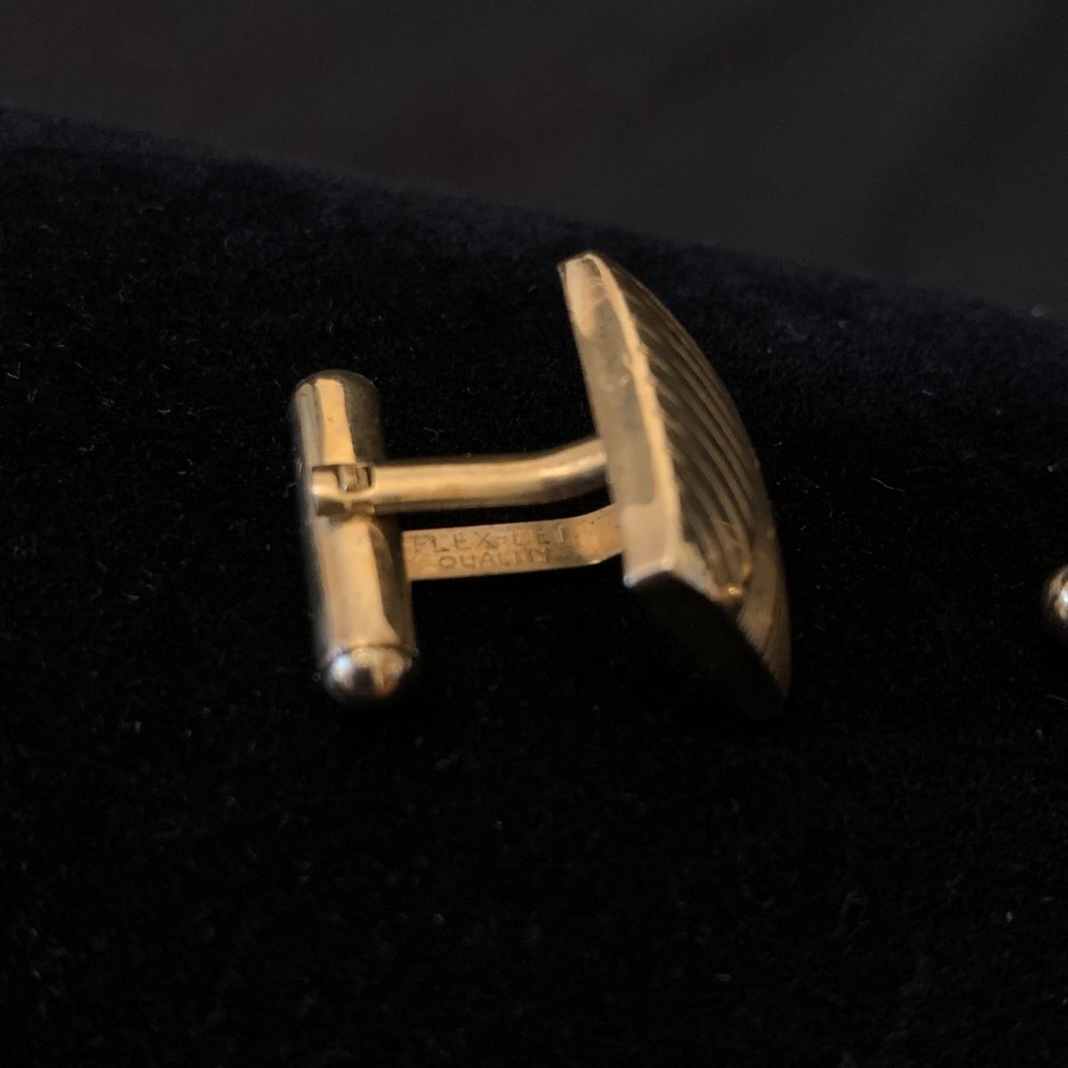 Citizen brand quartz watch with genuine leather black strap. Watch face measures 0.875” x 1”. It is not currently ticking and likely needs a new battery. Watch is marked “˜6031-S06291 SMW”. Two pairs of Krementz cufflinks are included. A Krementz box that is marked 14K Gold Overlay is included, but we cannot verify if one of these pairs or which one of these pairs were originally from this box. The third pair of cufflinks are Flex-Let brand. All three are a gold hued metal.