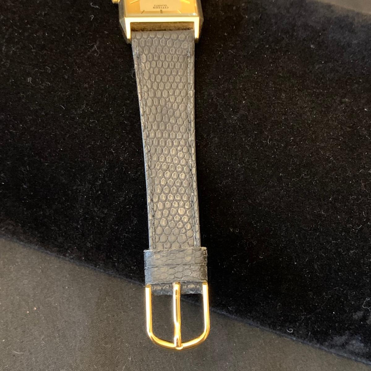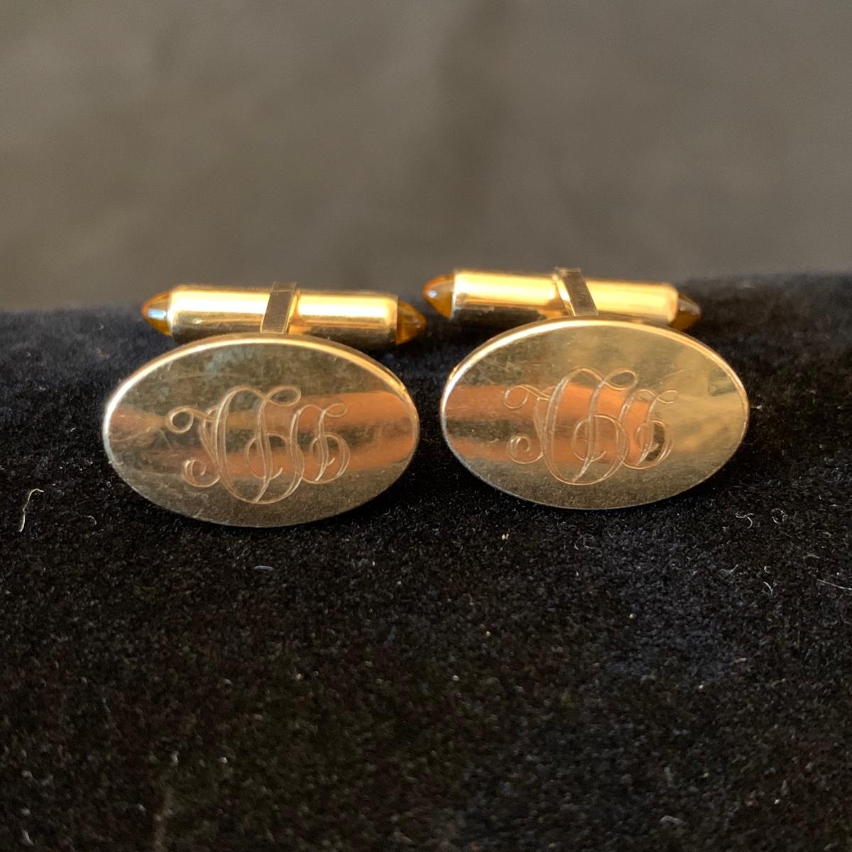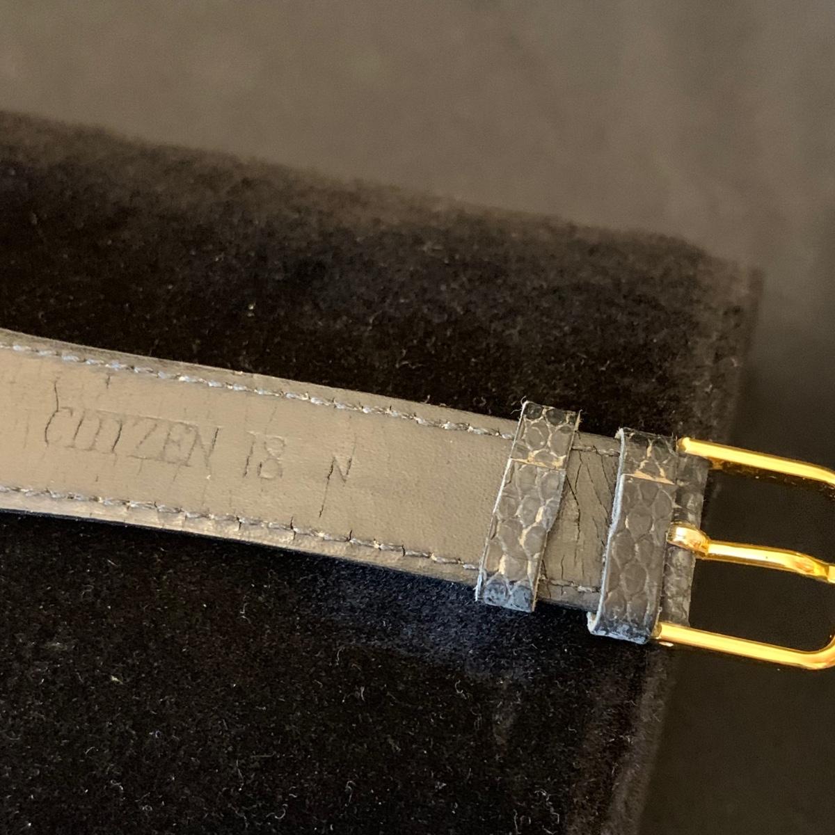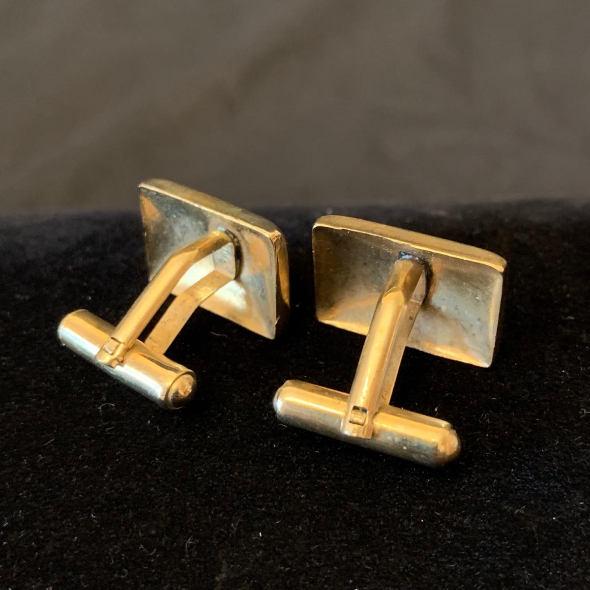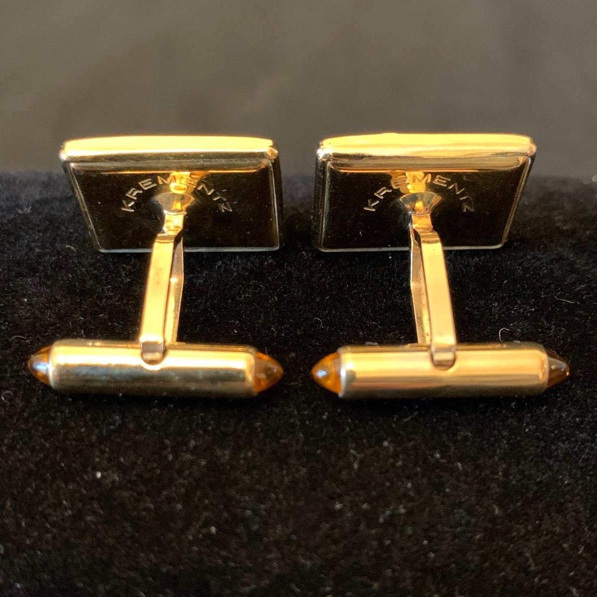 Citizen brand quartz watch with genuine leather black strap. Watch face measures 0.875” x 1”. It is not currently ticking and likely needs a new battery. Watch is marked “˜6031-S06291 SMW”. Two pairs of Krementz cufflinks are included. A Krementz box that is marked 14K Gold Overlay is included, but we cannot verify if one of these pairs or which one of these pairs were originally from this box. The third pair of cufflinks are Flex-Let brand. All three are a gold hued metal.