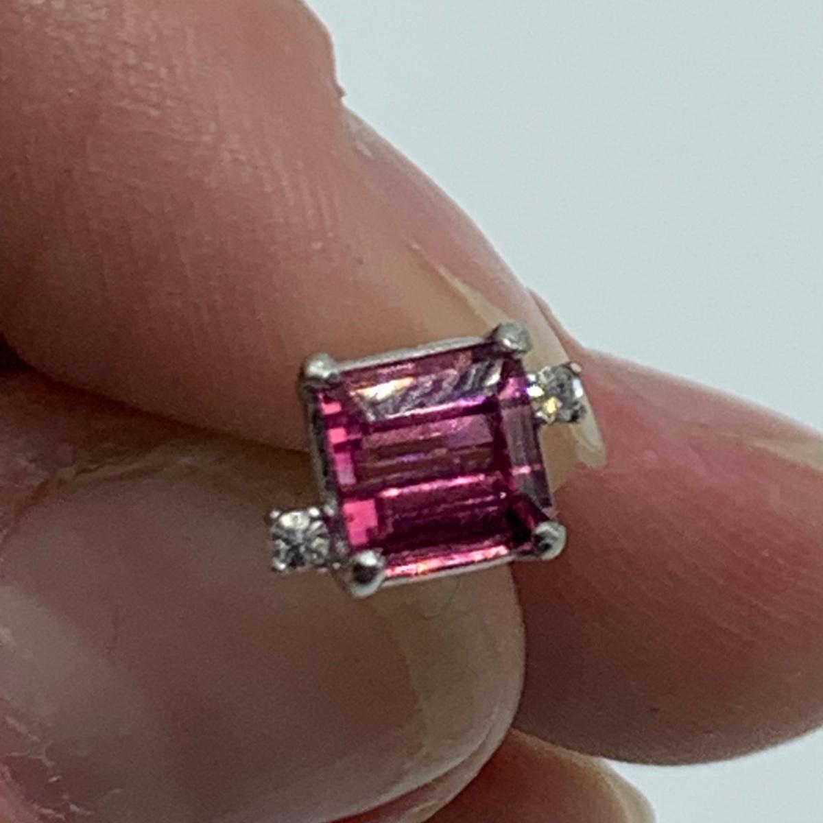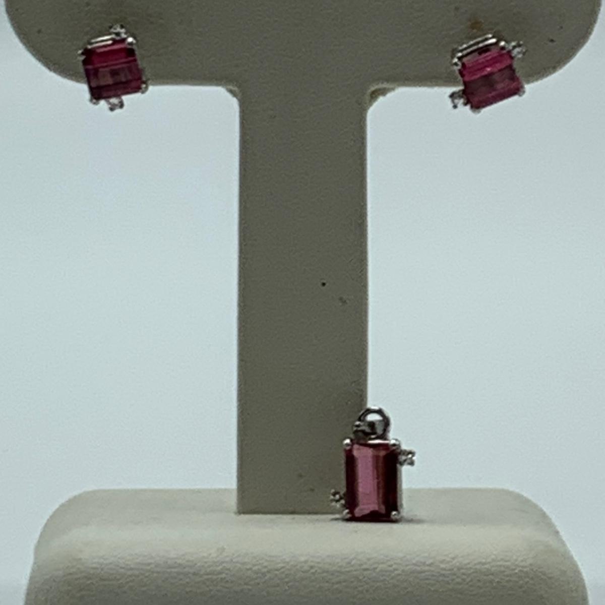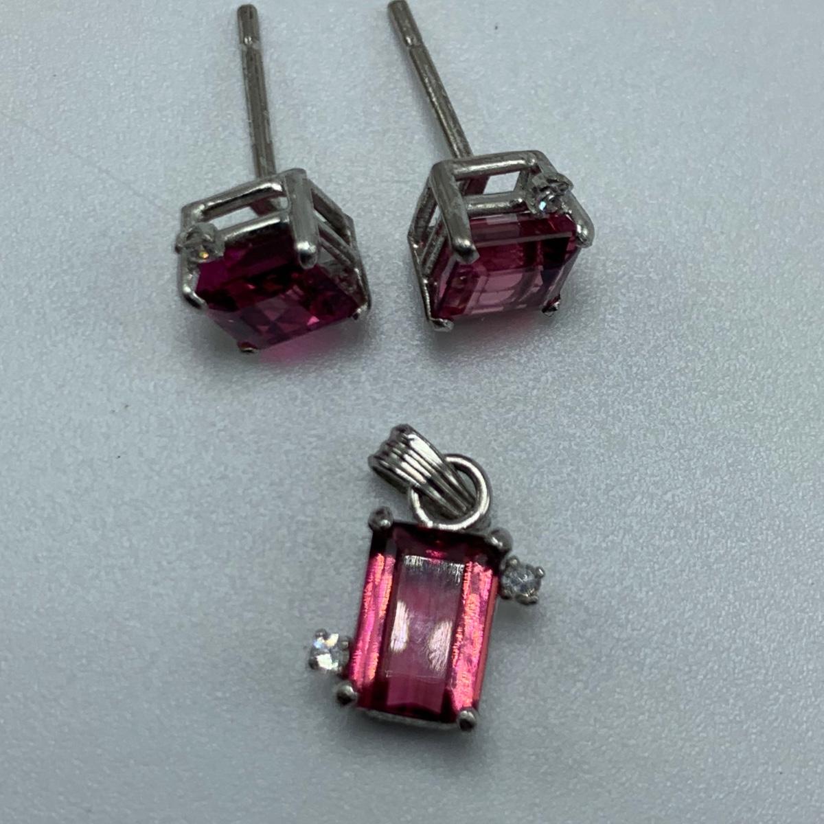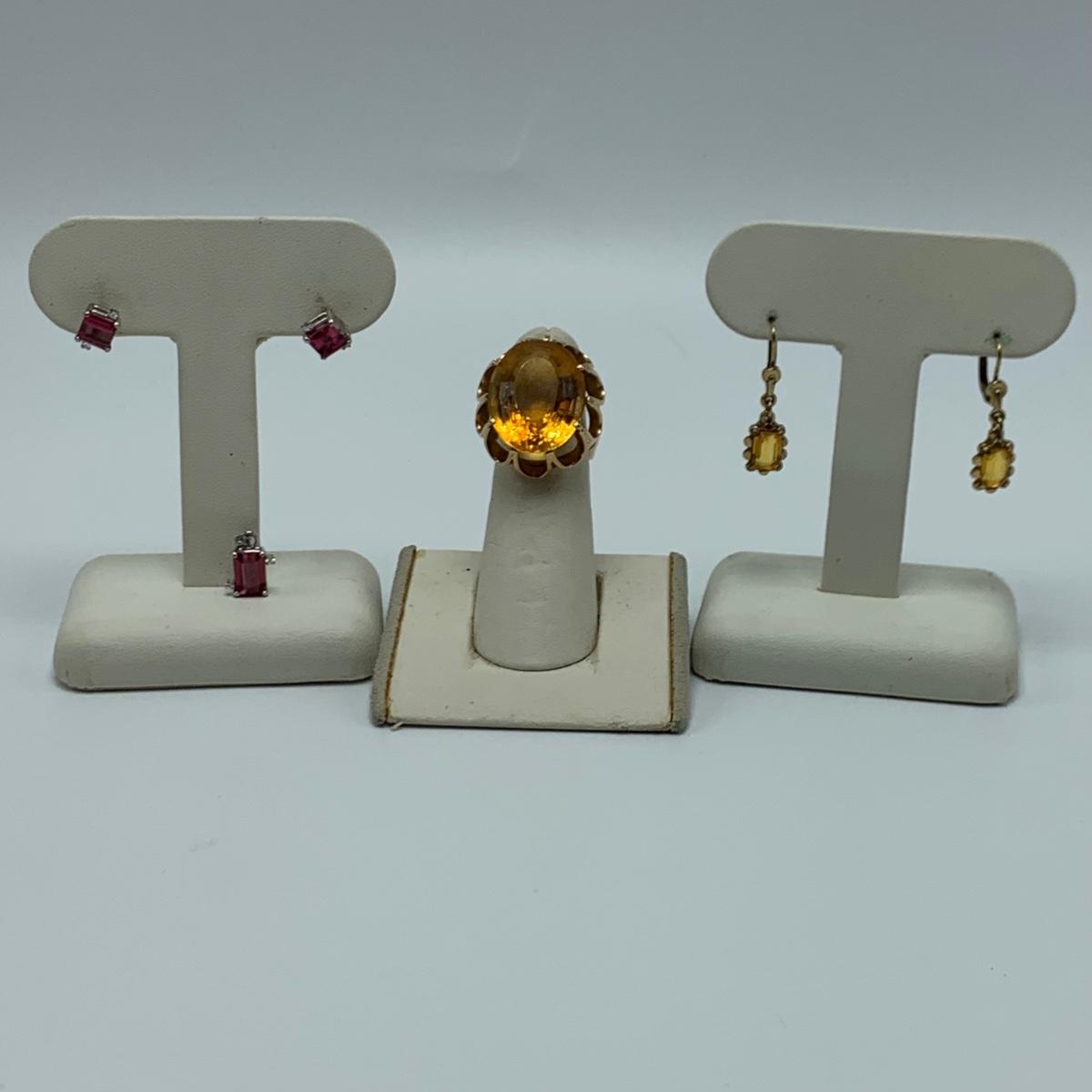 Two jewelry sets. One features a unique ring with a large citrine colored stone and matching earrings that are stamped 10K. The other set features a pendant and stud earrings with pink tourmaline colored gemstones adorned with tiny rhinestones on the sides. The earrings do not have backs. All sales are final. No returns or refunds. Please bid accordingly.