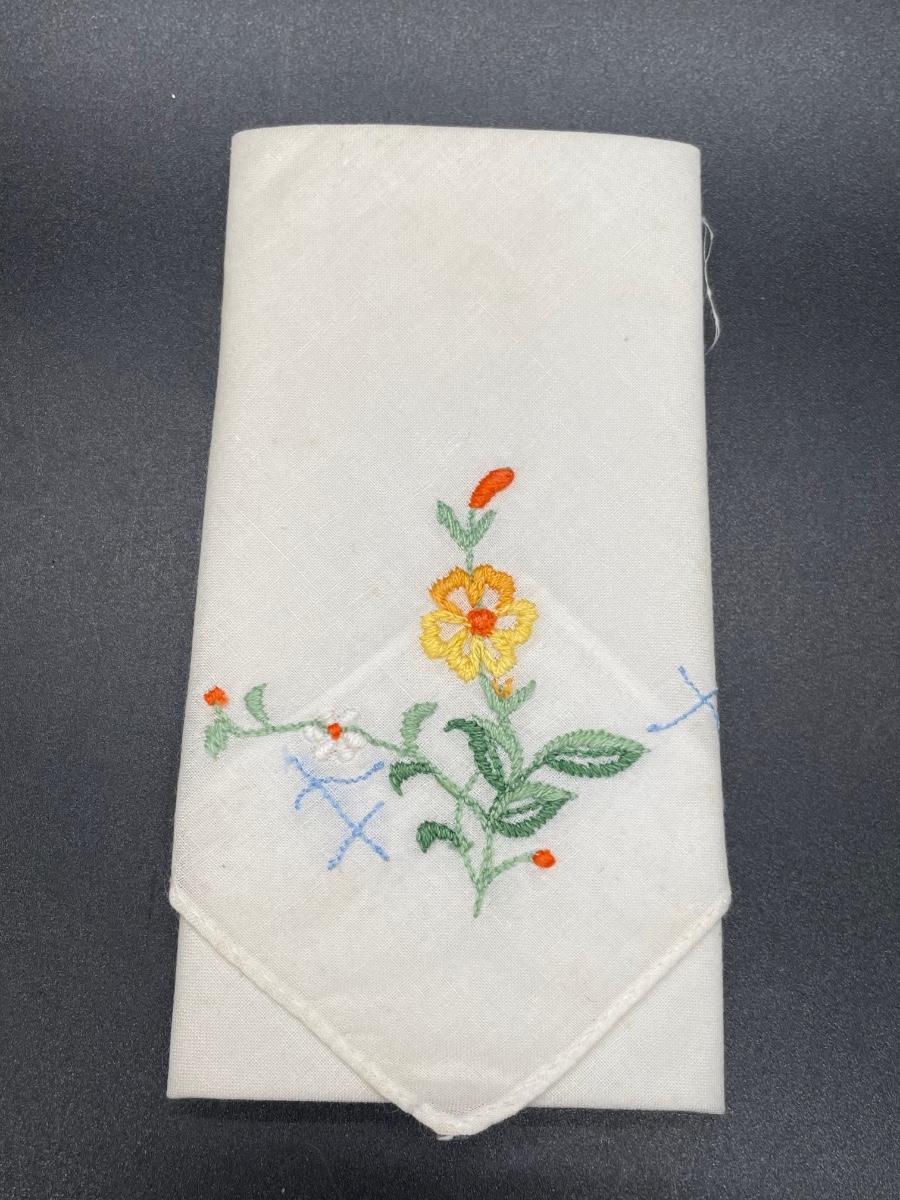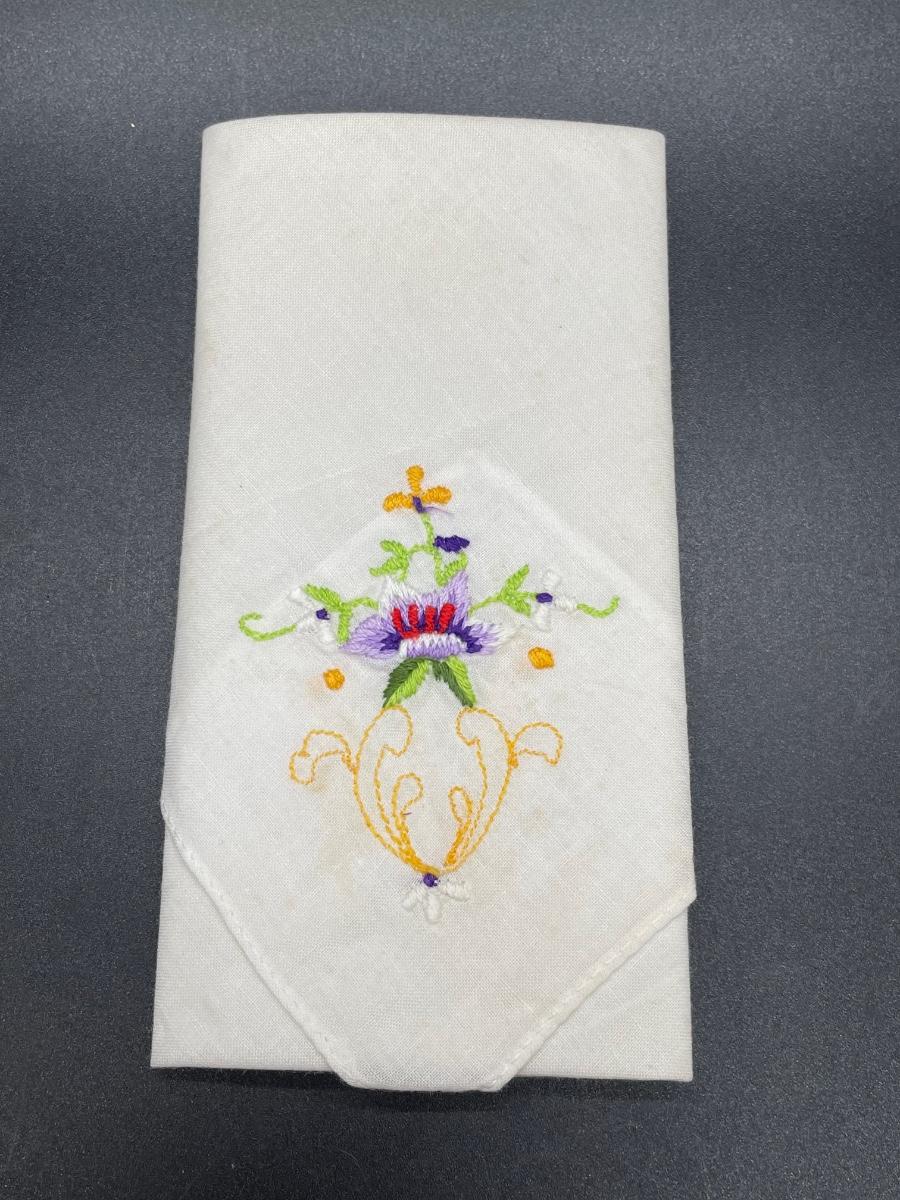 Both handkerchiefs included in this set are in good condition and come folded in it’s original packaging. Both of the white handkerchiefs are embroidered.
