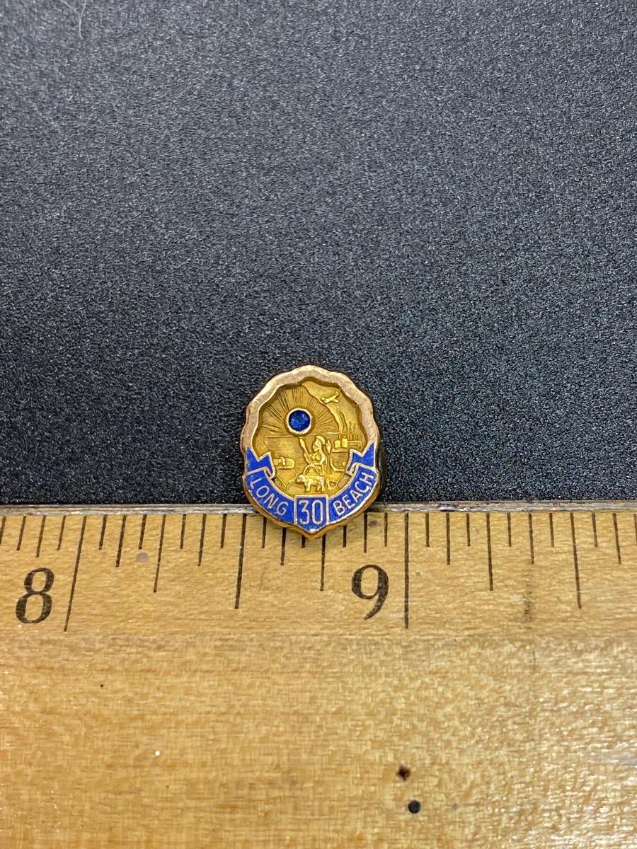 City of Long Beach, CA 30 year anniversary employee pin. Marked 10k on the back with a sapphire. Screw back. Pin weighs 1.8g without the back.