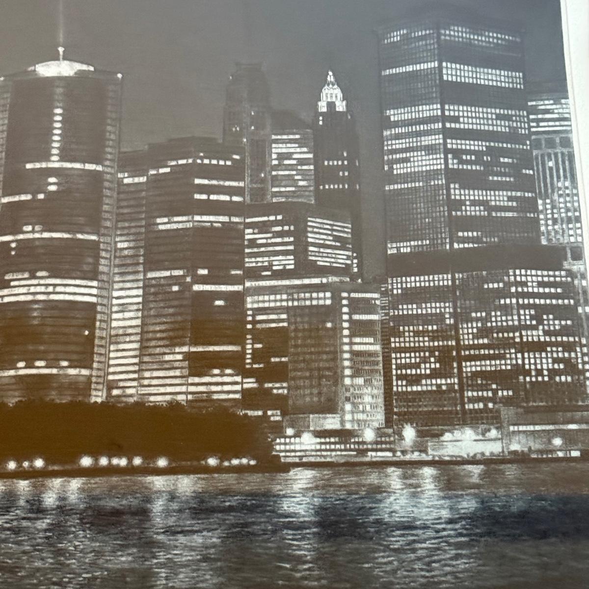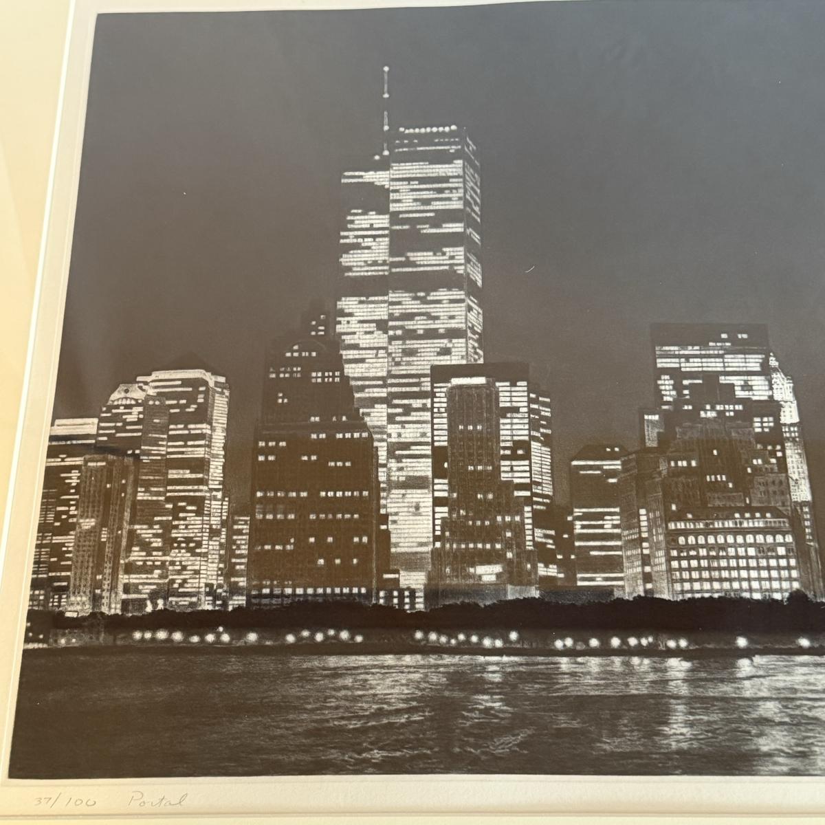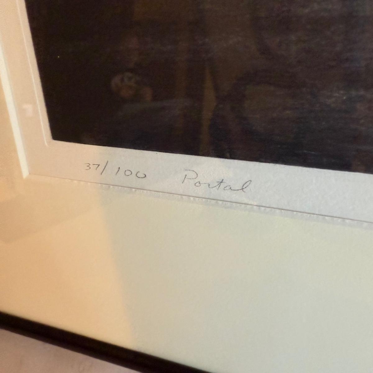An unusual print that appears to be a multi-city scape, perhaps a photograph that is etched. The medium is unclear but it does not appear to be a photograph exclusively. In the bottom left corner the writing reads “37/100 Portal” The bottom right writing is undecipherable other than the year “2000”. It is matted in a double white mat and a metal frame and measures 29.5” X 20”H.