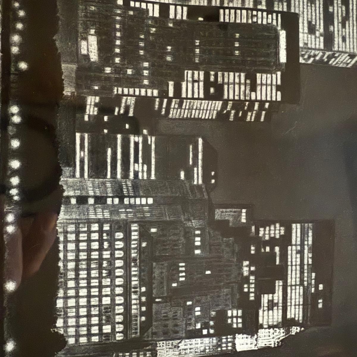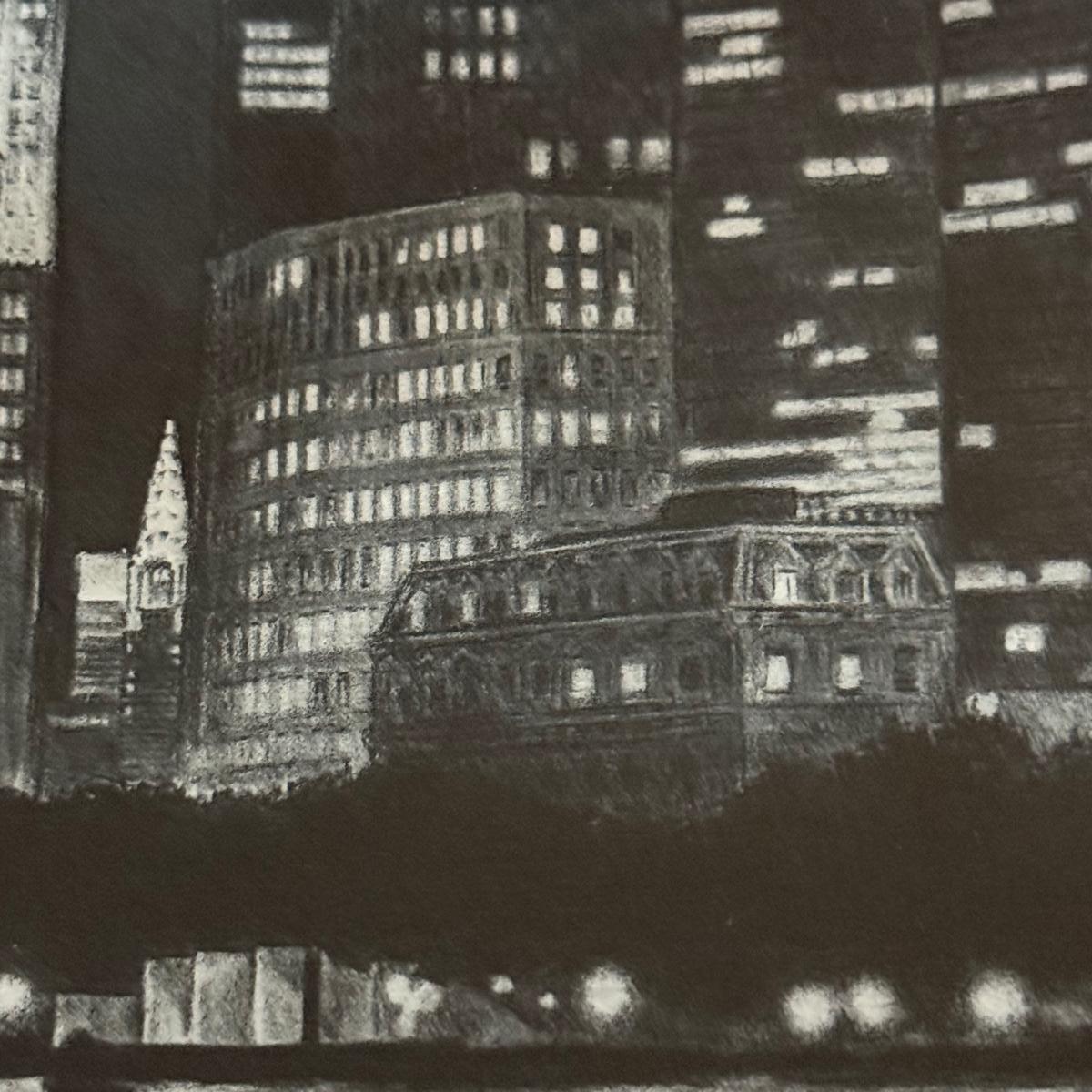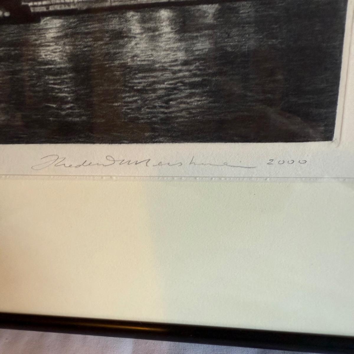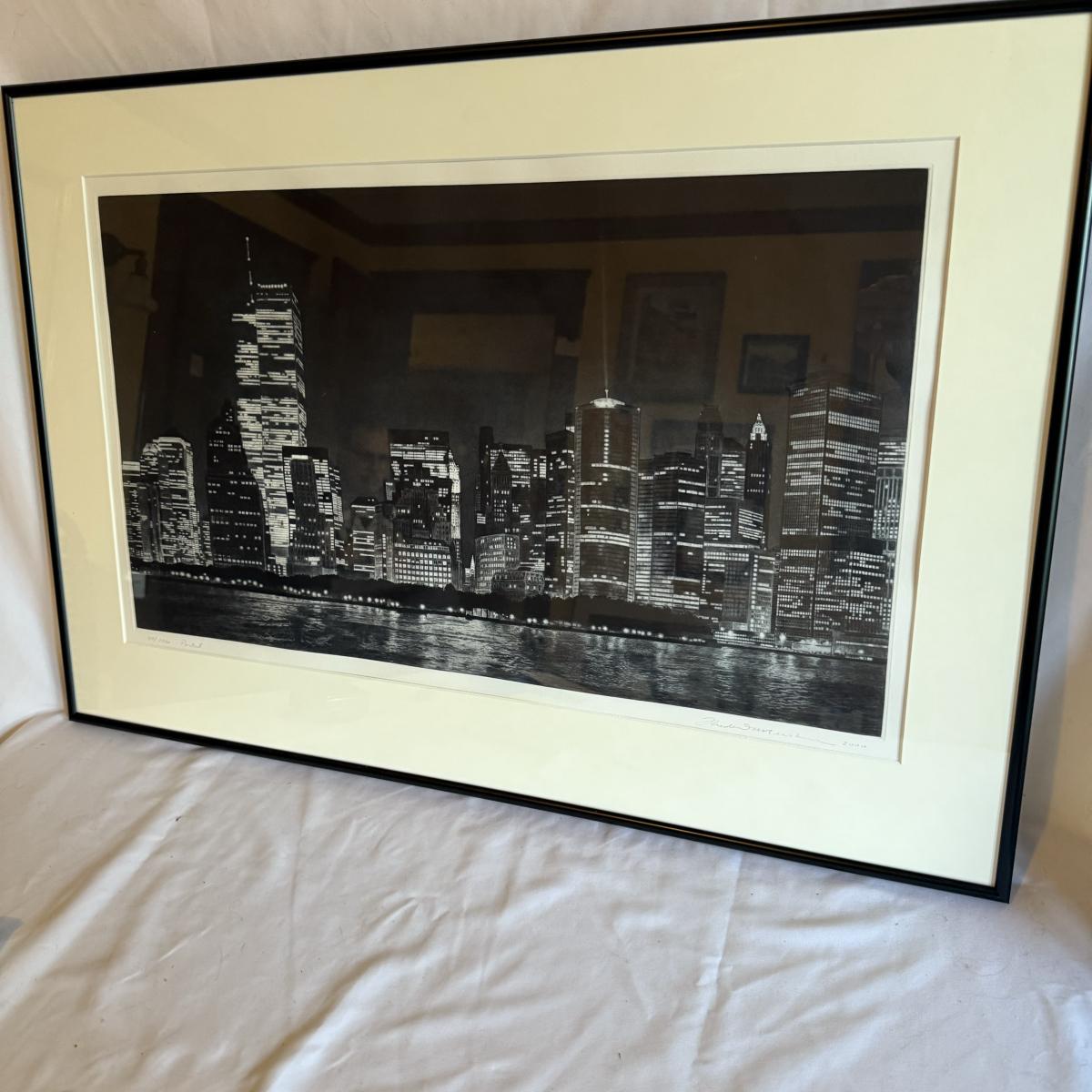 An unusual print that appears to be a multi-city scape, perhaps a photograph that is etched. The medium is unclear but it does not appear to be a photograph exclusively. In the bottom left corner the writing reads “37/100 Portal” The bottom right writing is undecipherable other than the year “2000”. It is matted in a double white mat and a metal frame and measures 29.5” X 20”H.