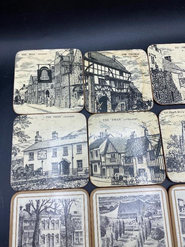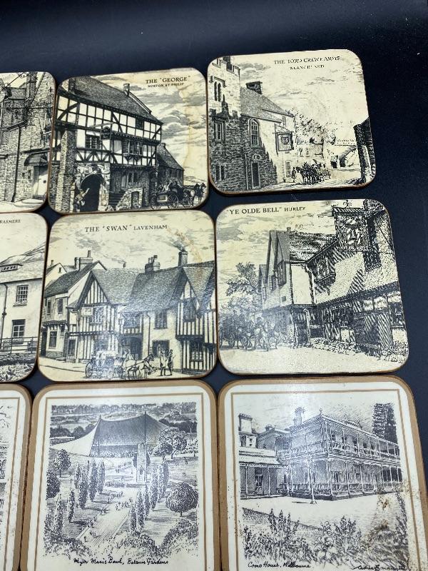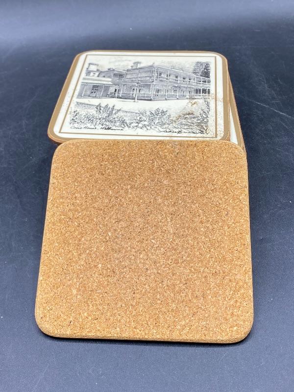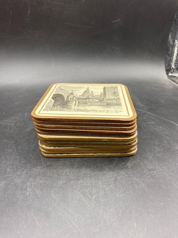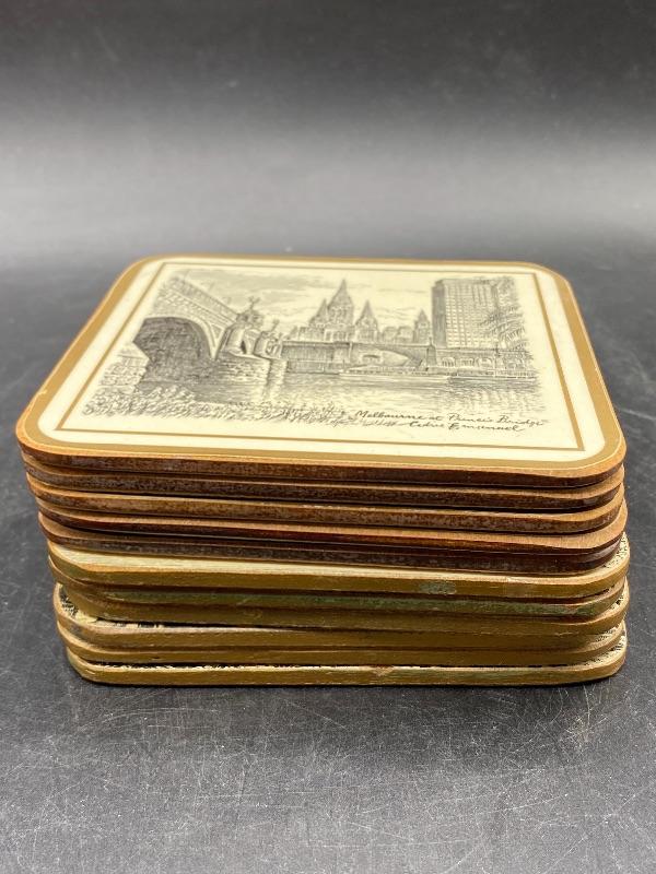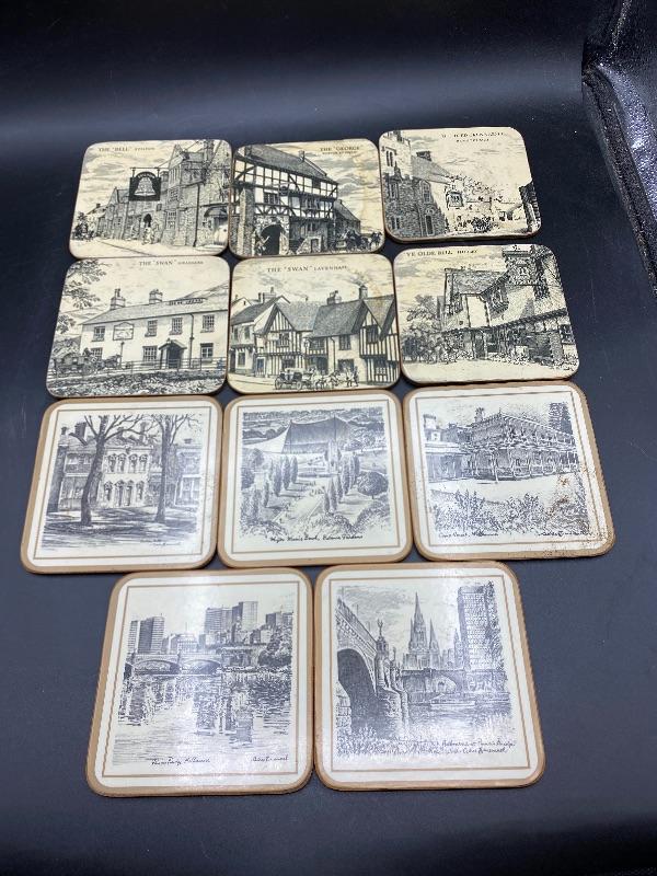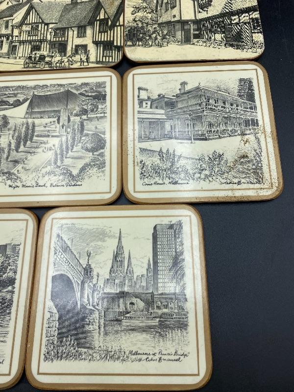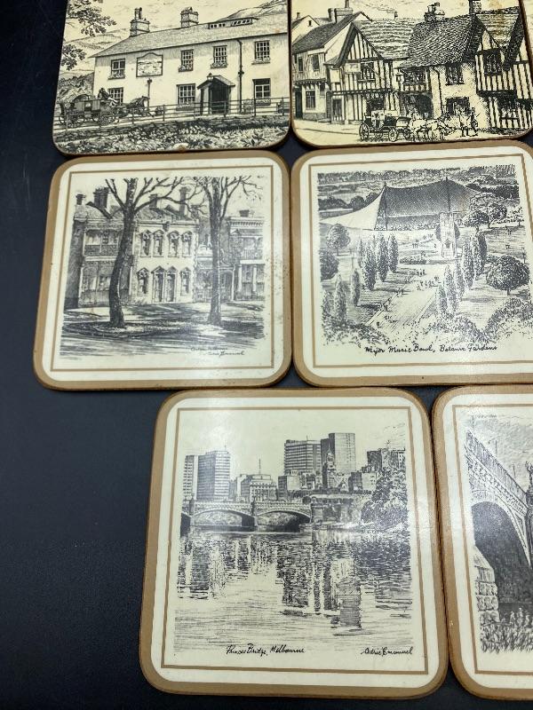 Cityscape sketch art drink coasters. Set of 11, all different. Good used condition. Cork back.