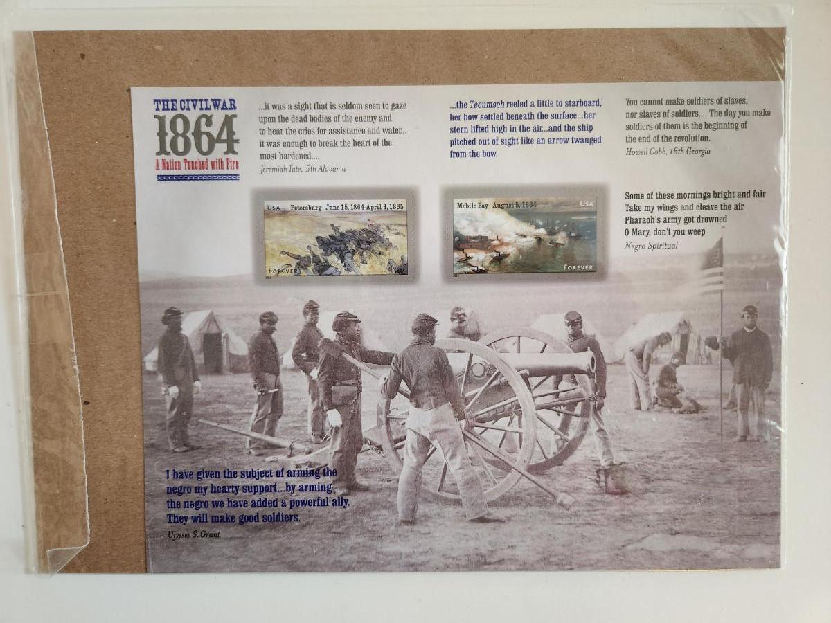 This auction lot is for a Civil War 1864 Commemorative Stamp Plate. These commemorative stamps were issued in 1994 to honor the years 1861 through 1864 of the Civil War. Each commemorative sheet has 2 stamps with 32 cents face value. These stamps and sheets are new, sealed in plastic, never opened in Mint NH condition. It is a great collectable for stamp or Civil War enthusiasts.