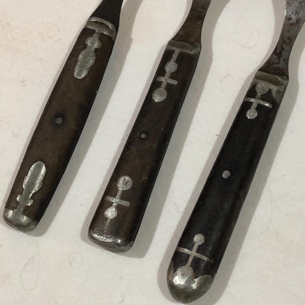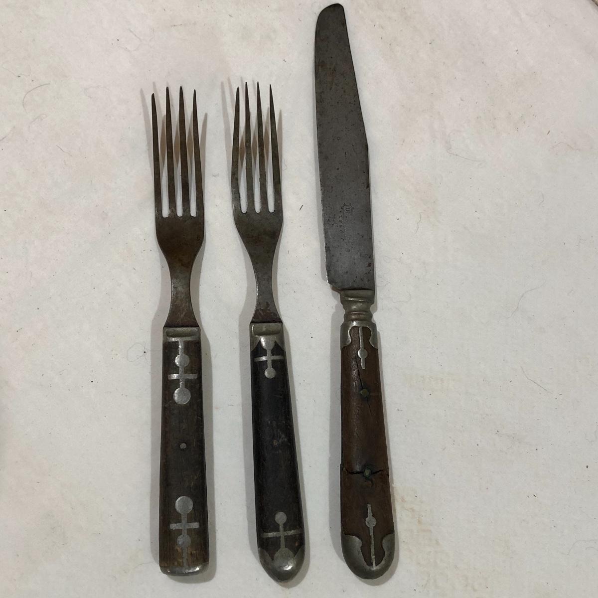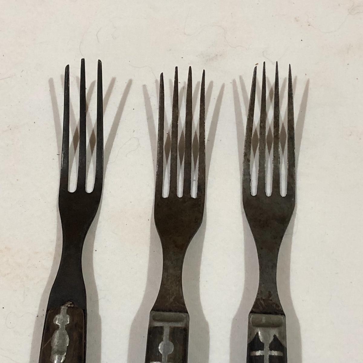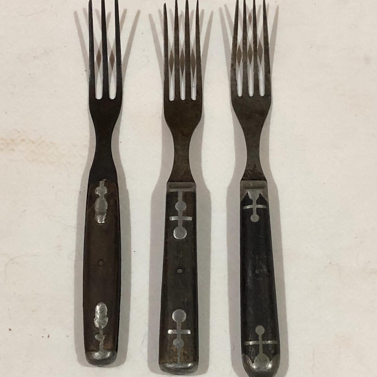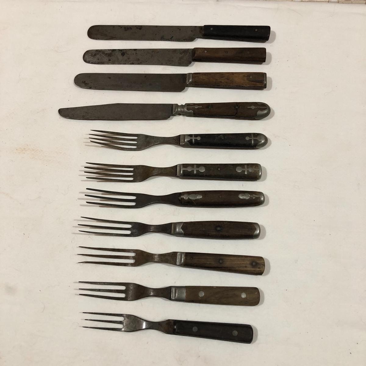 There are 12 items in this lot. The largest knife has two pins, is 13” long and is likely from the Civil War era. There are seven forks-some with antique and decorative pewter inlay. There are four knives - again one distinctively has antique and decorative pewter inlay and is marked “LFC”-Landers, Frary and Clarke. Handles are wood. Shipping Available.
