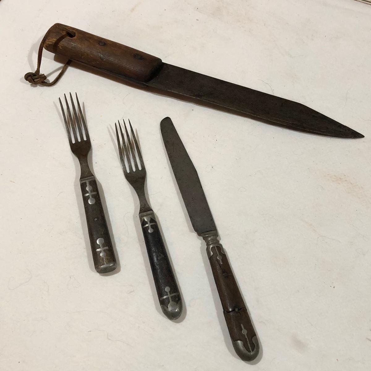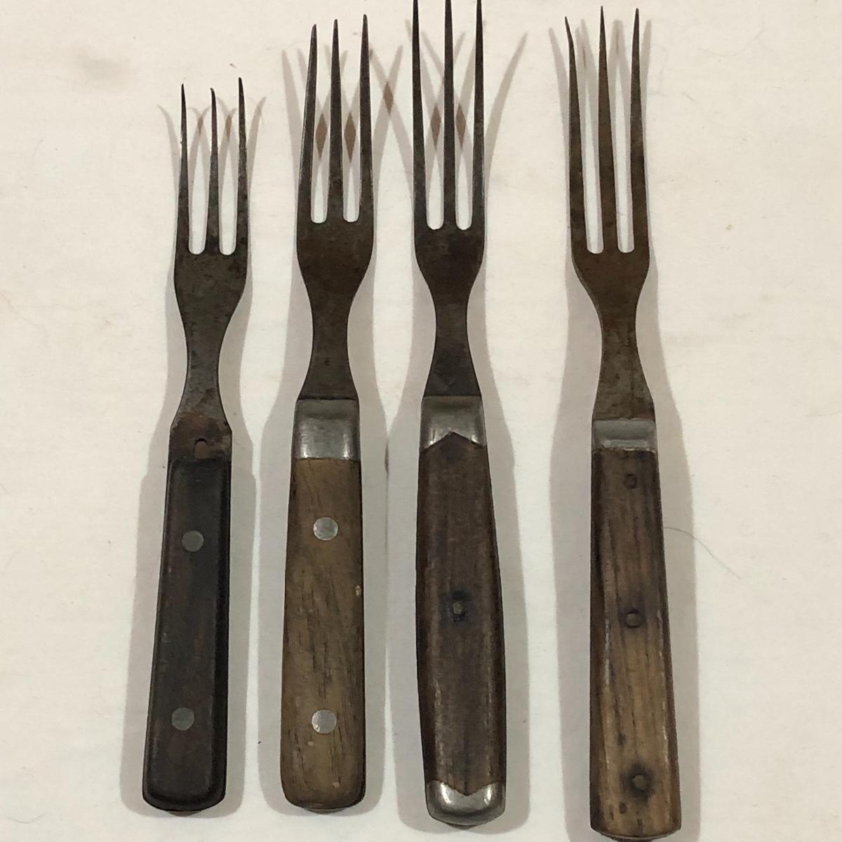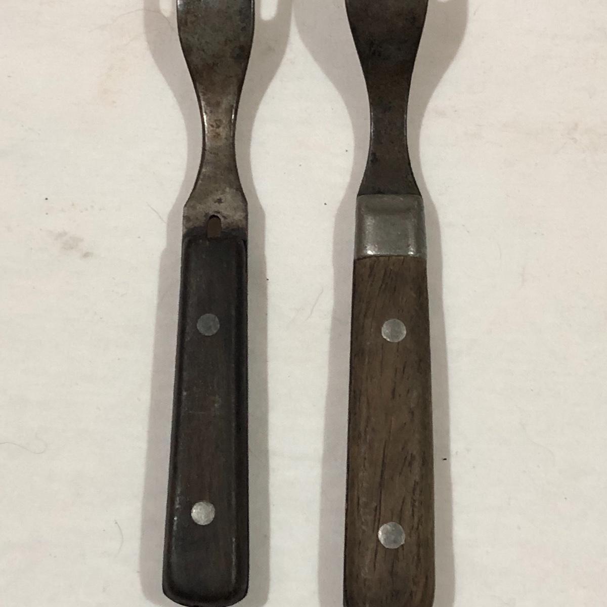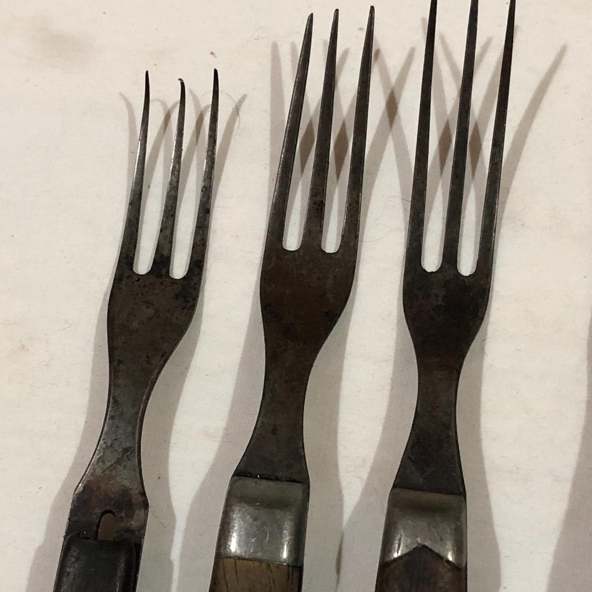 There are 12 items in this lot. The largest knife has two pins, is 13” long and is likely from the Civil War era. There are seven forks-some with antique and decorative pewter inlay. There are four knives - again one distinctively has antique and decorative pewter inlay and is marked “LFC”-Landers, Frary and Clarke. Handles are wood. Shipping Available.