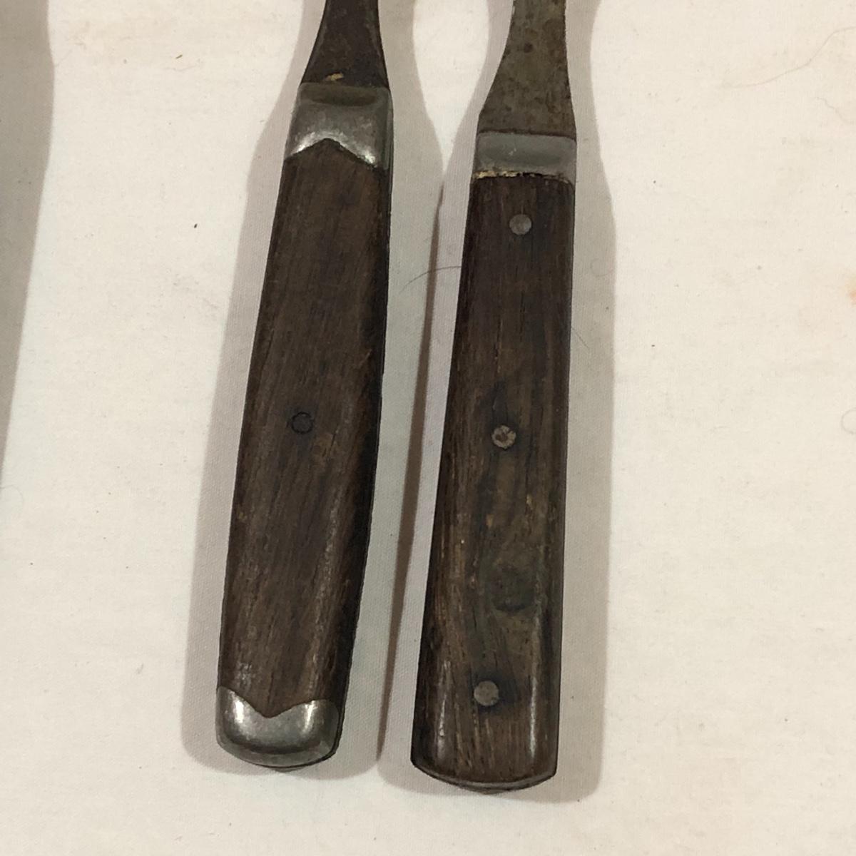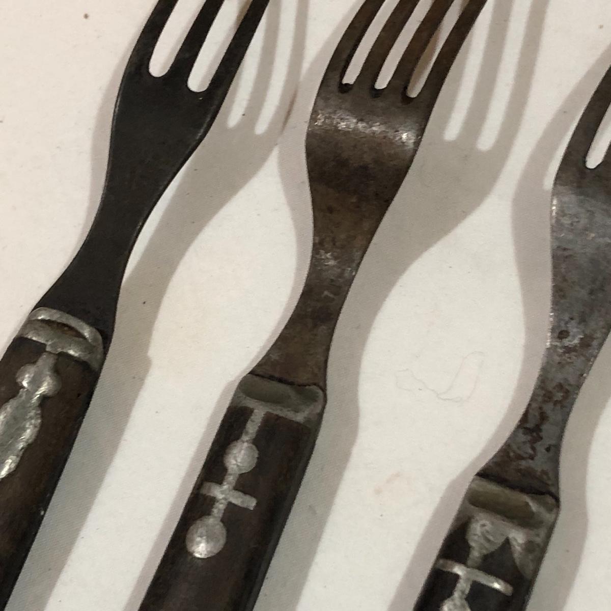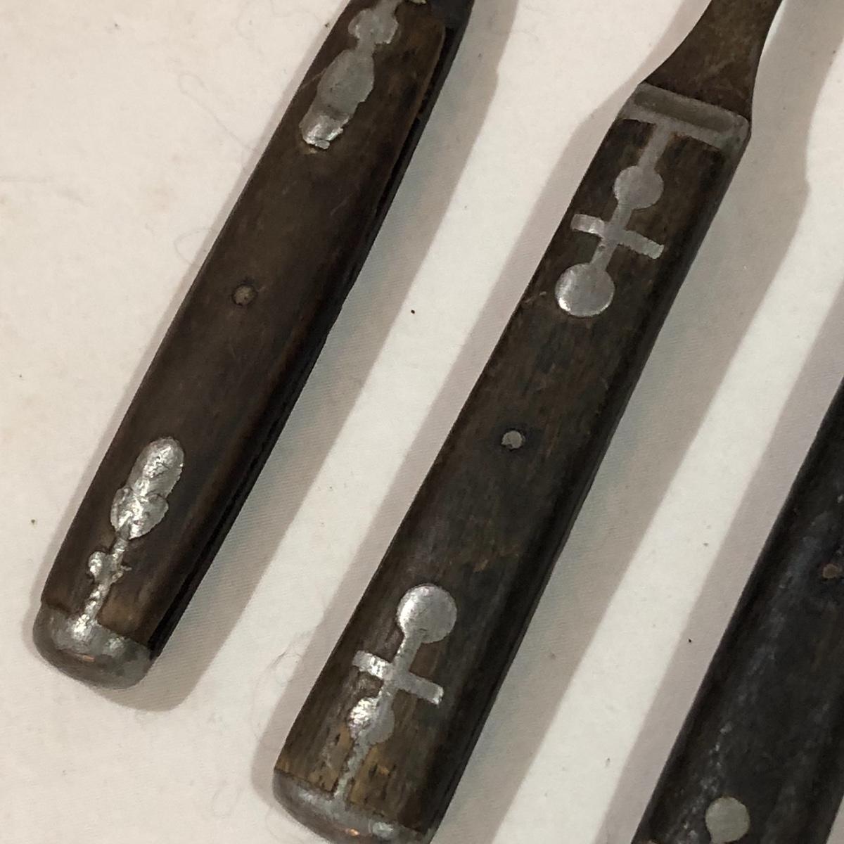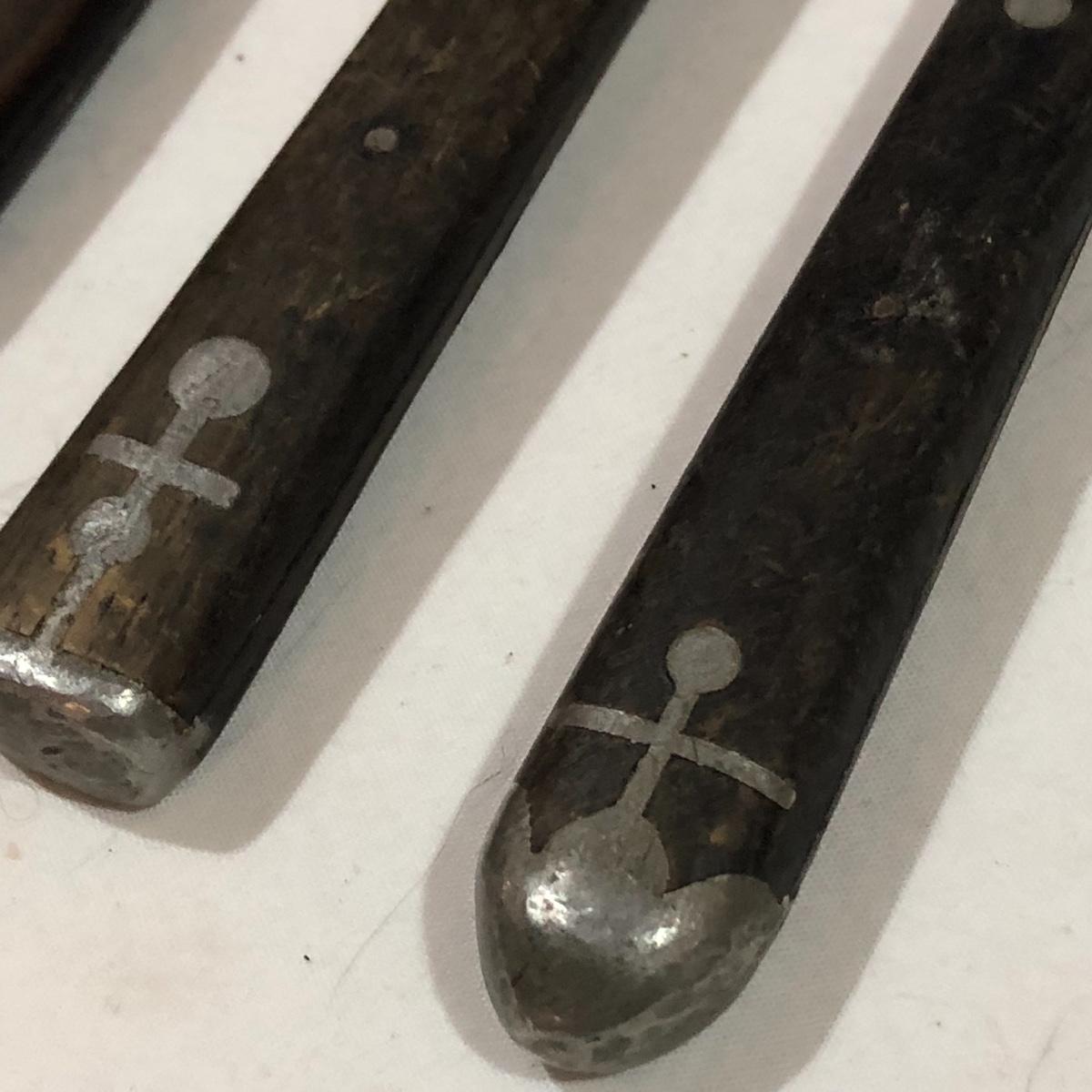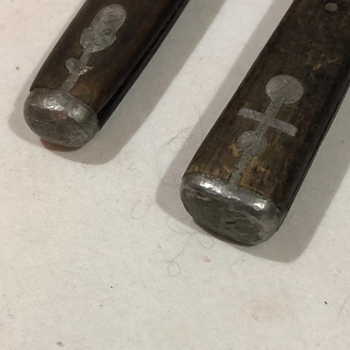 There are 12 items in this lot. The largest knife has two pins, is 13” long and is likely from the Civil War era. There are seven forks-some with antique and decorative pewter inlay. There are four knives - again one distinctively has antique and decorative pewter inlay and is marked “LFC”-Landers, Frary and Clarke. Handles are wood. Shipping Available.