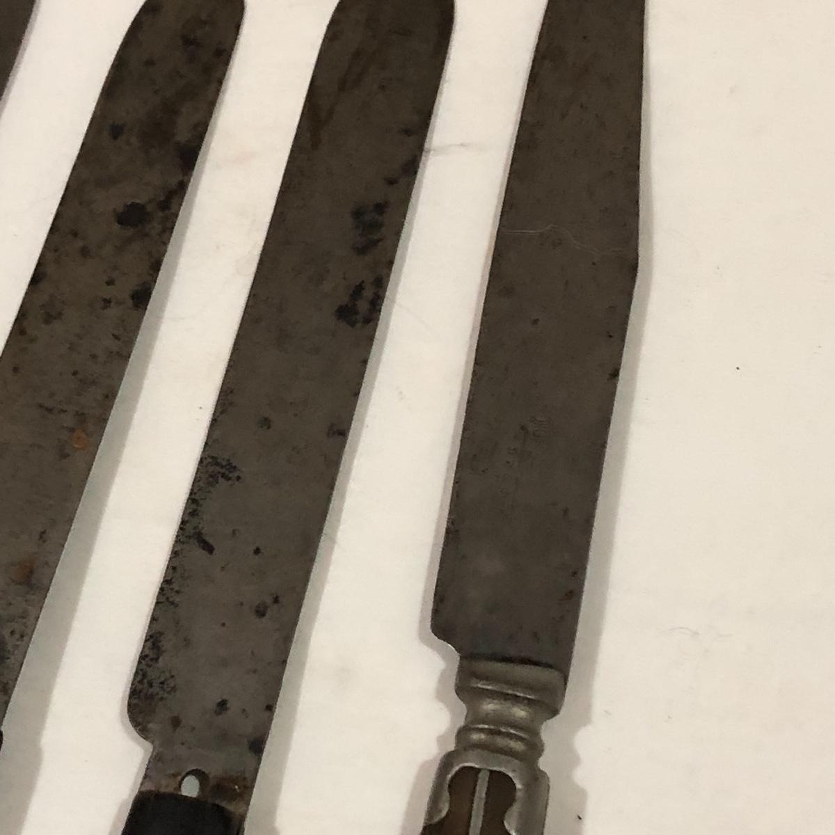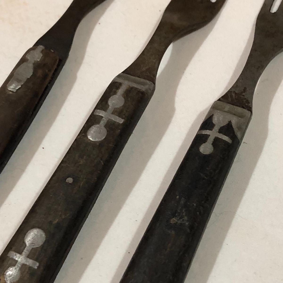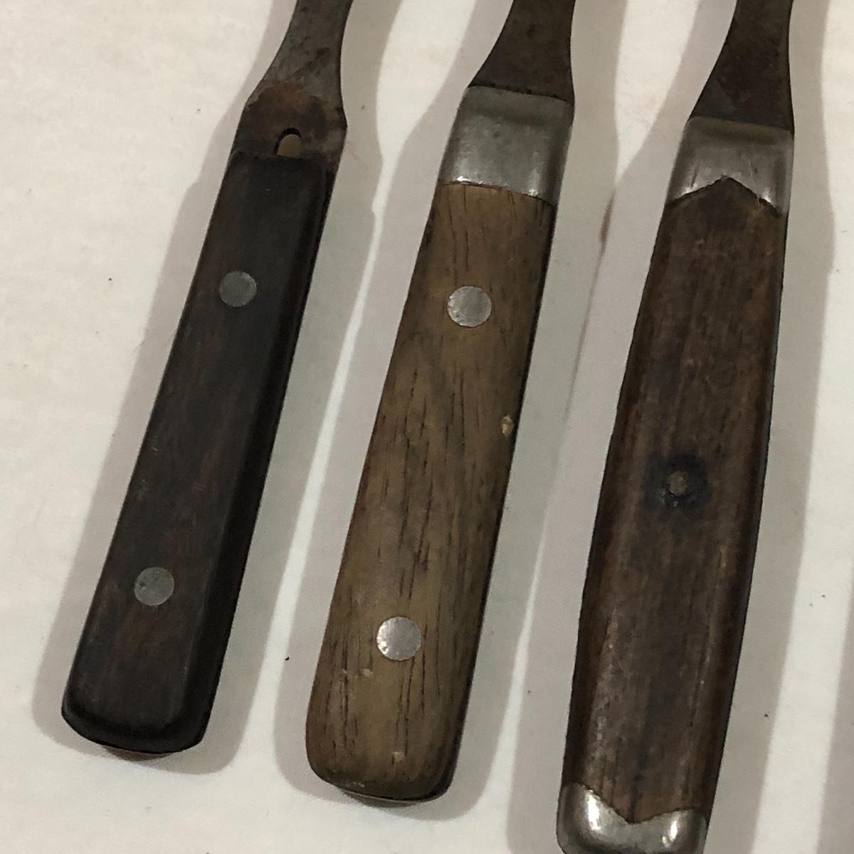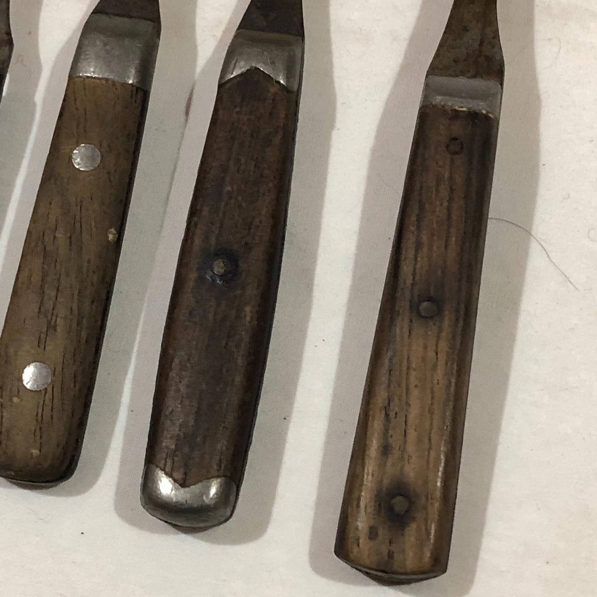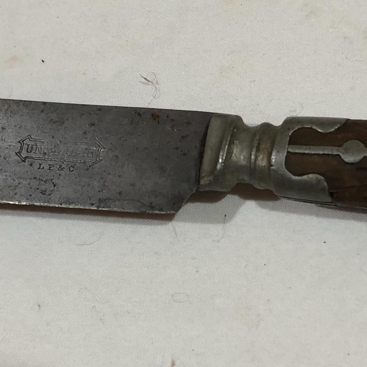 There are 12 items in this lot. The largest knife has two pins, is 13” long and is likely from the Civil War era. There are seven forks-some with antique and decorative pewter inlay. There are four knives - again one distinctively has antique and decorative pewter inlay and is marked “LFC”-Landers, Frary and Clarke. Handles are wood. Shipping Available.