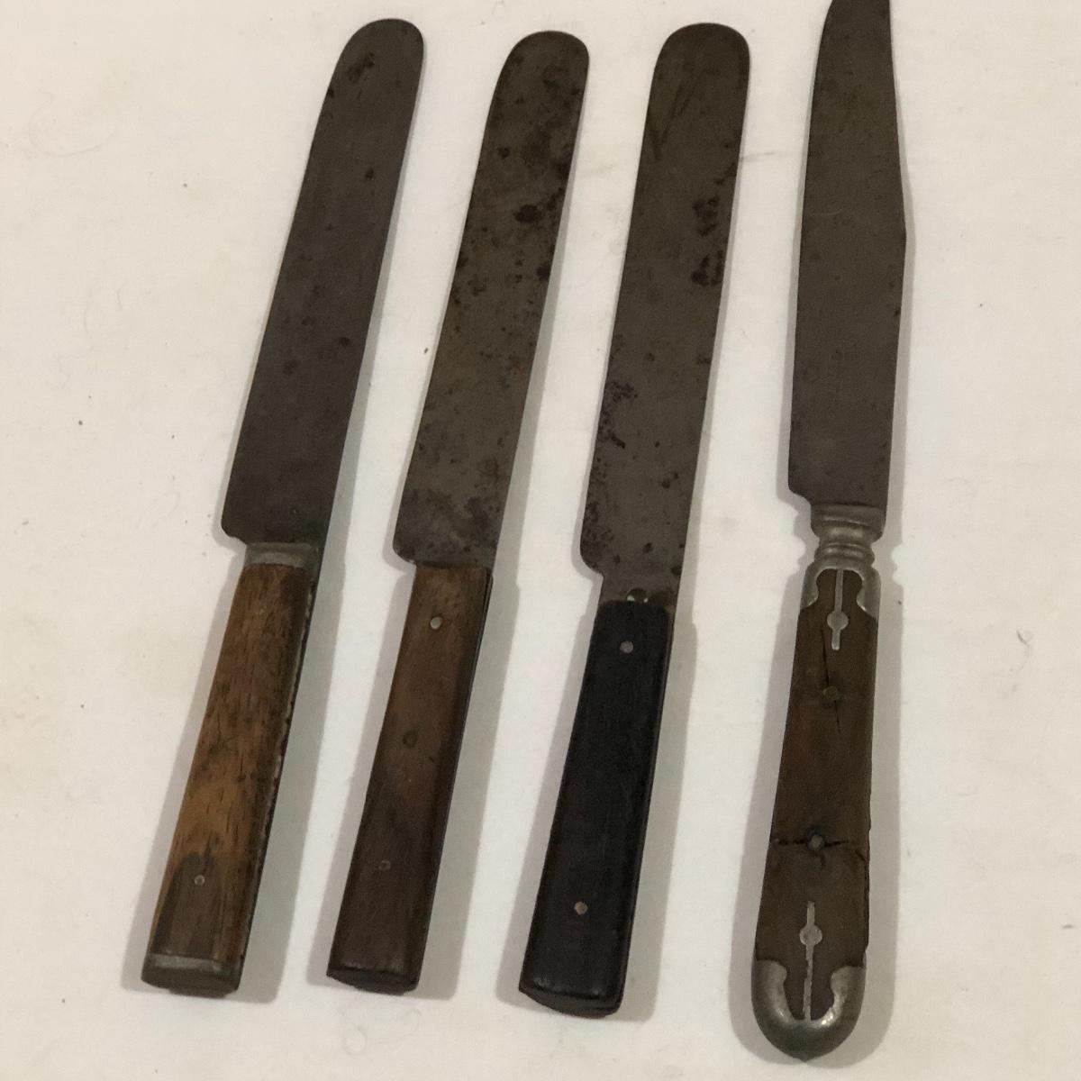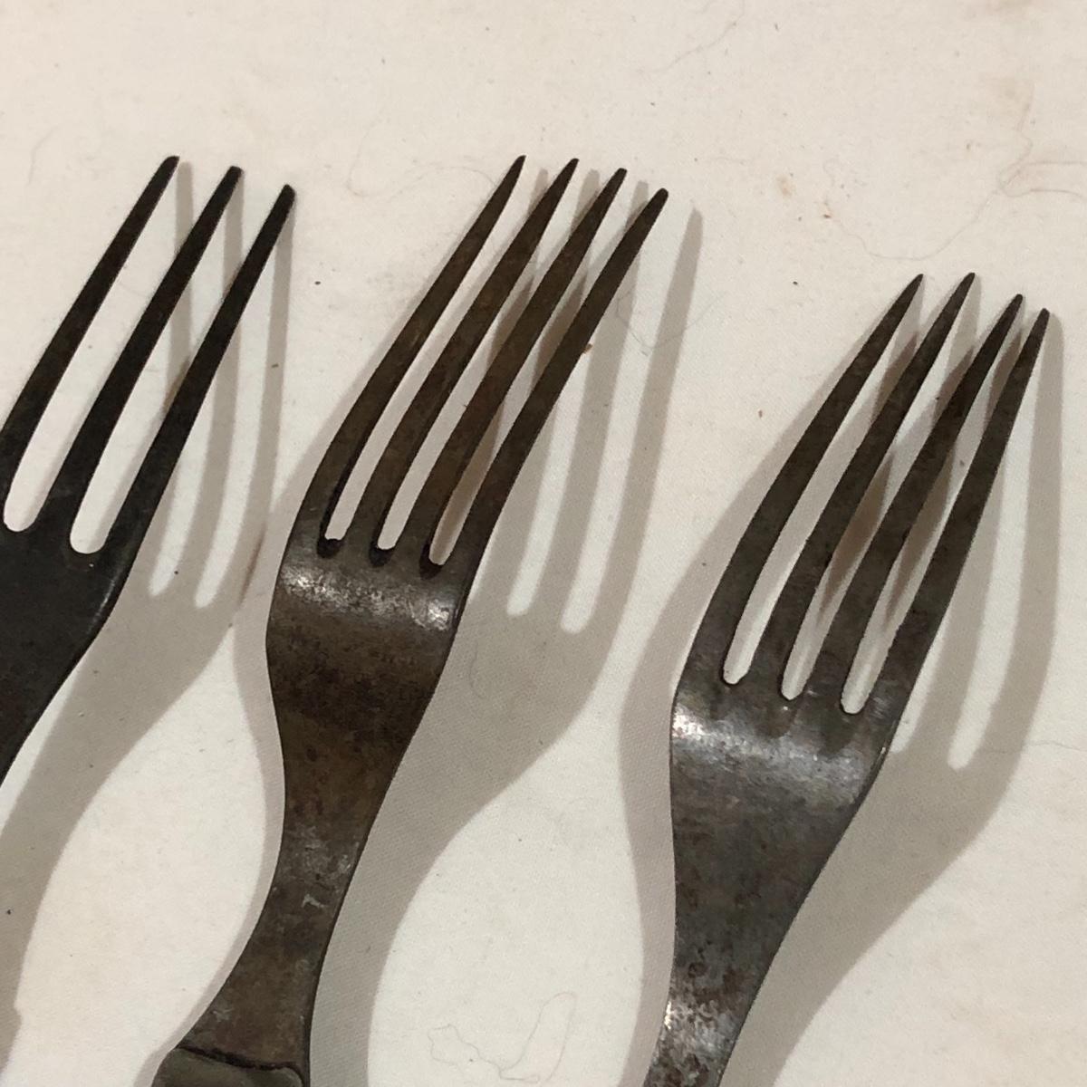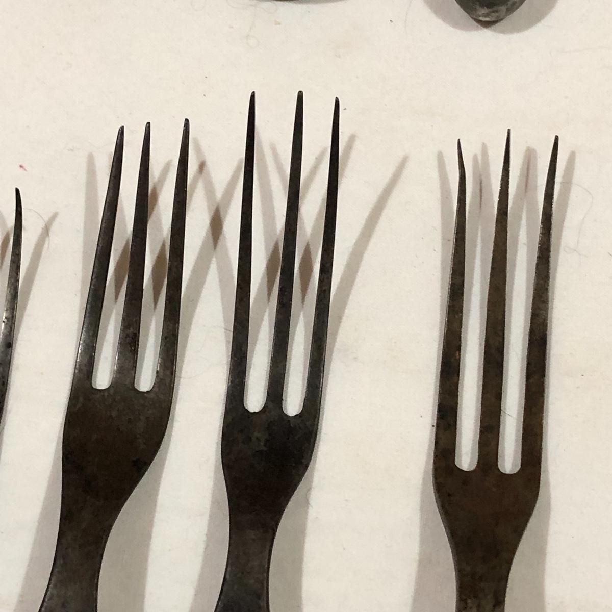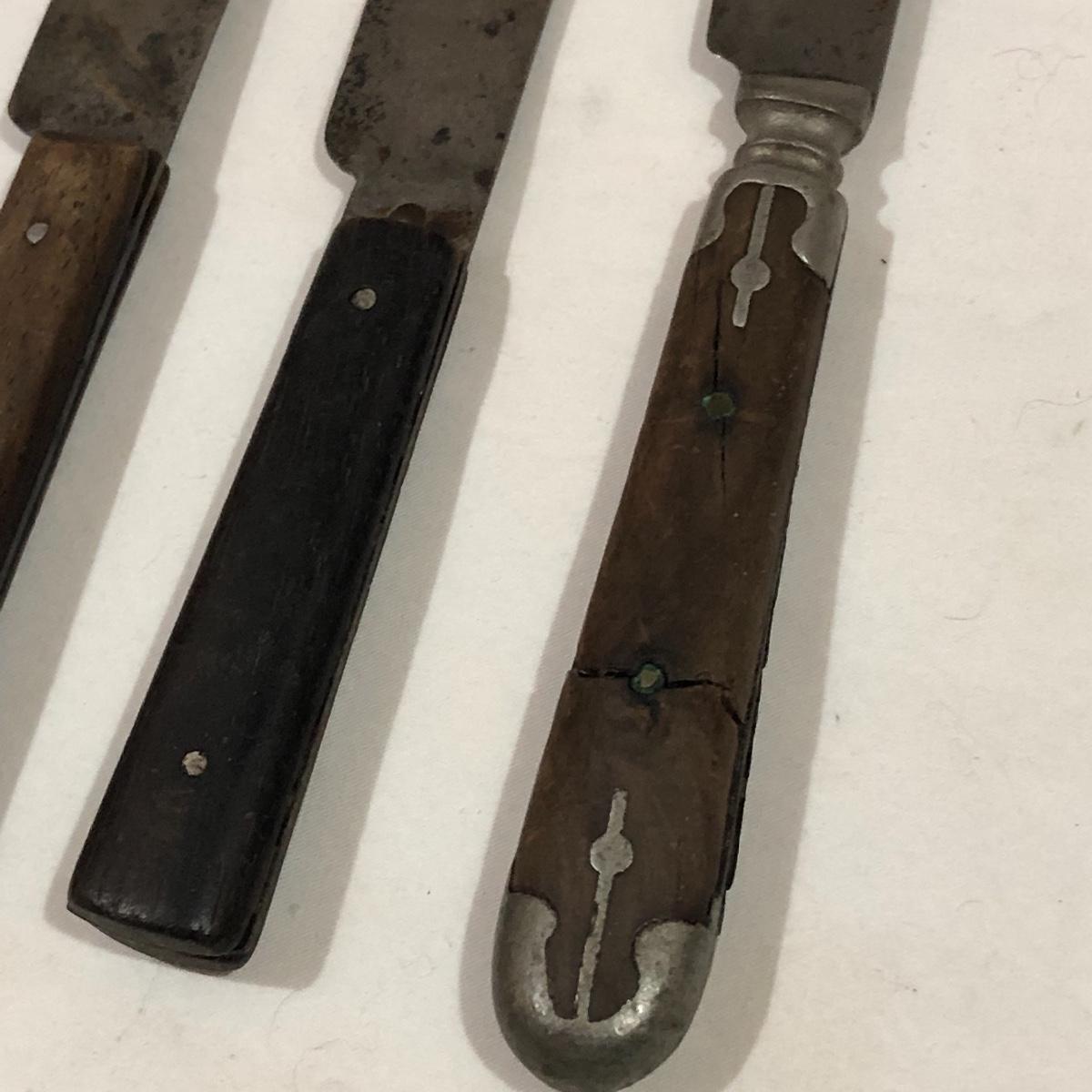There are 12 items in this lot. The largest knife has two pins, is 13” long and is likely from the Civil War era. There are seven forks-some with antique and decorative pewter inlay. There are four knives - again one distinctively has antique and decorative pewter inlay and is marked “LFC”-Landers, Frary and Clarke. Handles are wood. Shipping Available.