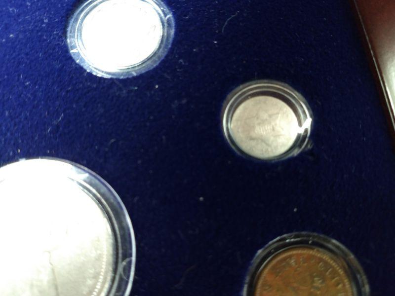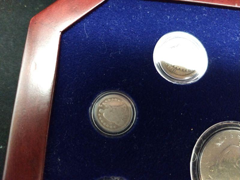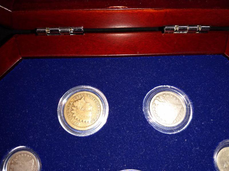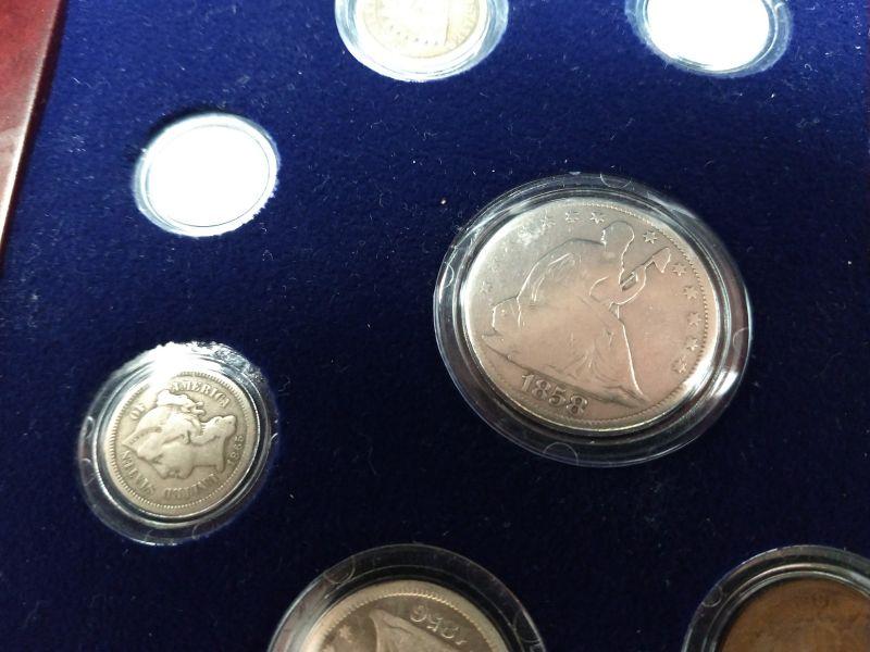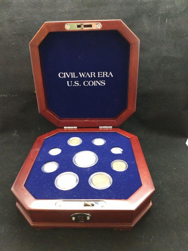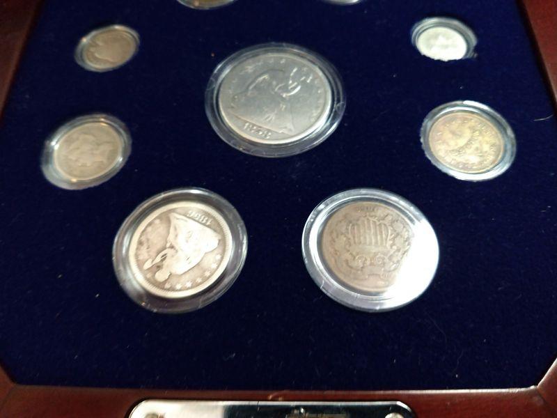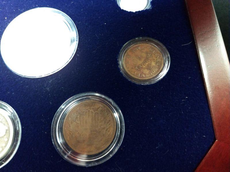 Civil War Era Silver and Copper Coin 8 Piece Set in Mahogany Wood Case