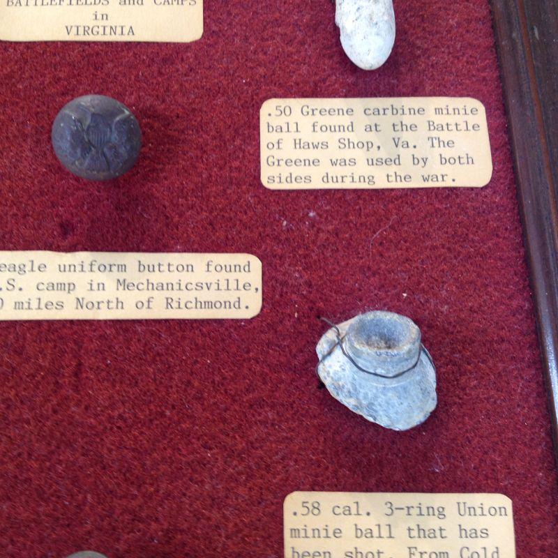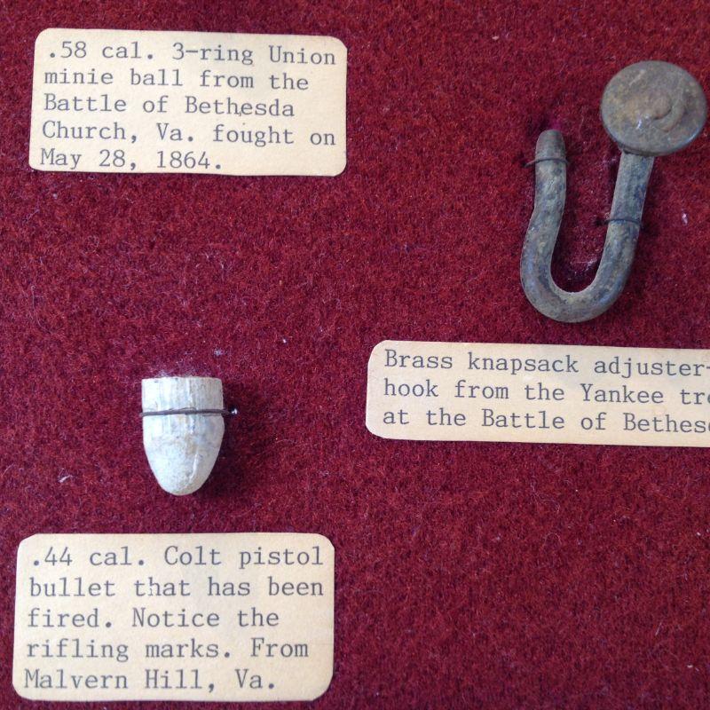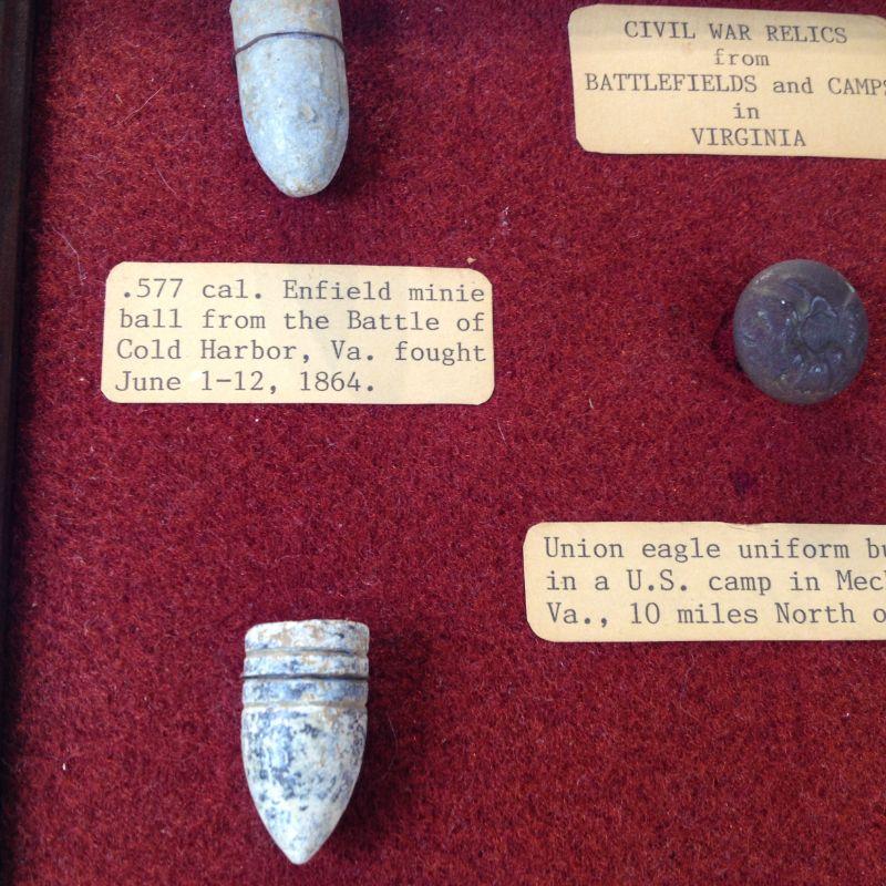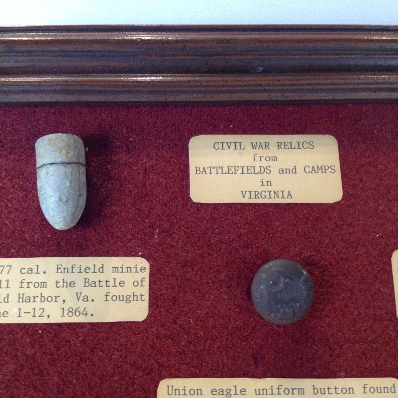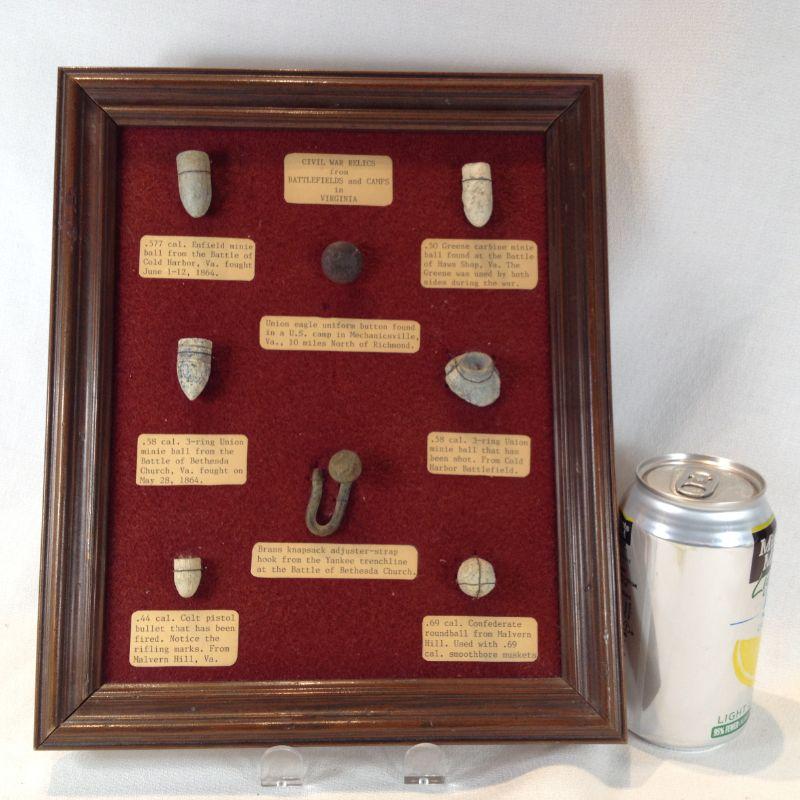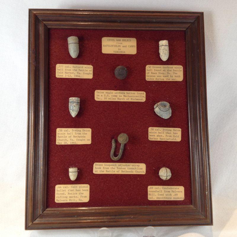 This lot is for a wonderful Collection of Civil War Relics. It is a very nicely framed display of Civil War Relics gathered from the battlefields and camps of Virginia. Contains minnies, balls and a piece from a knapsack. In very good condition and ready to hang. From the Ft. Lauderdale estate whose family origins were in Virginia - these are authentic relics. The starting/reserve bid on this item is $50.00.