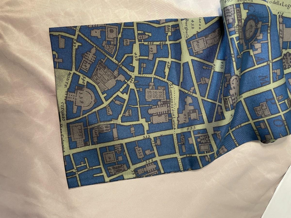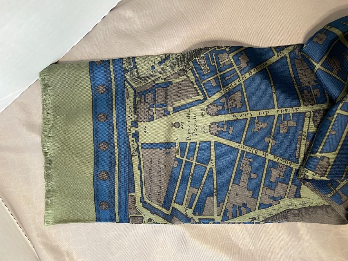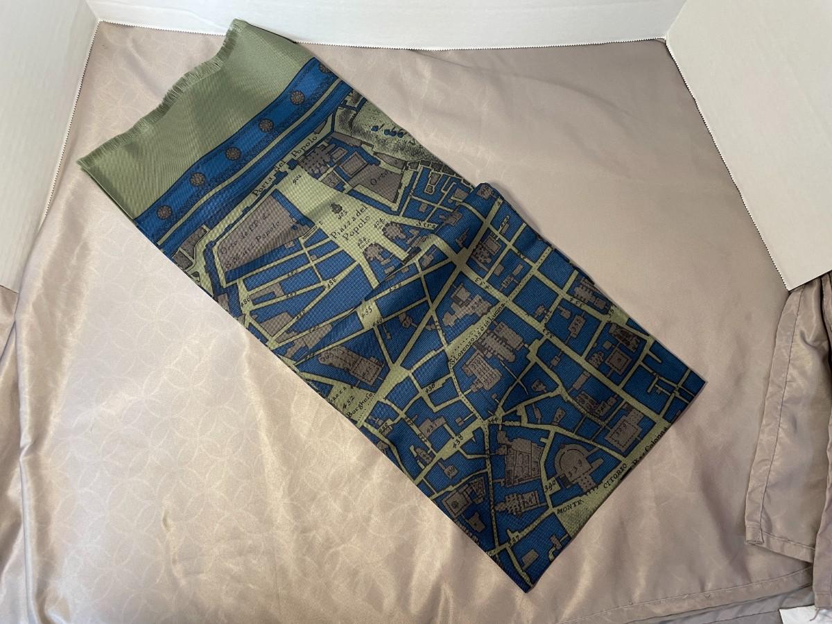 This beautiful scarf is about 55 inches long and about 8 inches wide. It is in the original packaging and never been used.