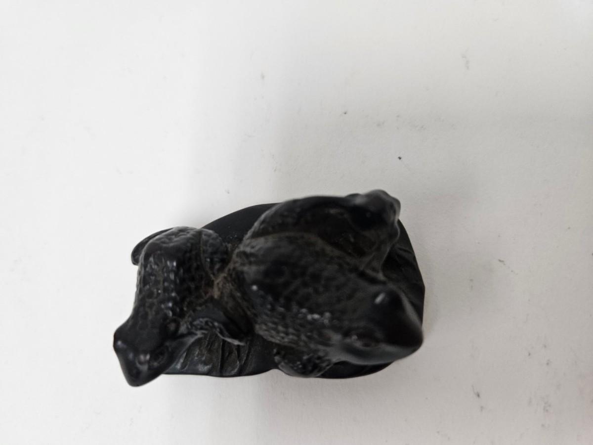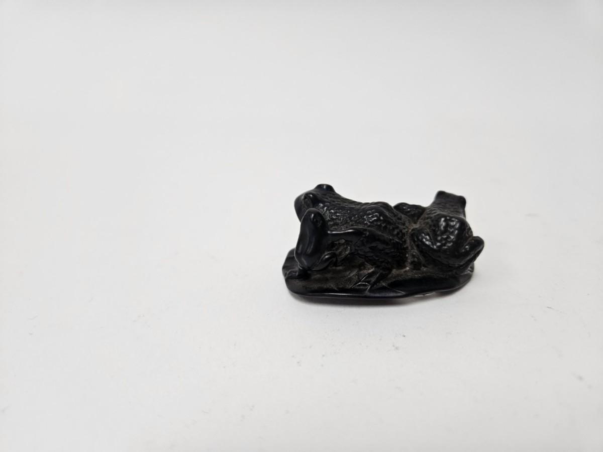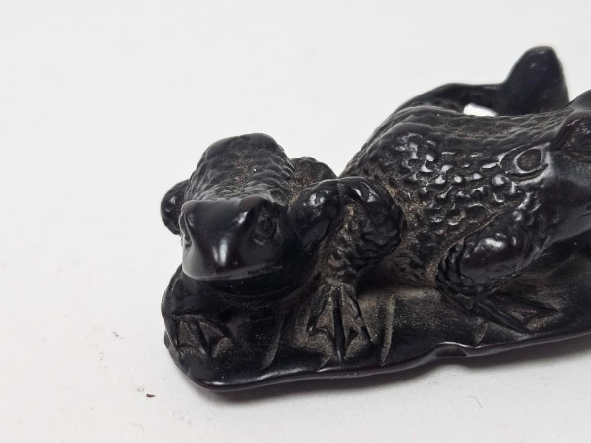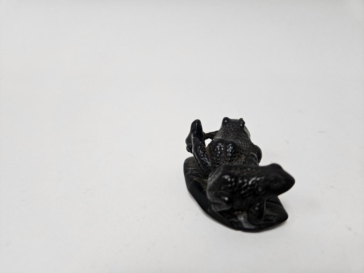 CKEG01. Vintage Carved Japanese Netsuke Bead, Ebonwood, Frogs on Leaf