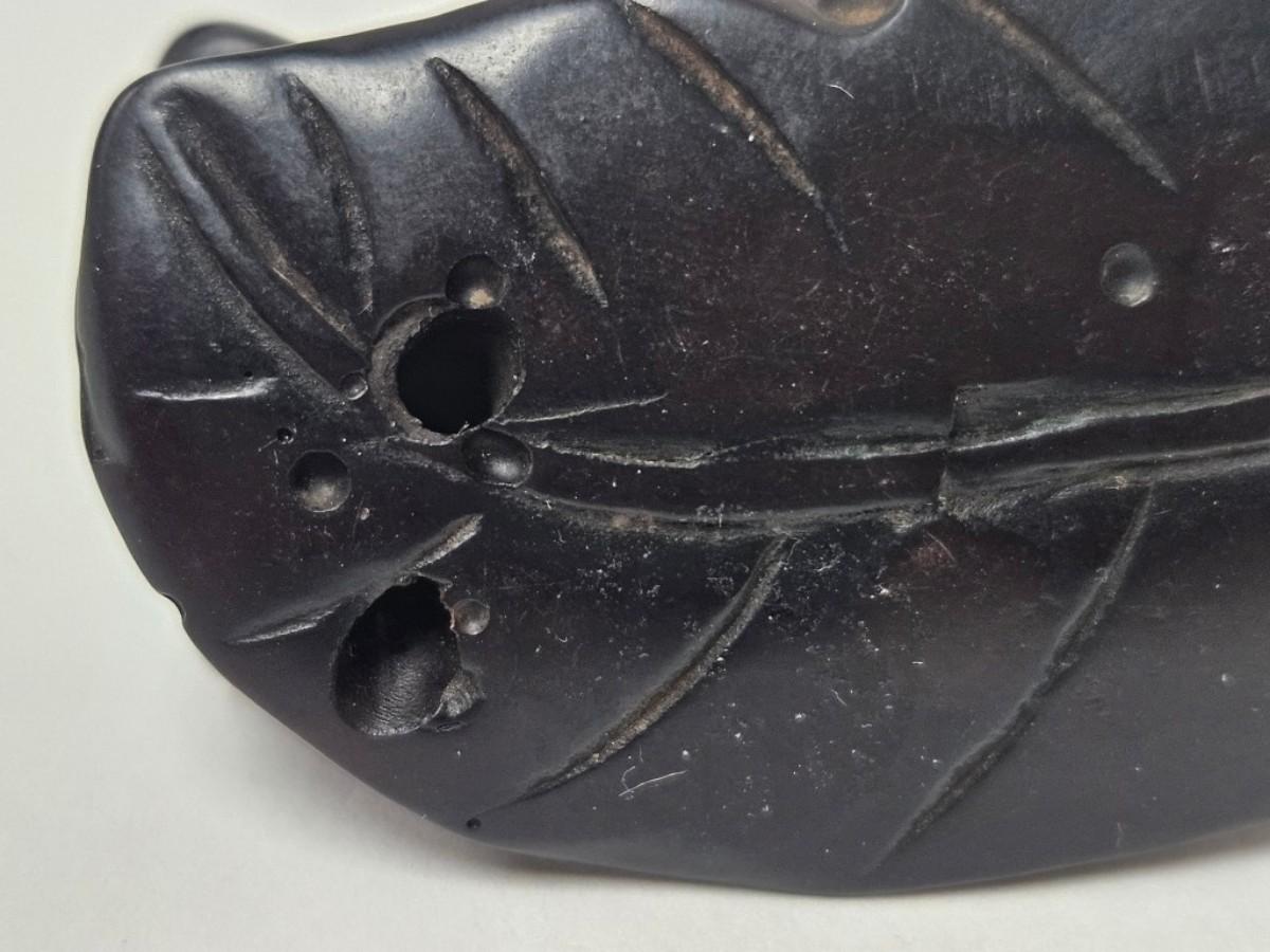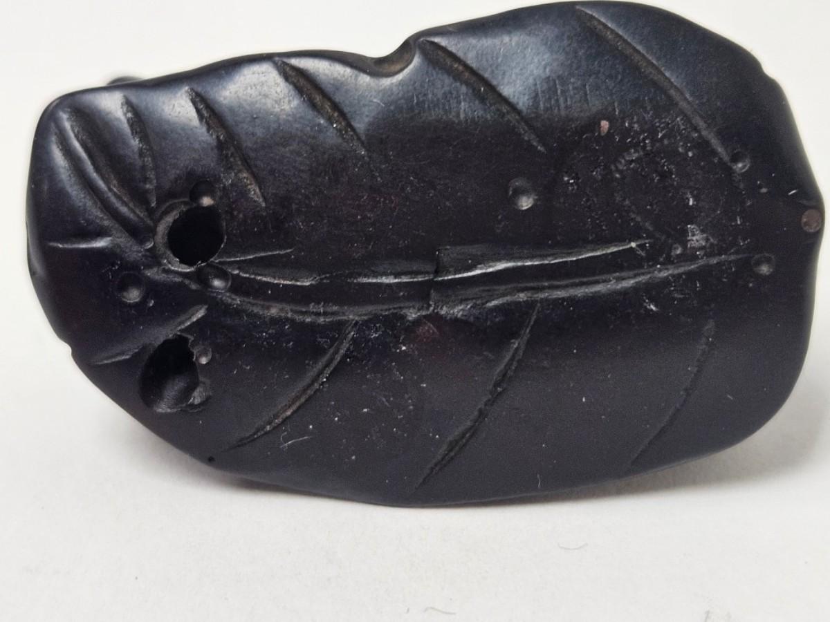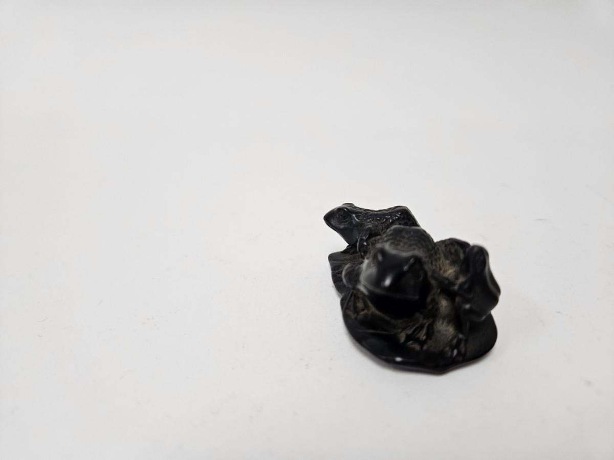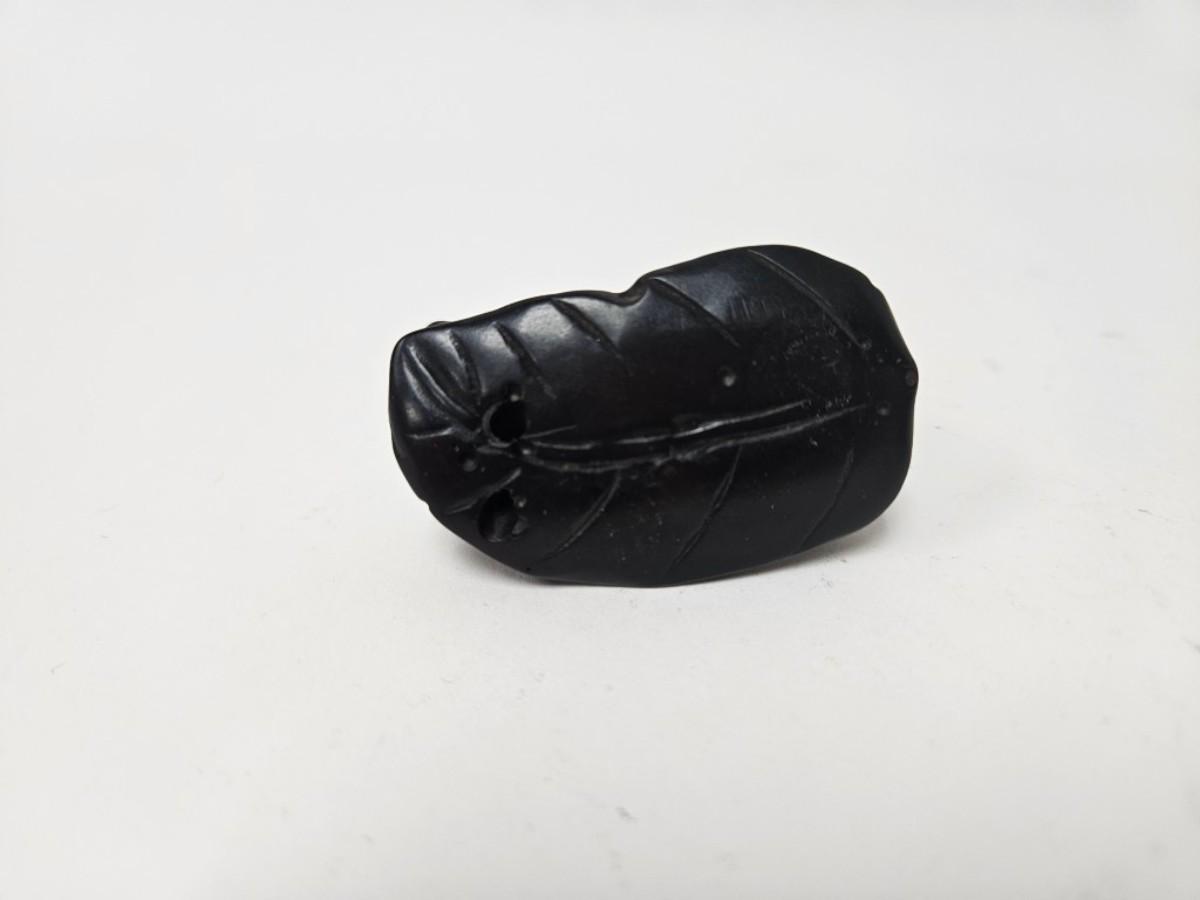 CKEG01. Vintage Carved Japanese Netsuke Bead, Ebonwood, Frogs on Leaf