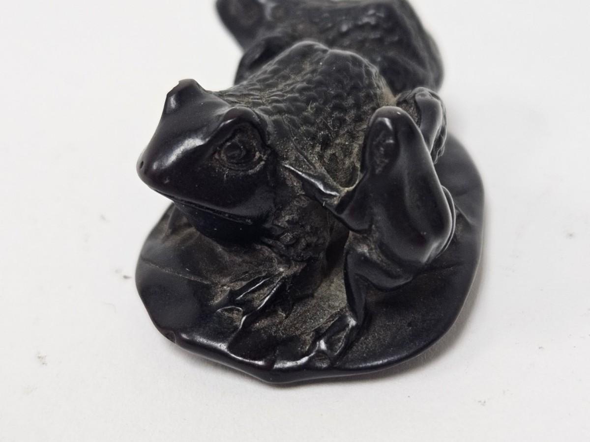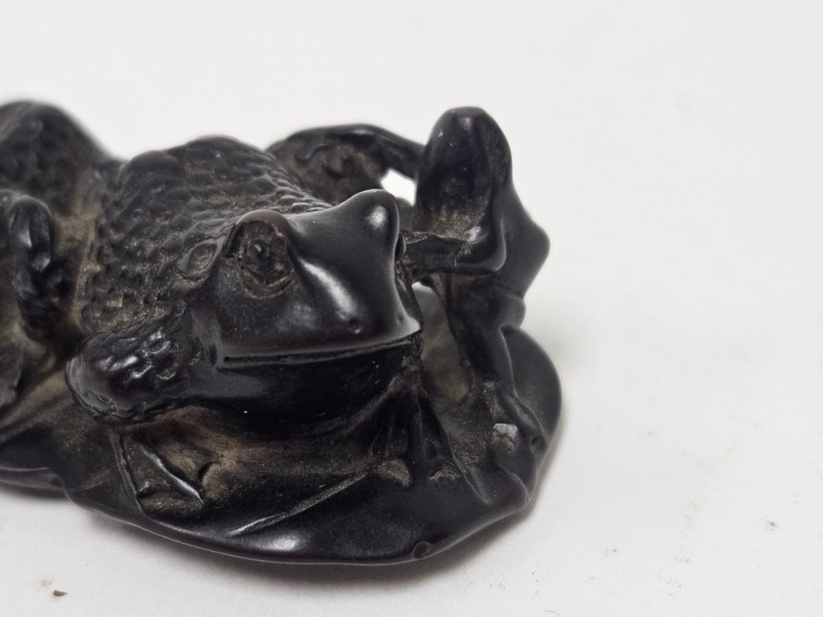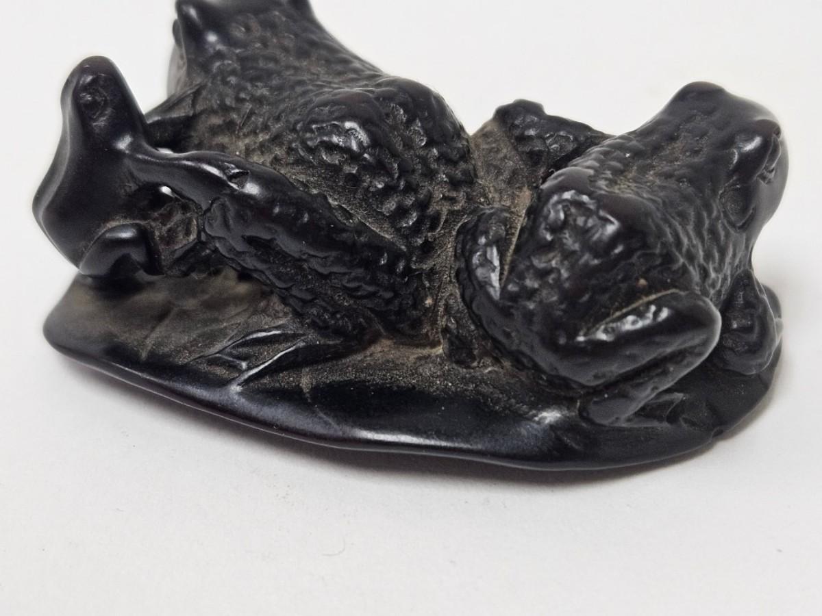 Vintage Carved Japanese Netsuke Bead, Ebonwood, Frogs on Leaf