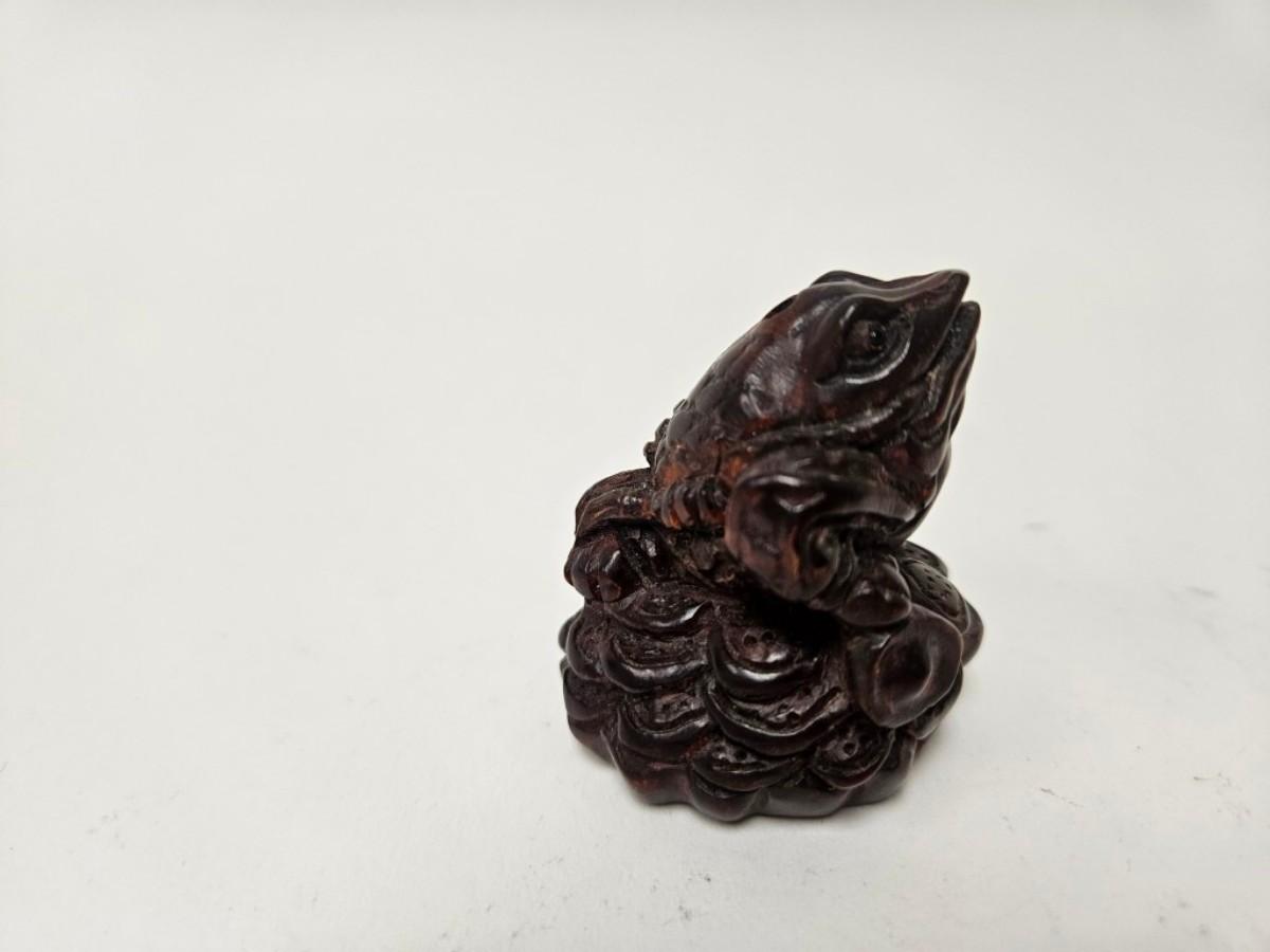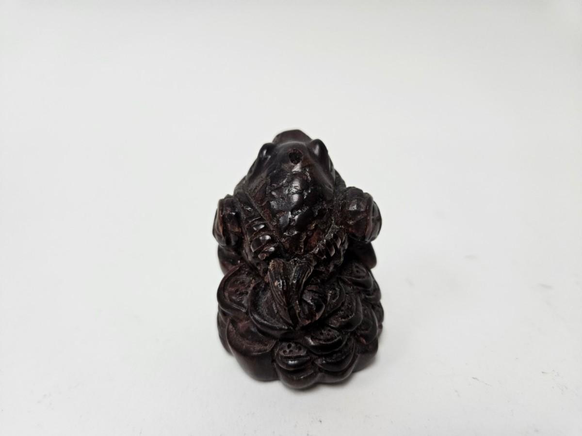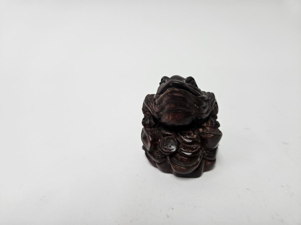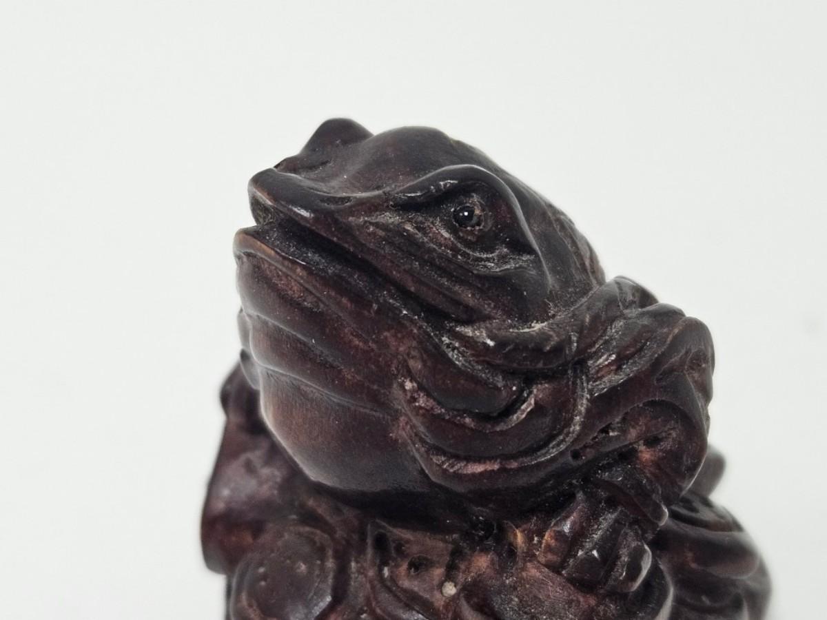 CKEG02. Vintage Carved Japanese Netsuke Bead, Luck Frog Wood, Signed