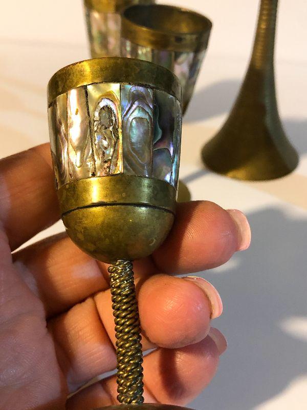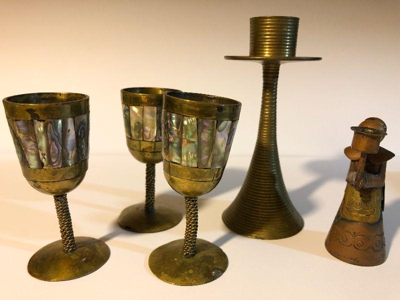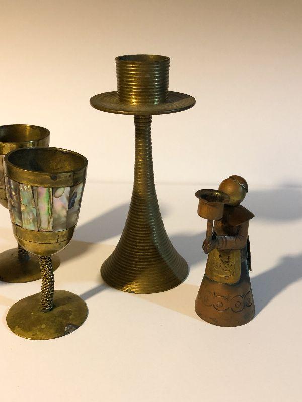 Nice lot of Mexican mixed metal arts, from small goblets to angel. Please see all pics for contents of the lot, condition of the lot, and the size of the items. Thank you for looking and have fun bidding.