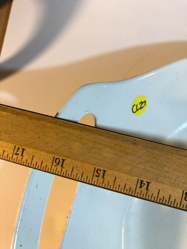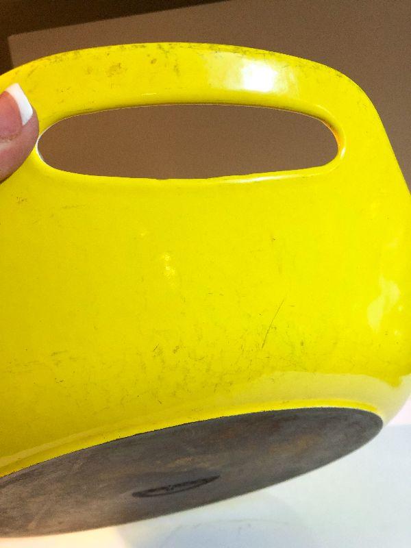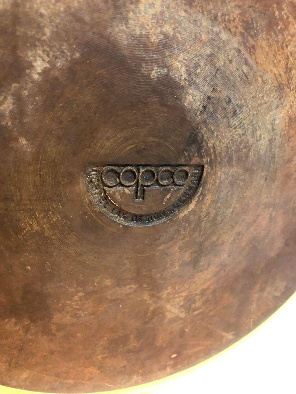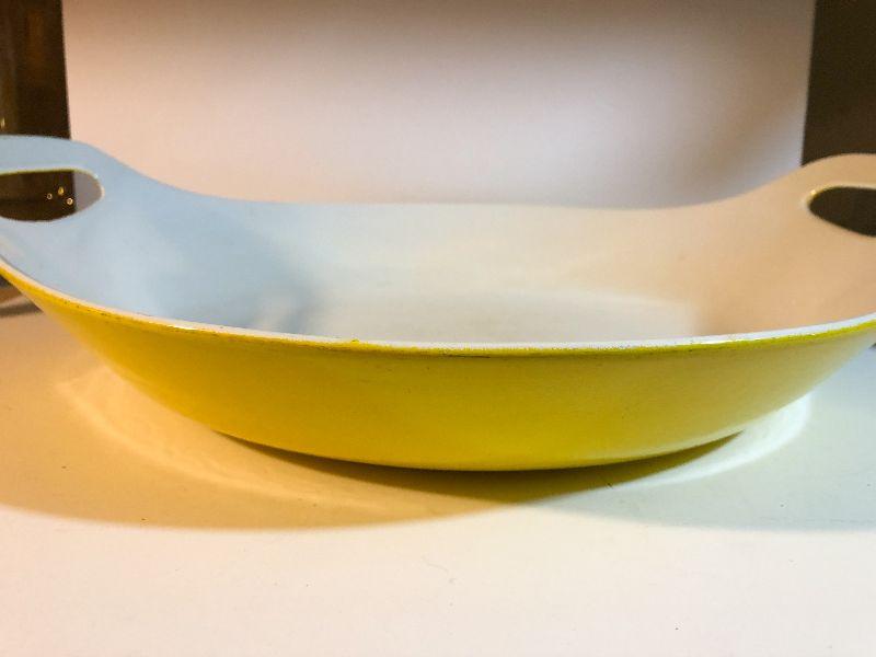 This is a large enamel/cast iron skillet by Copco. Please see pics for size and condition of the pan. Thank you for looking and have fun bidding.