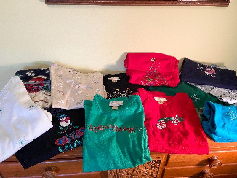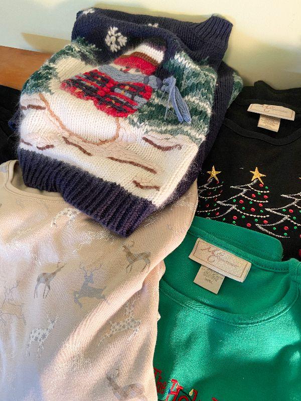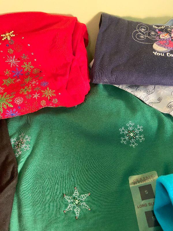 Women's size small shirts. Snow men, snow flakes and more. Please see all pictures for exact contents of the lot, condition of the items, and if measurements if taken. Thank you for looking and have fun bidding.