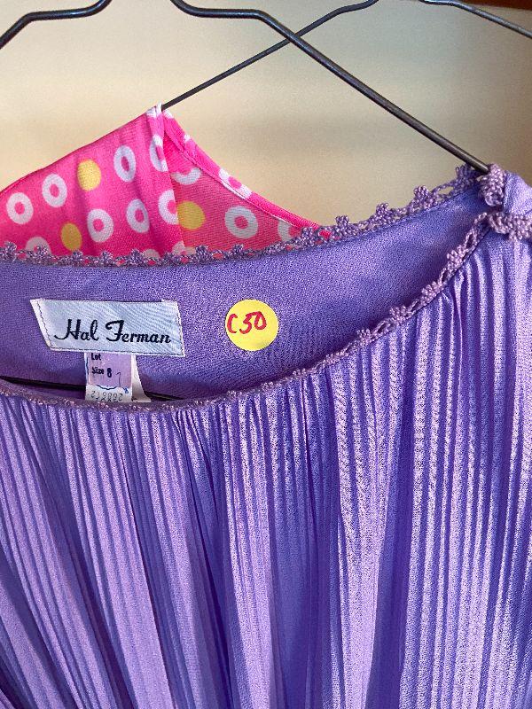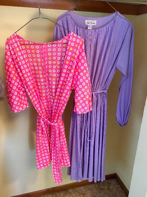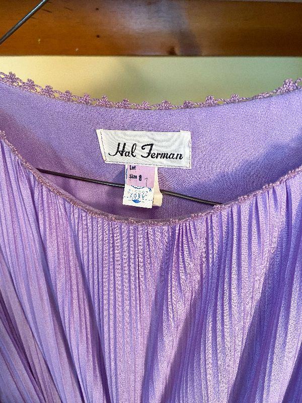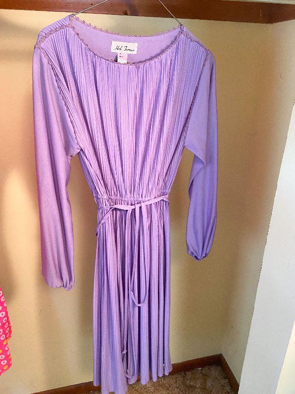 Vintage 70's dress by Hal Ferman. Purple, accordion pleated dress with tie belt and lace around neckline. Size 8. Also, a pink with polka dots cover up/robe. Please see all pictures for exact contents of the lot, condition of the items, and if measurements if taken. Thank you for looking and have fun bidding.