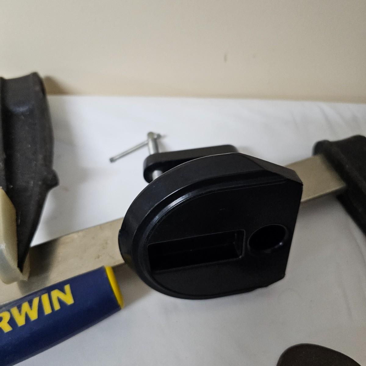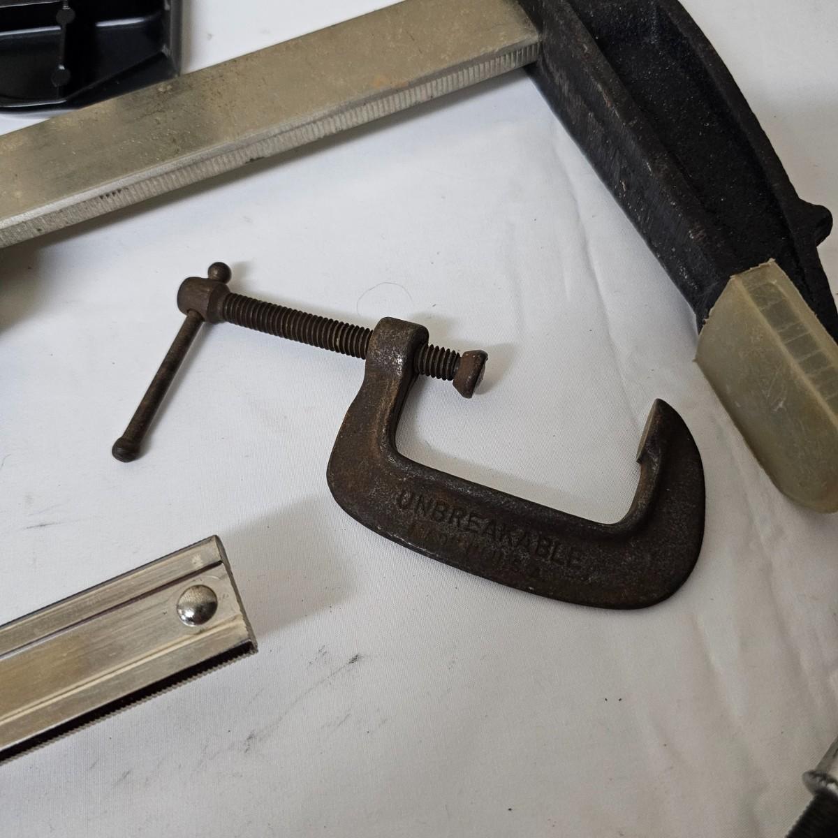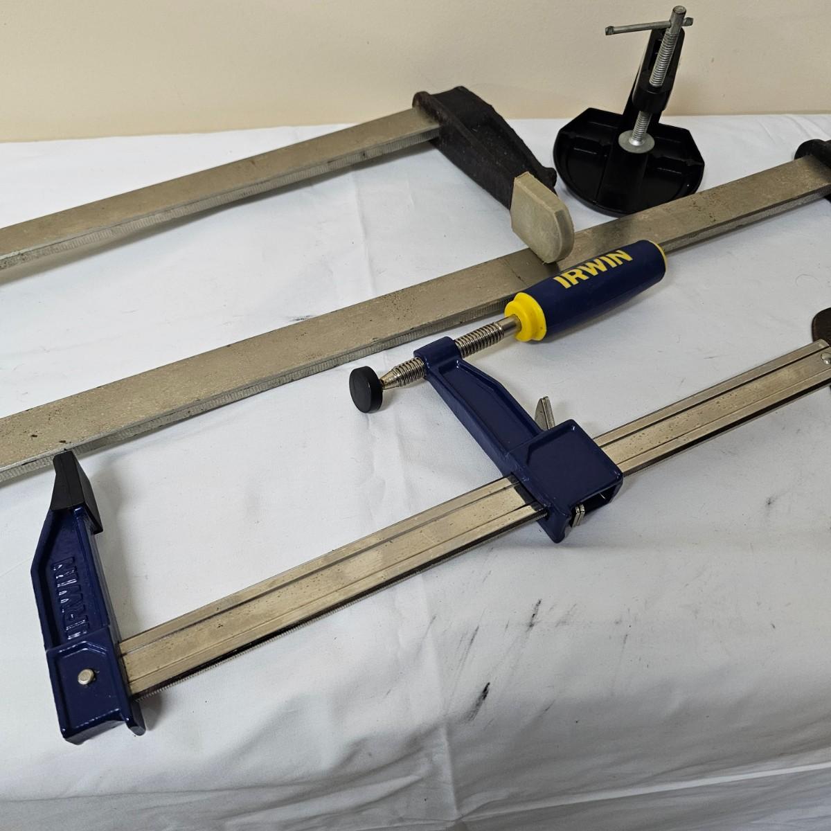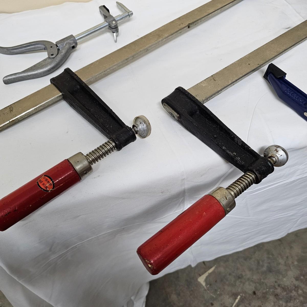 Two long bar type clamps, one Irwin slide clamp and more. Long clamps are 7.5" x 33" long, have 24" capability. Irwin clamp is 5" x 19", has 12" opening. One squeeze clamp, one small C clamp and two pipe/tubing cutters for plumbing. See photos for details. Local pickup only.