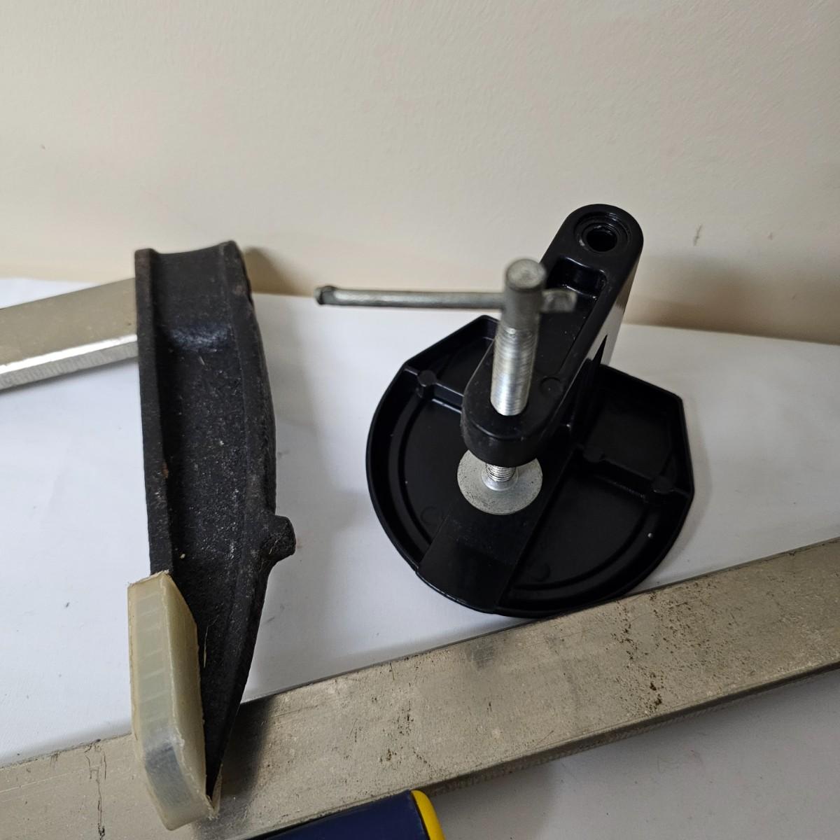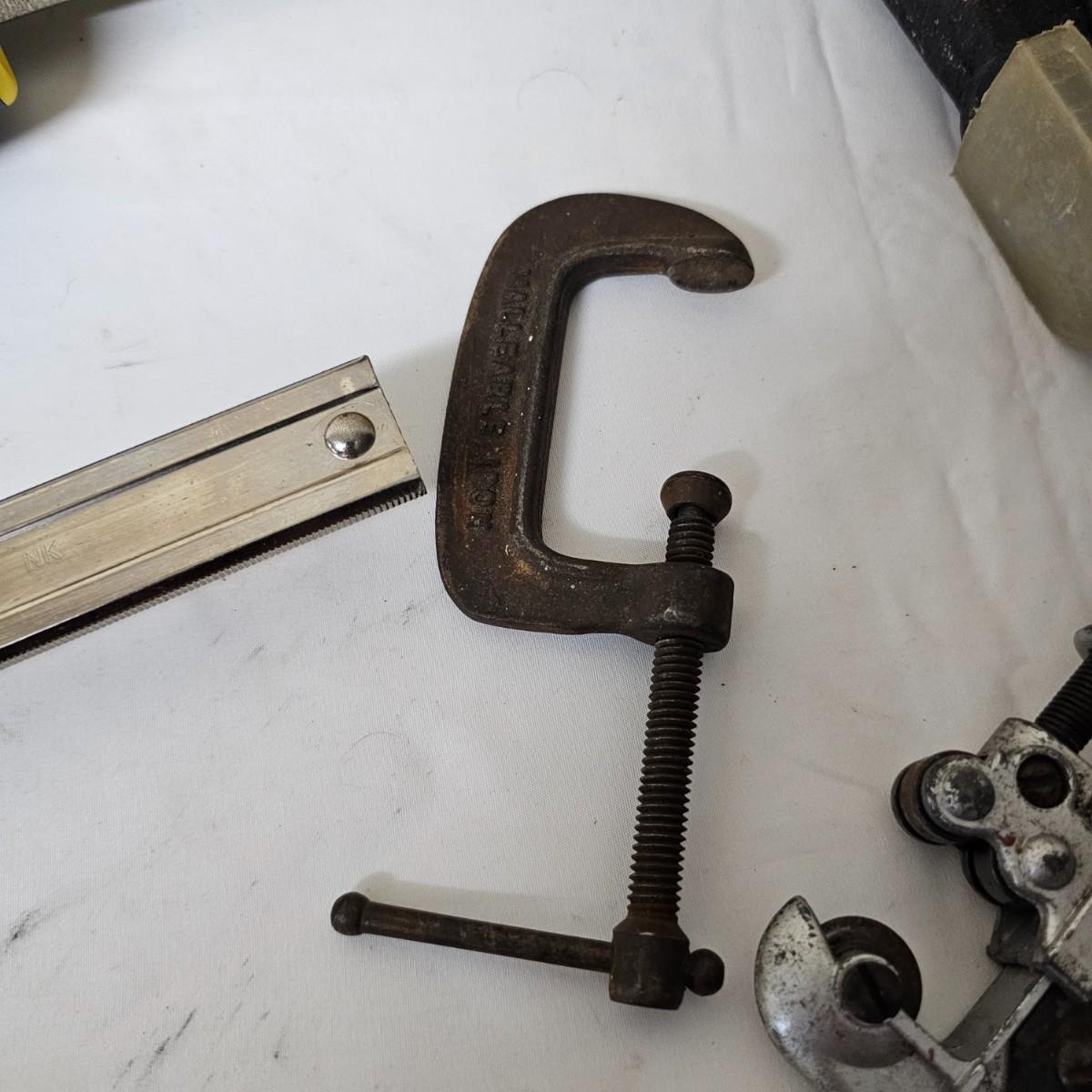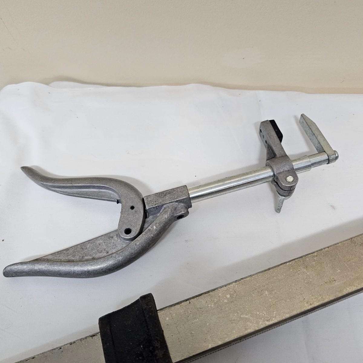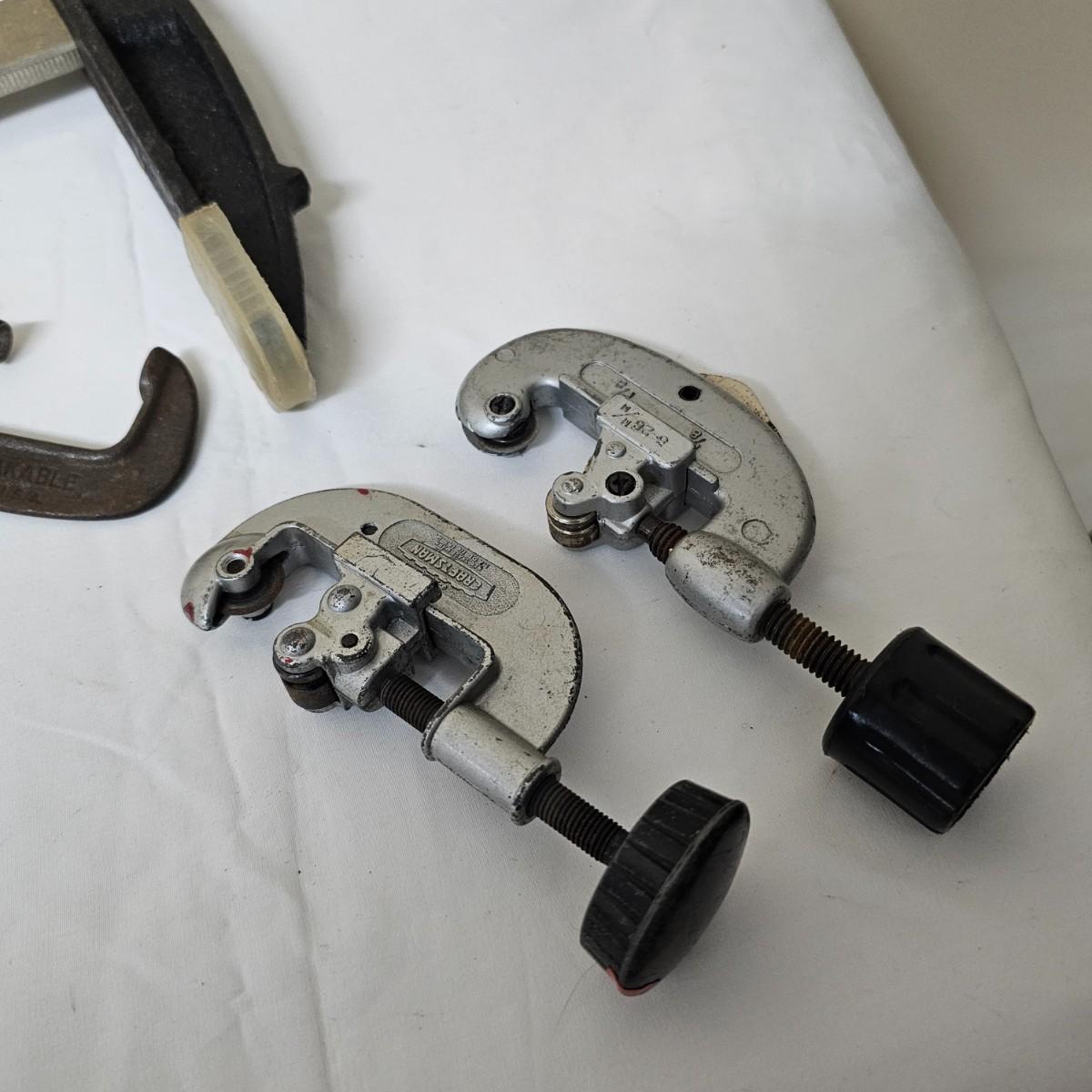 Two long bar type clamps, one Irwin slide clamp and more. Long clamps are 7.5" x 33" long, have 24" capability. Irwin clamp is 5" x 19", has 12" opening. One squeeze clamp, one small C clamp and two pipe/tubing cutters for plumbing. See photos for details. Local pickup only.