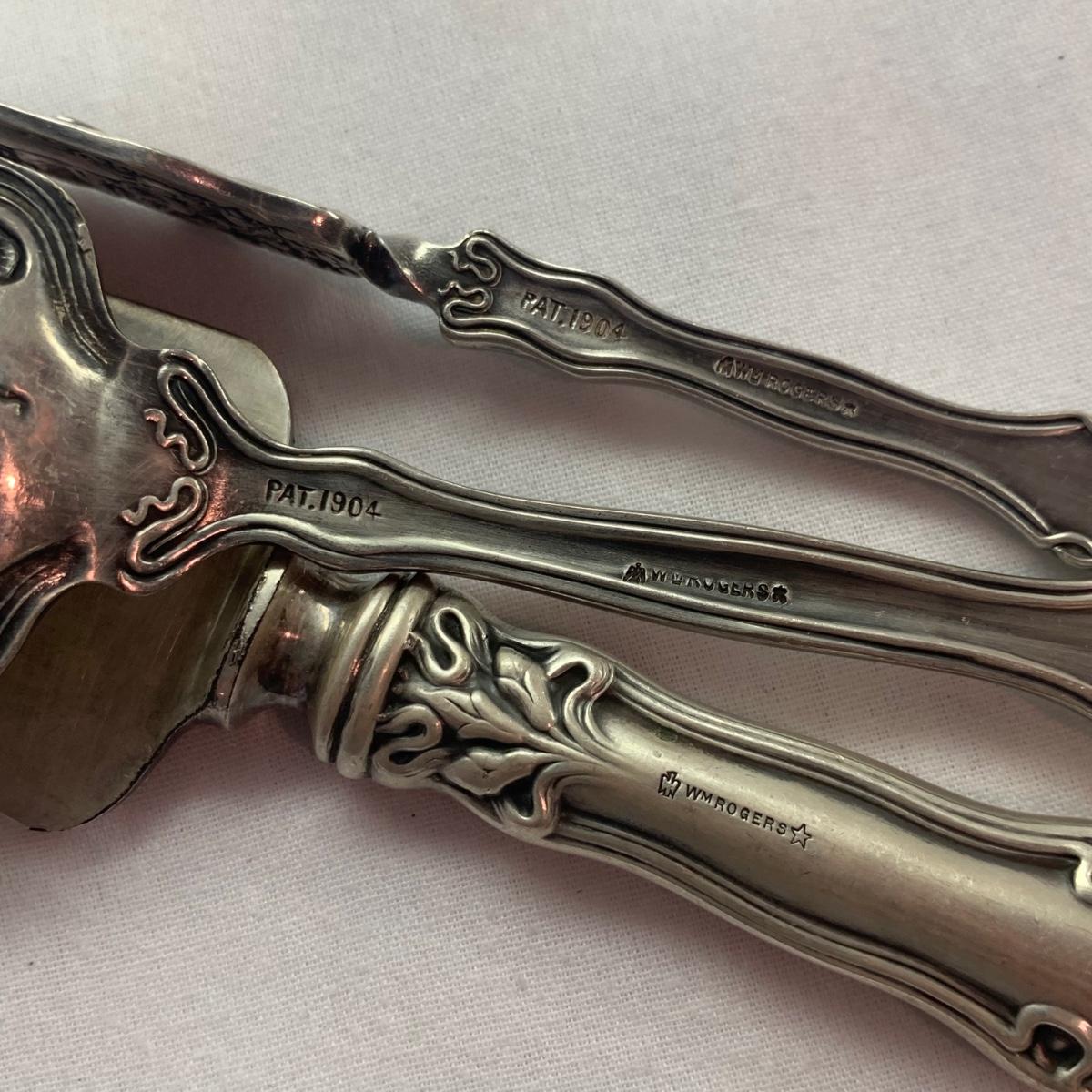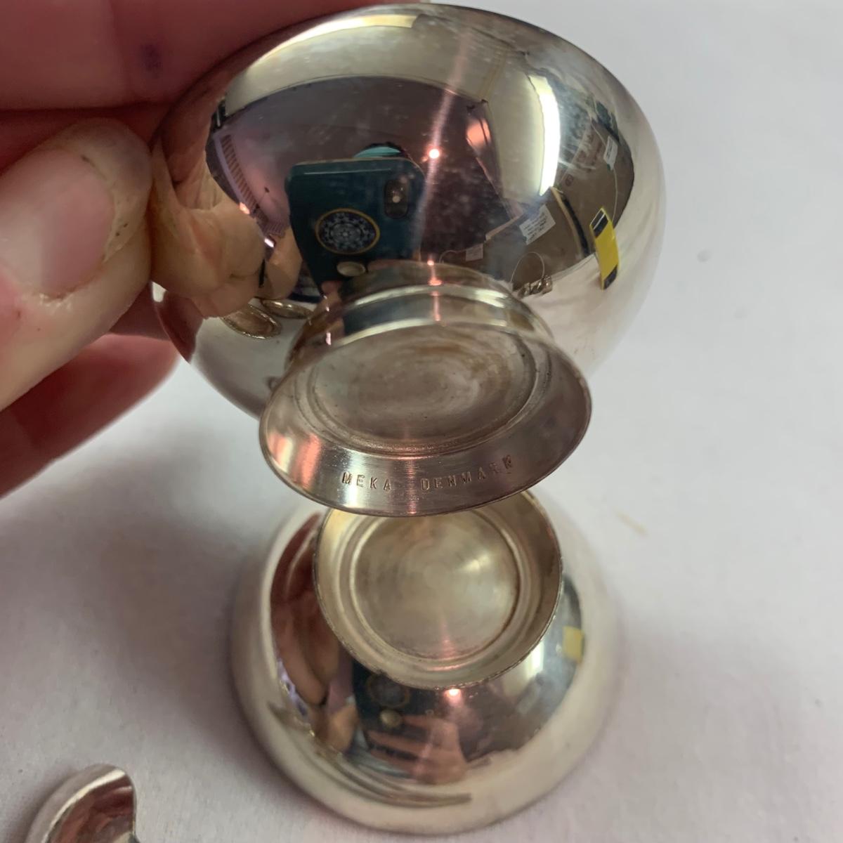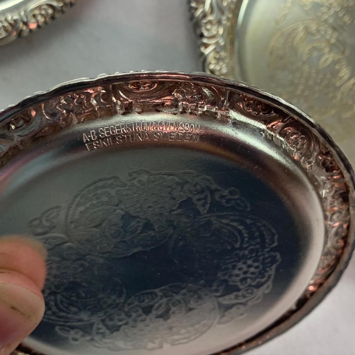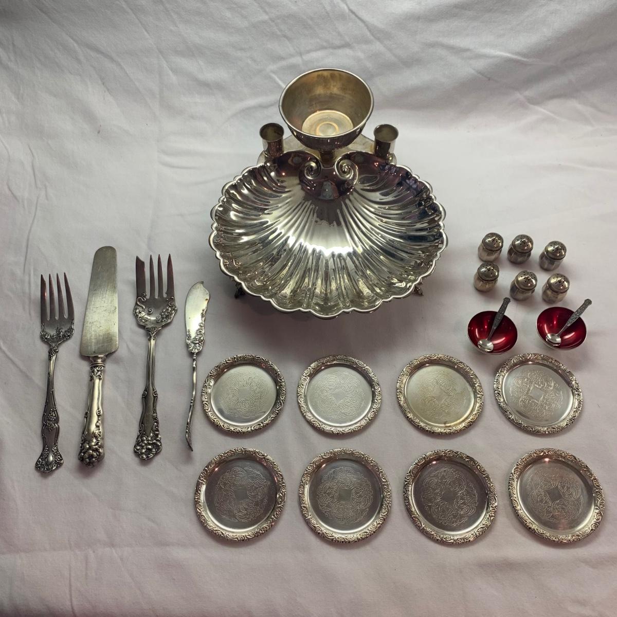 Lovely ornate footed clamshell shrimp server, appears to be silver plated but has no visible hallmarks. Measures approximately 10” x 10” x 5”H (to the tallest part). Also included are six salt & pepper shakers marked Sterling, two small Meka Denmark salt dishes and spoons, four Wm. Rogers serving utensils, and eight silverplated coasters, marked ‘AB Segelstrom & Svensson, Eskilstuna, Sweden’.