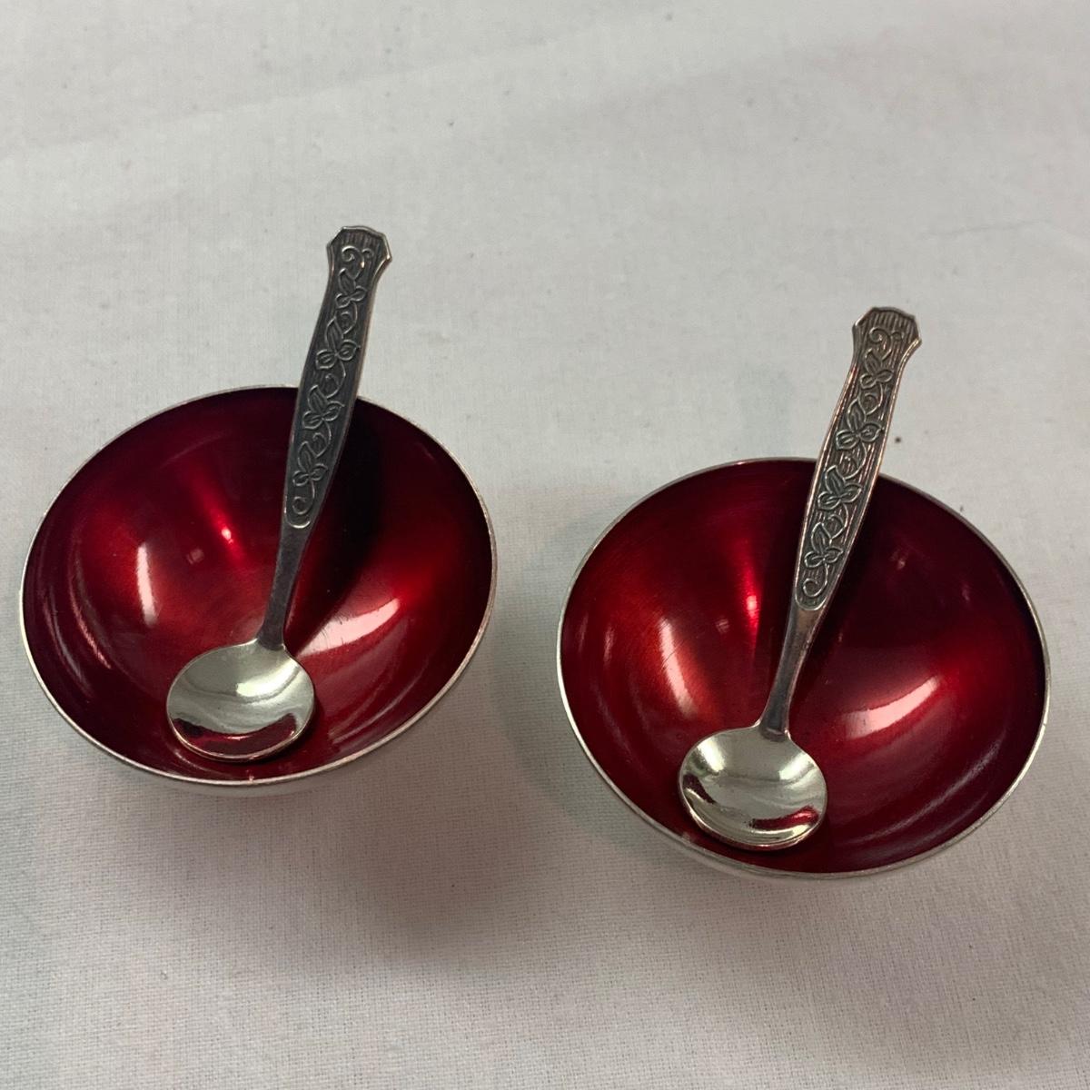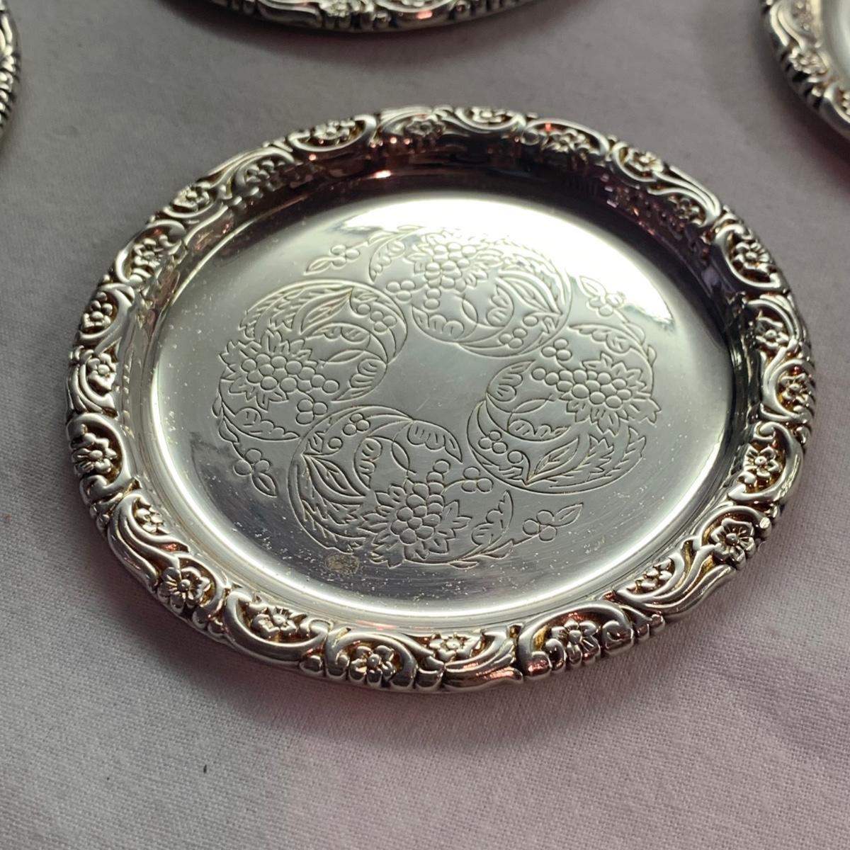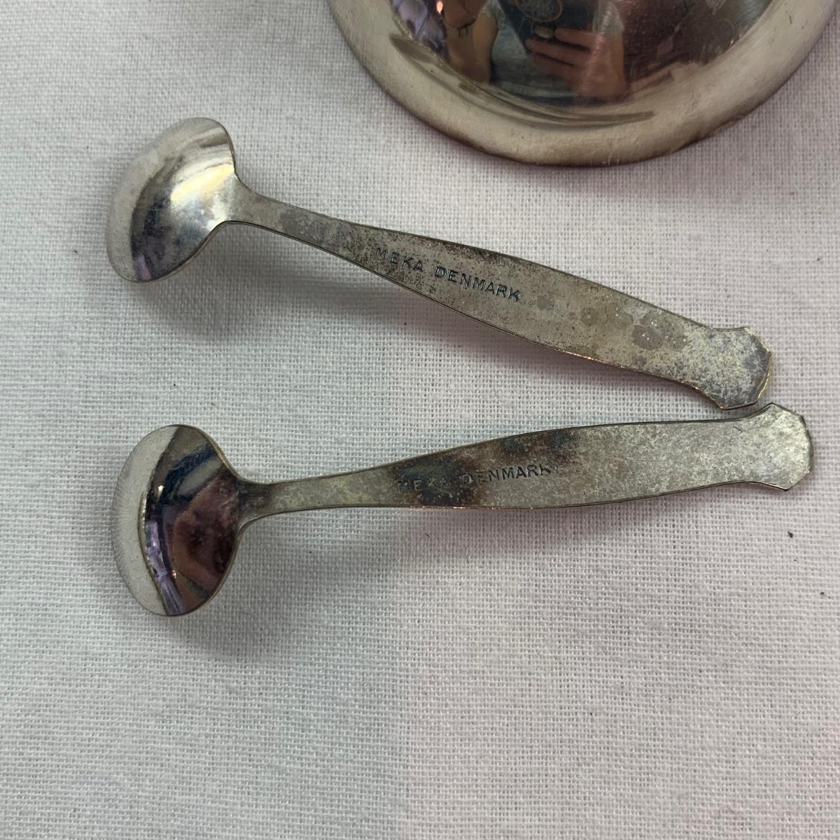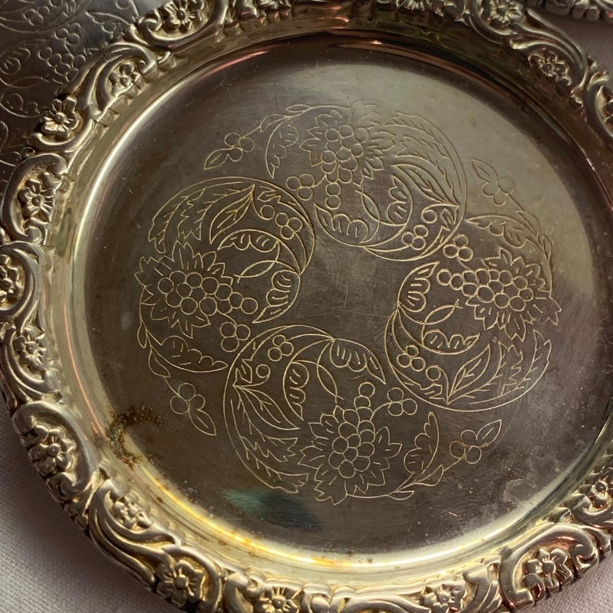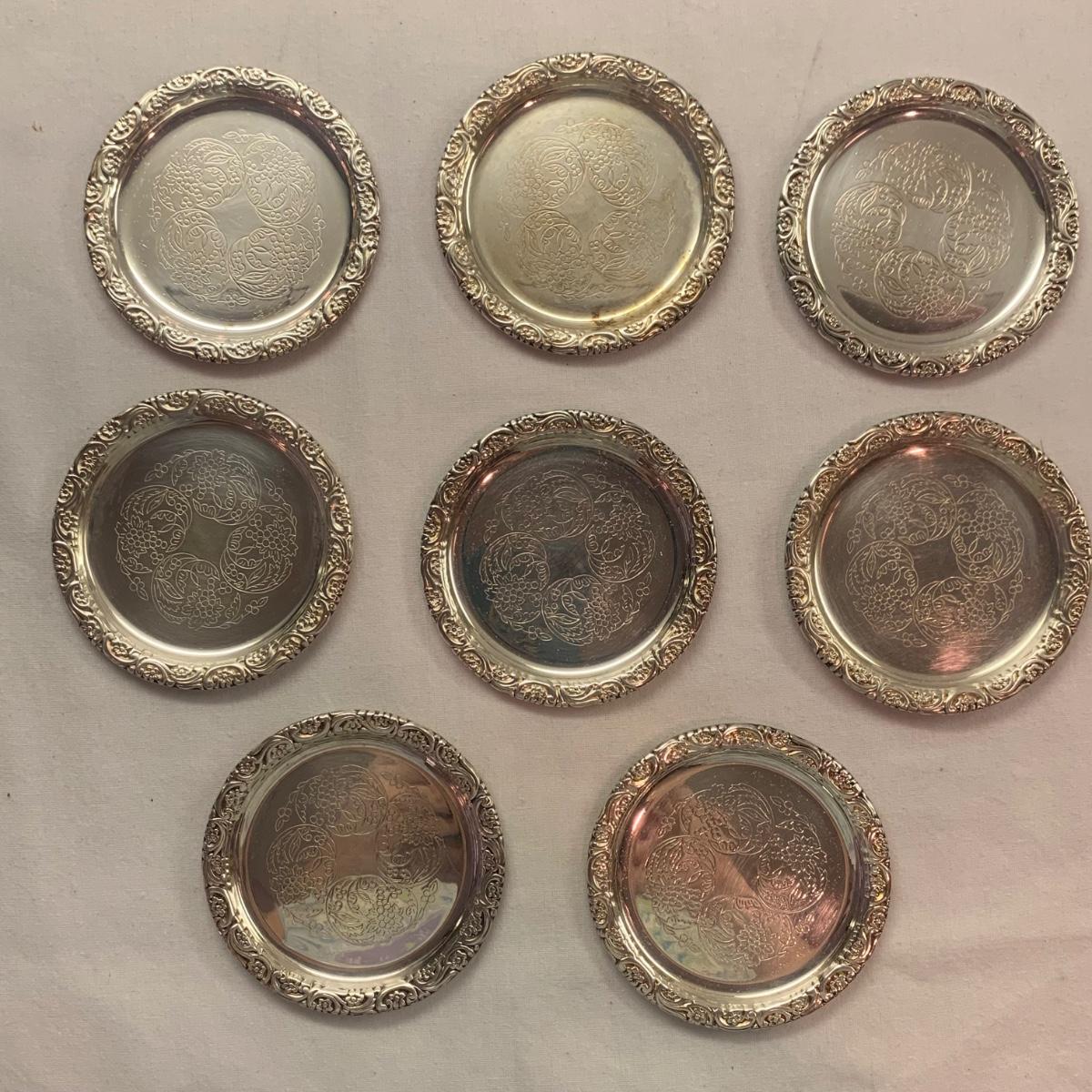 Lovely ornate footed clamshell shrimp server, appears to be silver plated but has no visible hallmarks. Measures approximately 10” x 10” x 5”H (to the tallest part). Also included are six salt & pepper shakers marked Sterling, two small Meka Denmark salt dishes and spoons, four Wm. Rogers serving utensils, and eight silverplated coasters, marked ‘AB Segelstrom & Svensson, Eskilstuna, Sweden’.