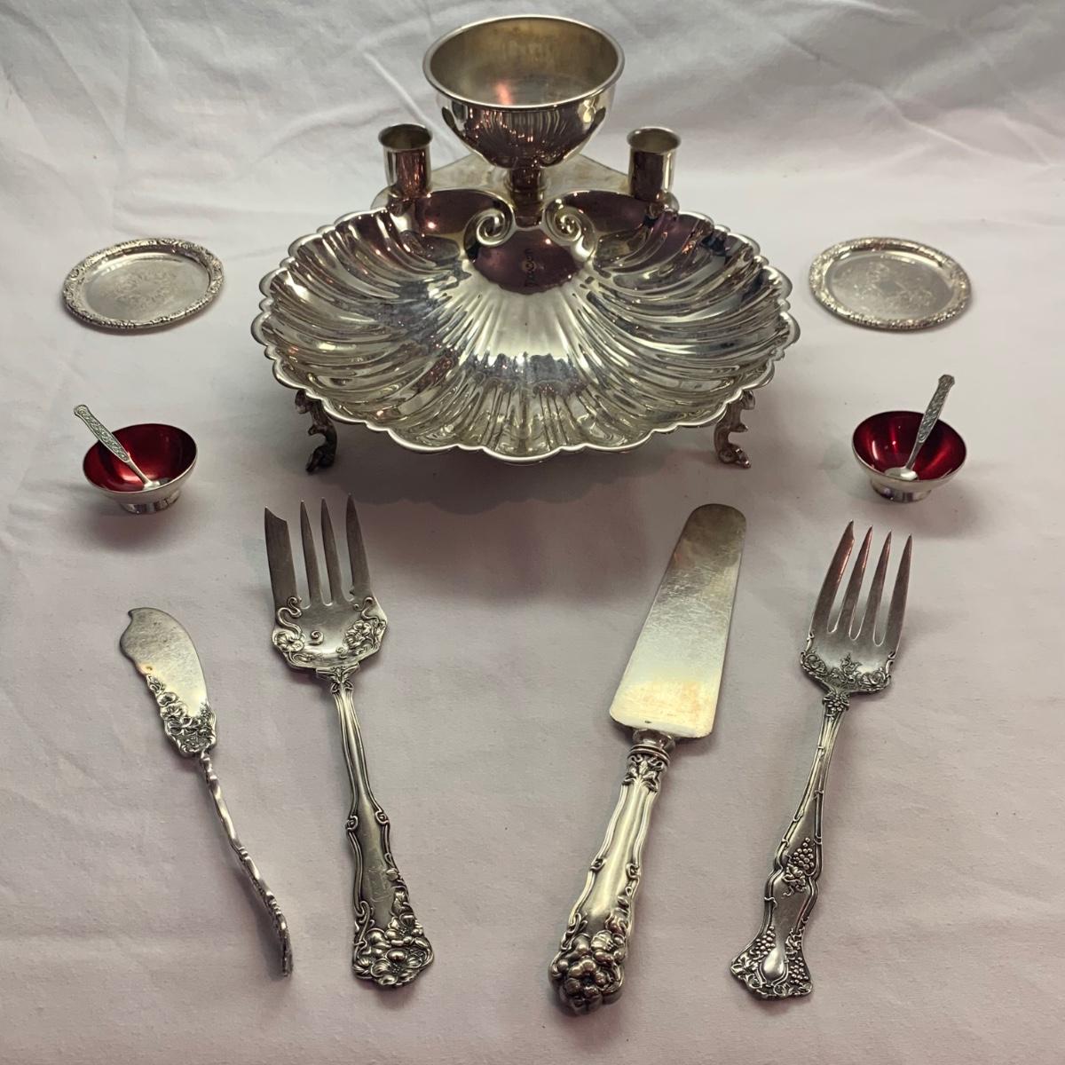 Clamshell Shrimp Server plus Sterling Salt & Pepper Shakers and More (K-HS)