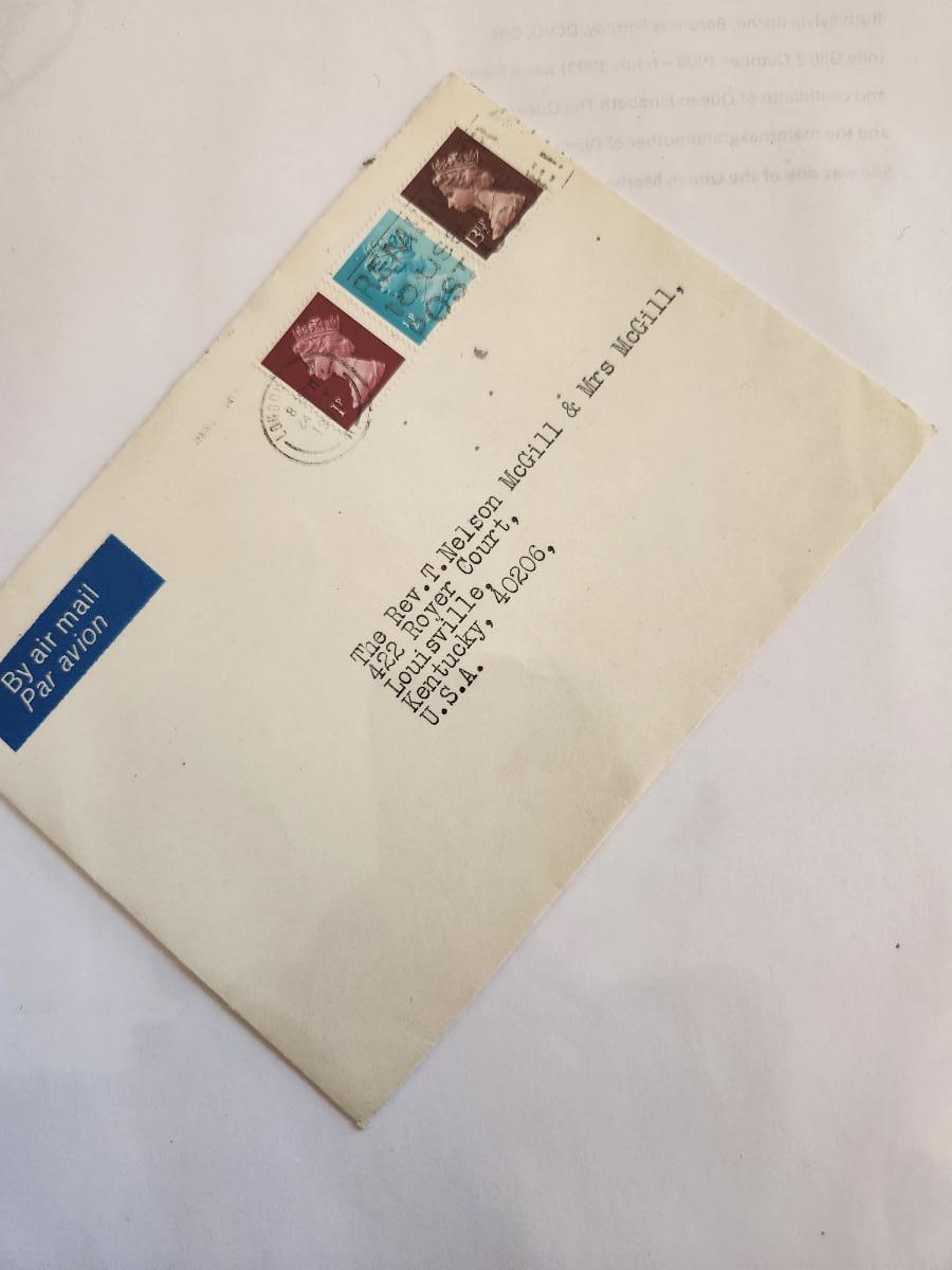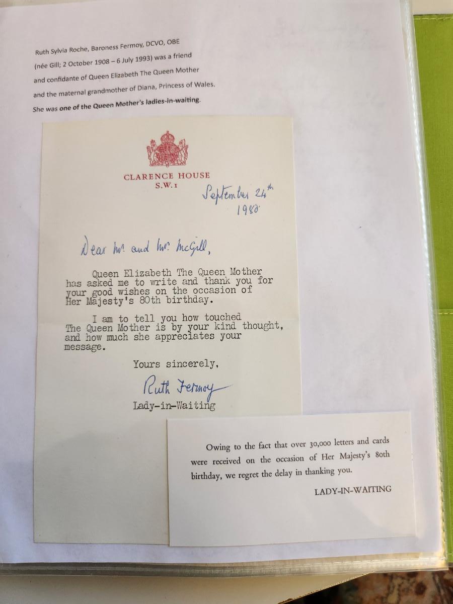 This auction lot is for a Clarence House / Lady-in-Waiting Letter. The letter, dated September 24, 1982, is in response to correspondence from Fr. McGill regarding the 80th birthday of the Queen Mother. The letter is from and signed by Ruth Sylvia Roche, Baroness Fermoy. The envelope in which this letter was sent is included in this lot.