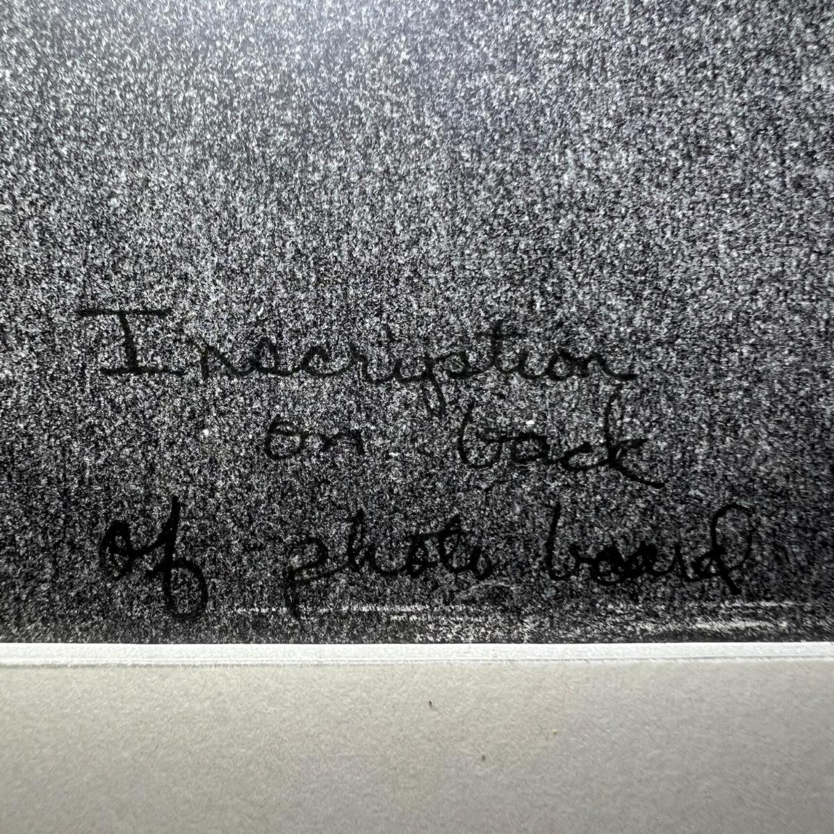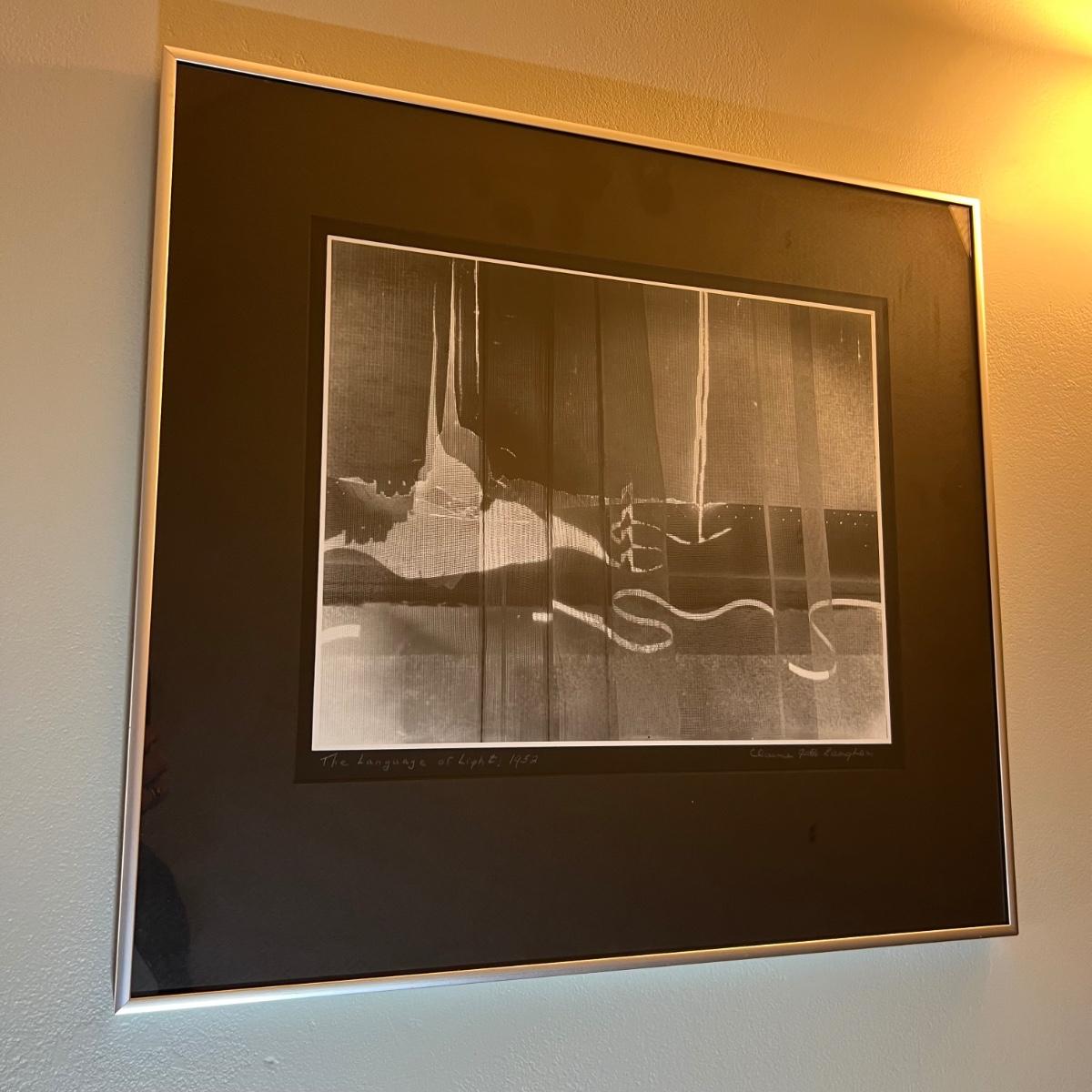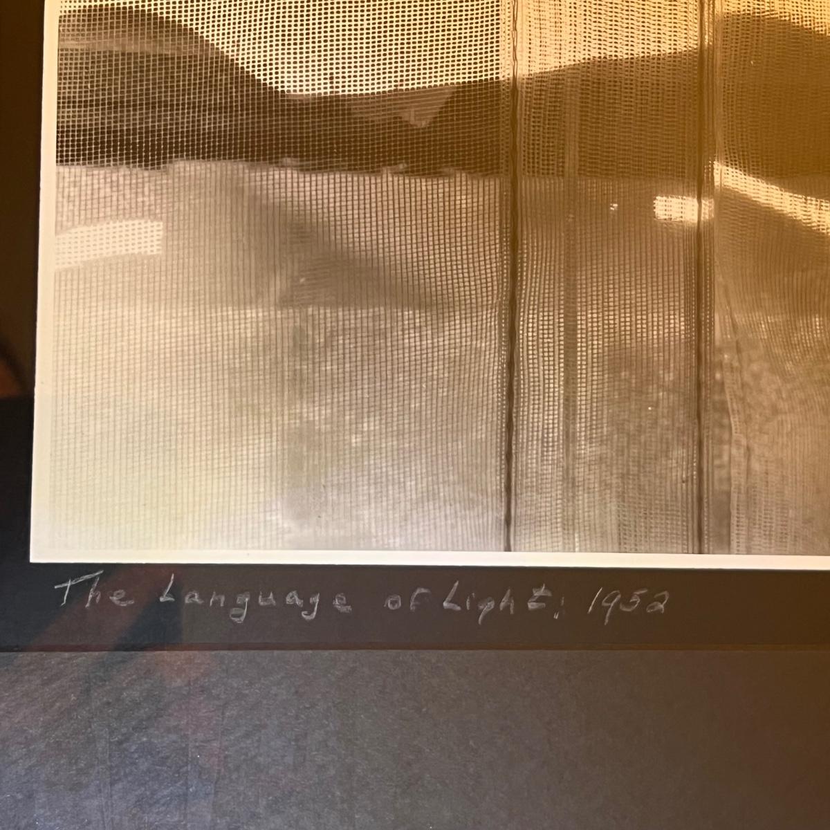 The title of this photograph by Clarence John Laughlin is “The Language of Light”. Matted and mounted under glass in a silver metal frame which measures 21” x 19”H. In addition to title and signature there is also inscription on the back with copyright information and a hard to decipher personalized message, see images.