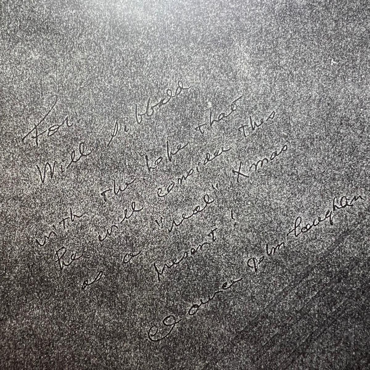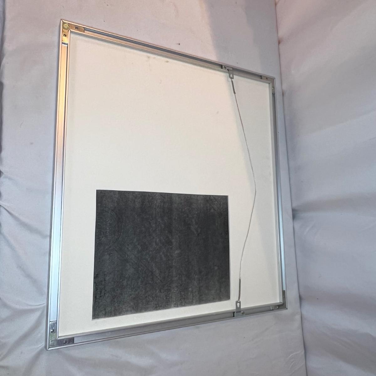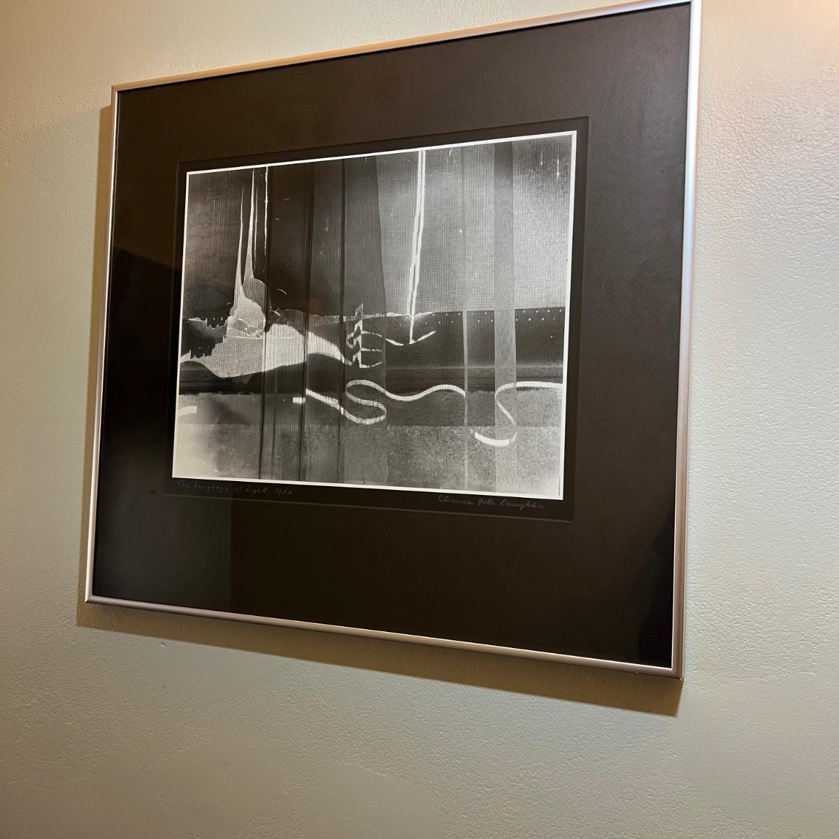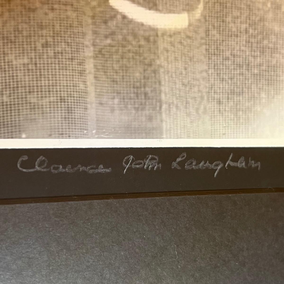 The title of this photograph by Clarence John Laughlin is “The Language of Light”. Matted and mounted under glass in a silver metal frame which measures 21” x 19”H. In addition to title and signature there is also inscription on the back with copyright information and a hard to decipher personalized message, see images.
