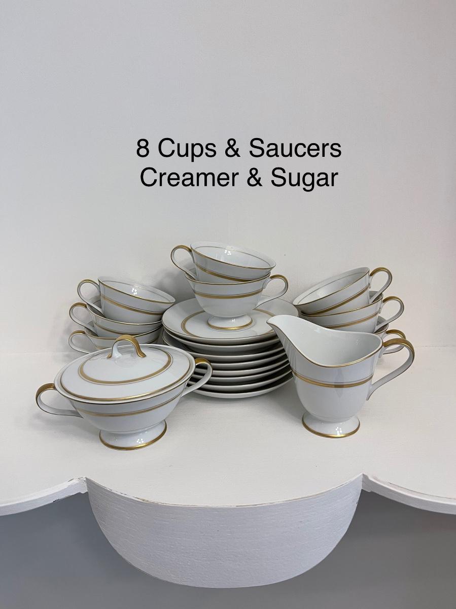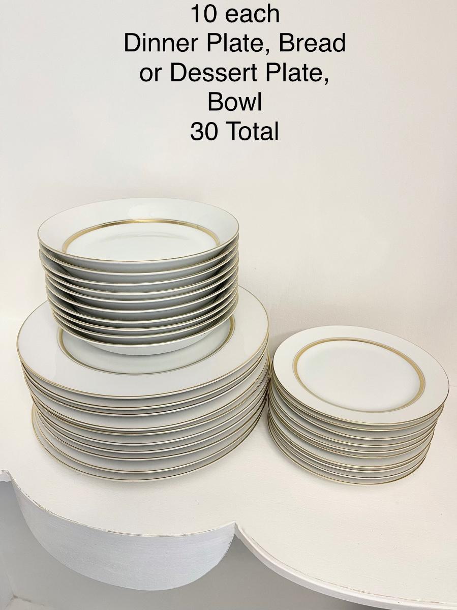 There are 10 of each ~ Dinner Plates, Bread, Bowl ~ There are 8 Cups and Saucers. There is a creamer and sugar, 1 small oval dish and 1 round serving bowl. 50 Pieces Total