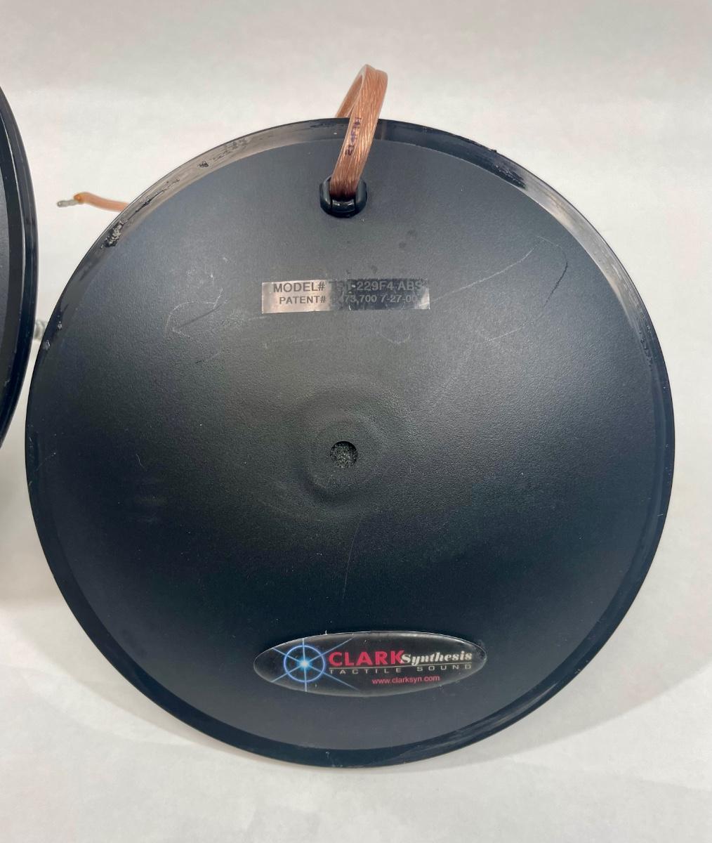 Clark Synthesis Tactile Sound Transducers deliver extremely accurate audio signals into your furniture. Great addition to any home theater system. Model TST229F4. Approx. 8” across. Untested but appear to be in good condition.