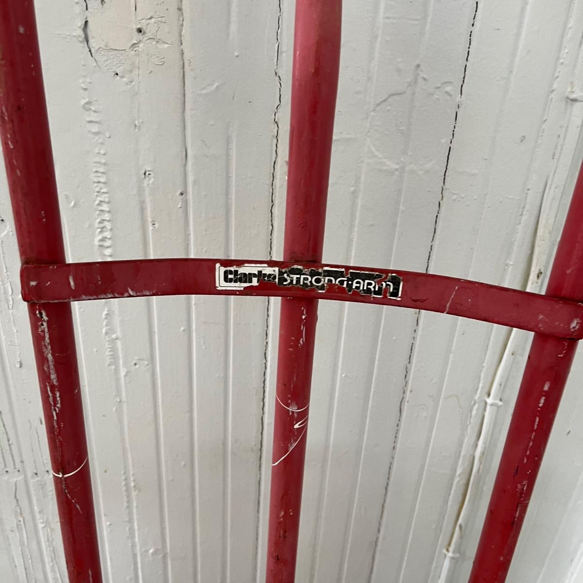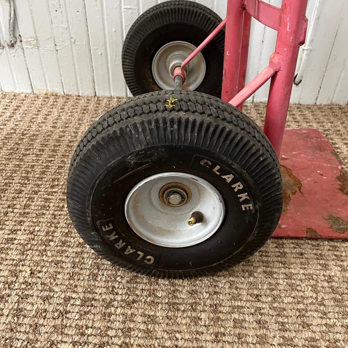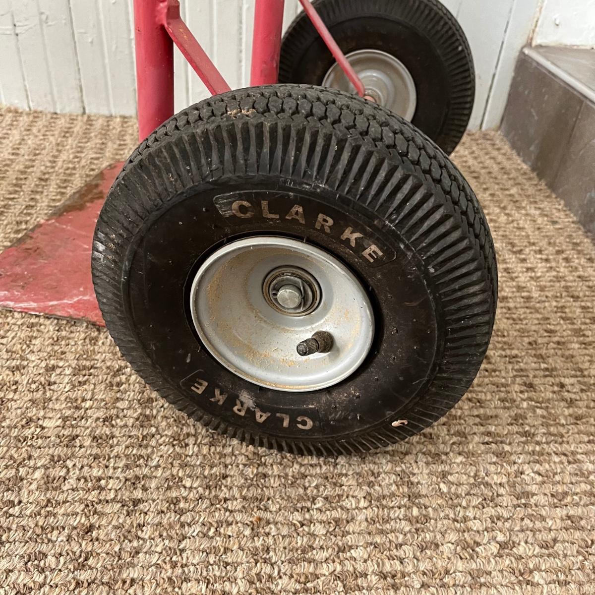 Lot includes a Clarke Strong Arm metal hand truck with pneumatic tires. Tire are flat. Hand truck measures 18” x 21” x 52”.