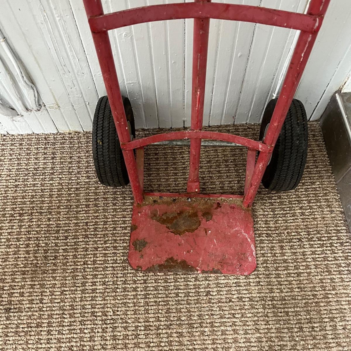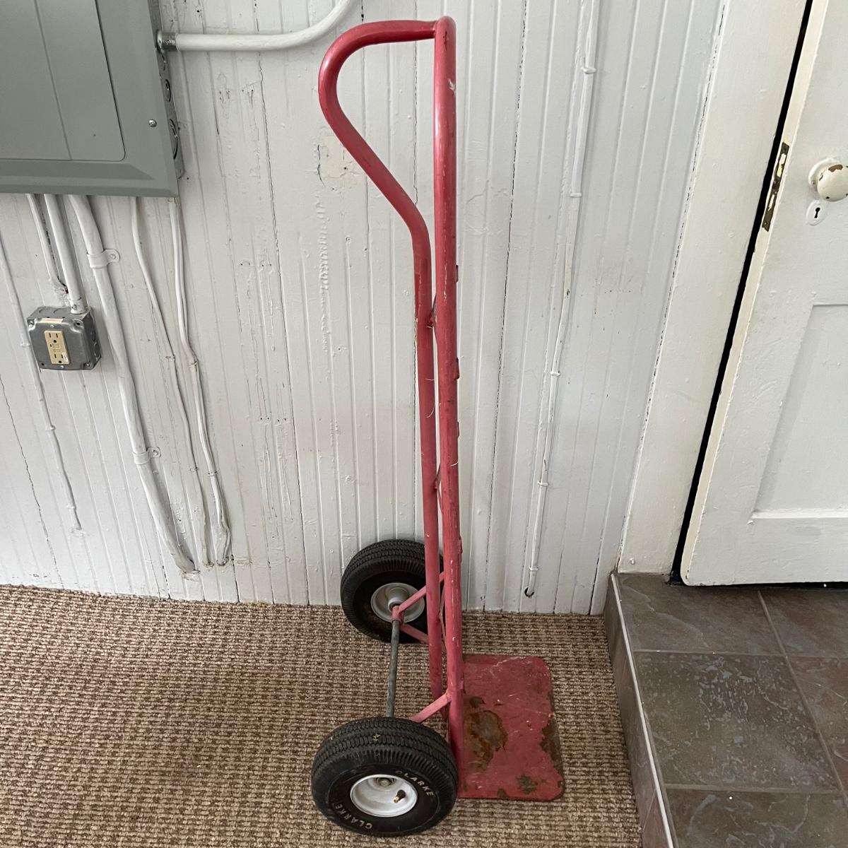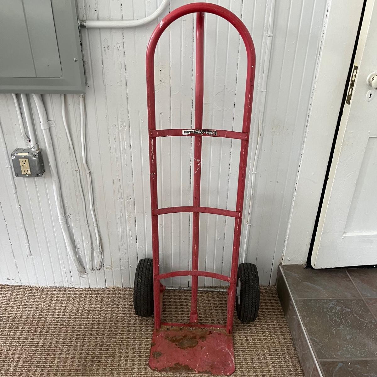 Lot includes a Clarke Strong Arm metal hand truck with pneumatic tires. Tire are flat. Hand truck measures 18” x 21” x 52”.