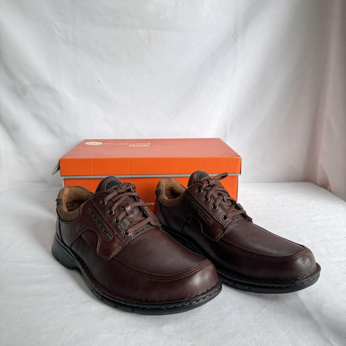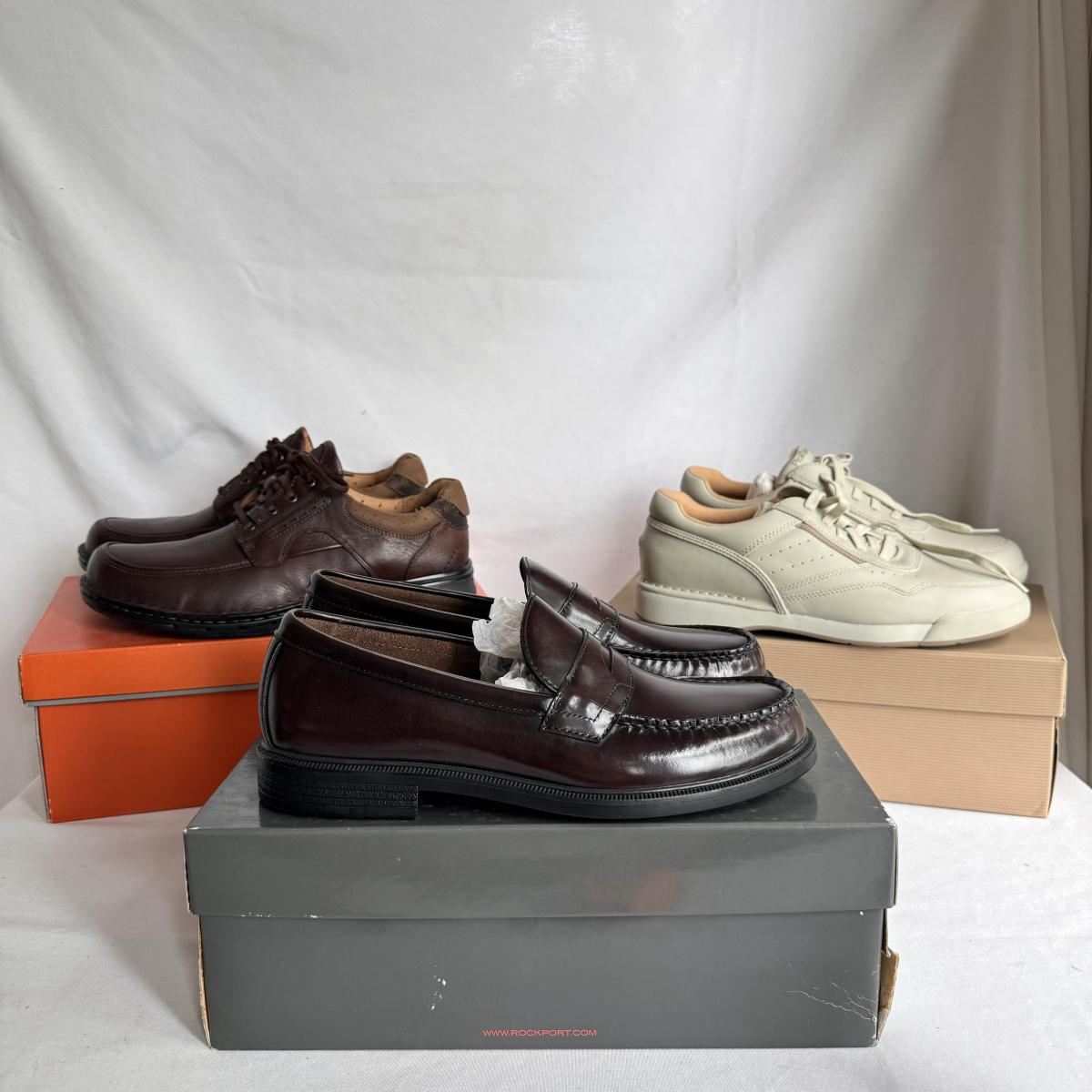 This lot includes one brown pair of Clarks shoes and two pairs of Rockport shoes. All shoes appear to be unworn and in their original boxes. The Clarks shoes are a men’s size 10. The Rockport shoes are both size men’s 9 1/2.