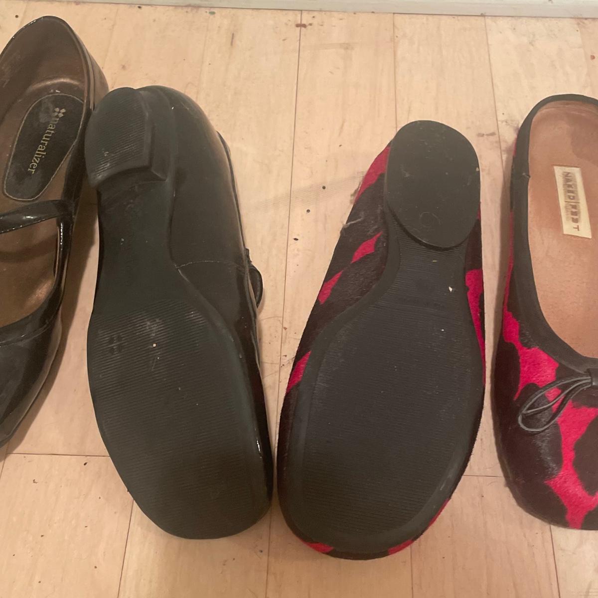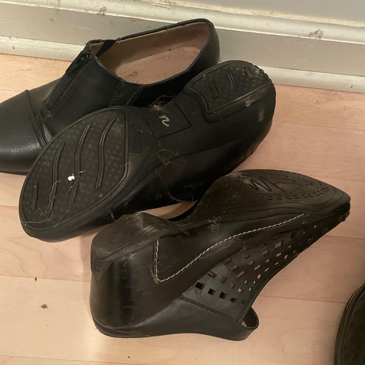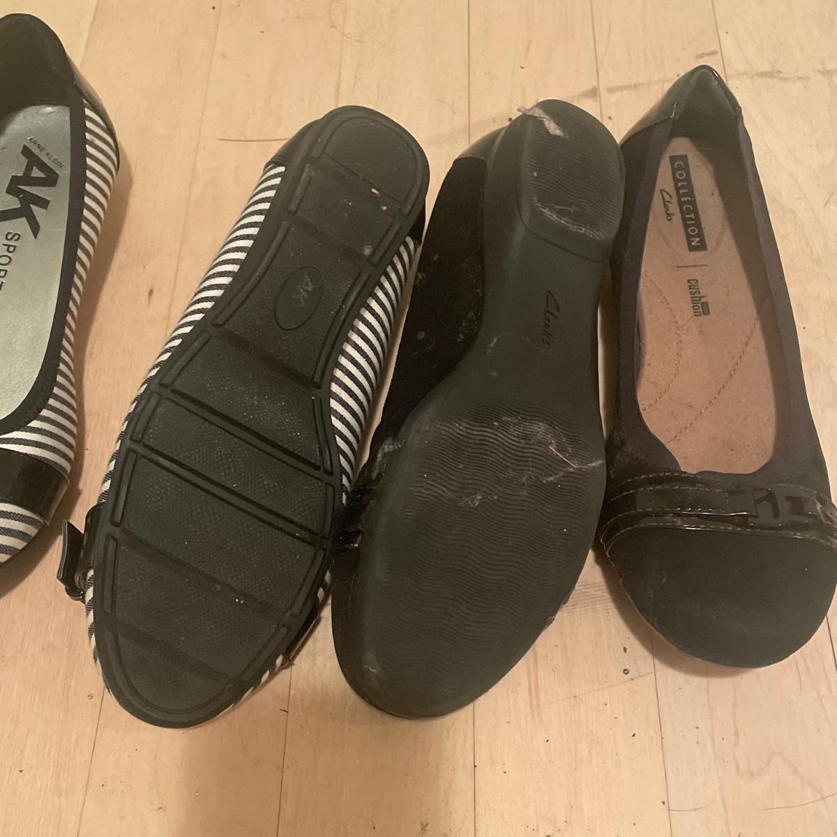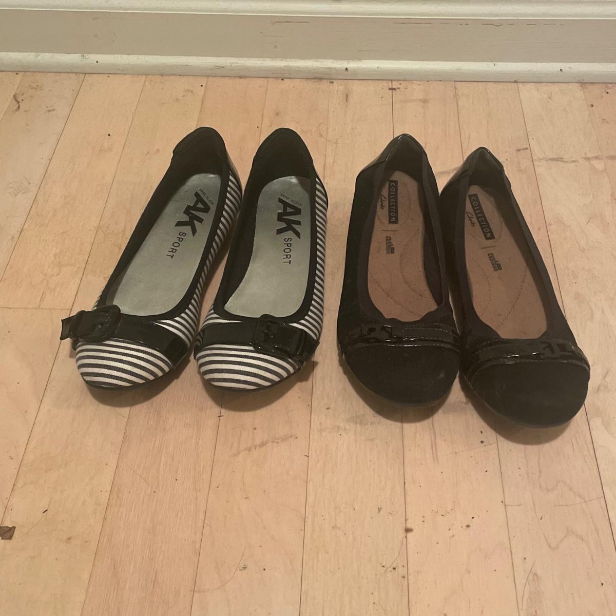 Lots of wear left in these 17 pairs of shoes. Great brand names such as Clarks, Naturalizer & more, see images. All shoes are in good condition. Many are leather with some canvas and suede as well. Shoe box does not belong with any pair of shoes in this lot. Sizes are photographed when found and sizes range from 8-8.5 with 1 pair of size 7.