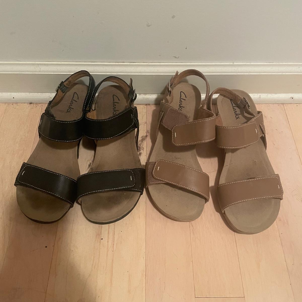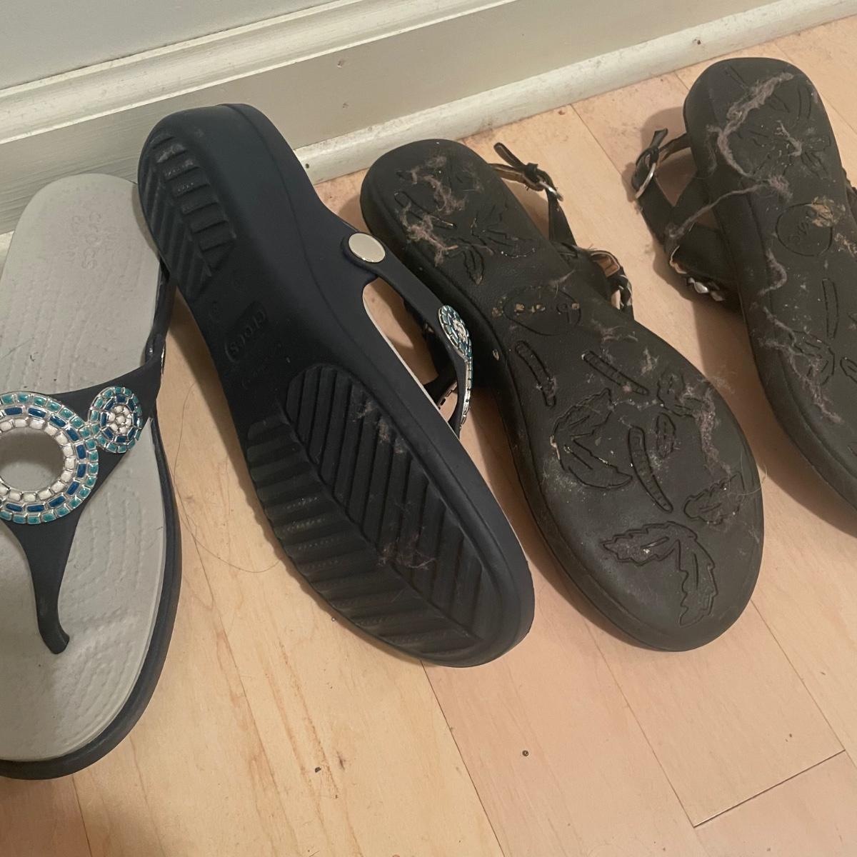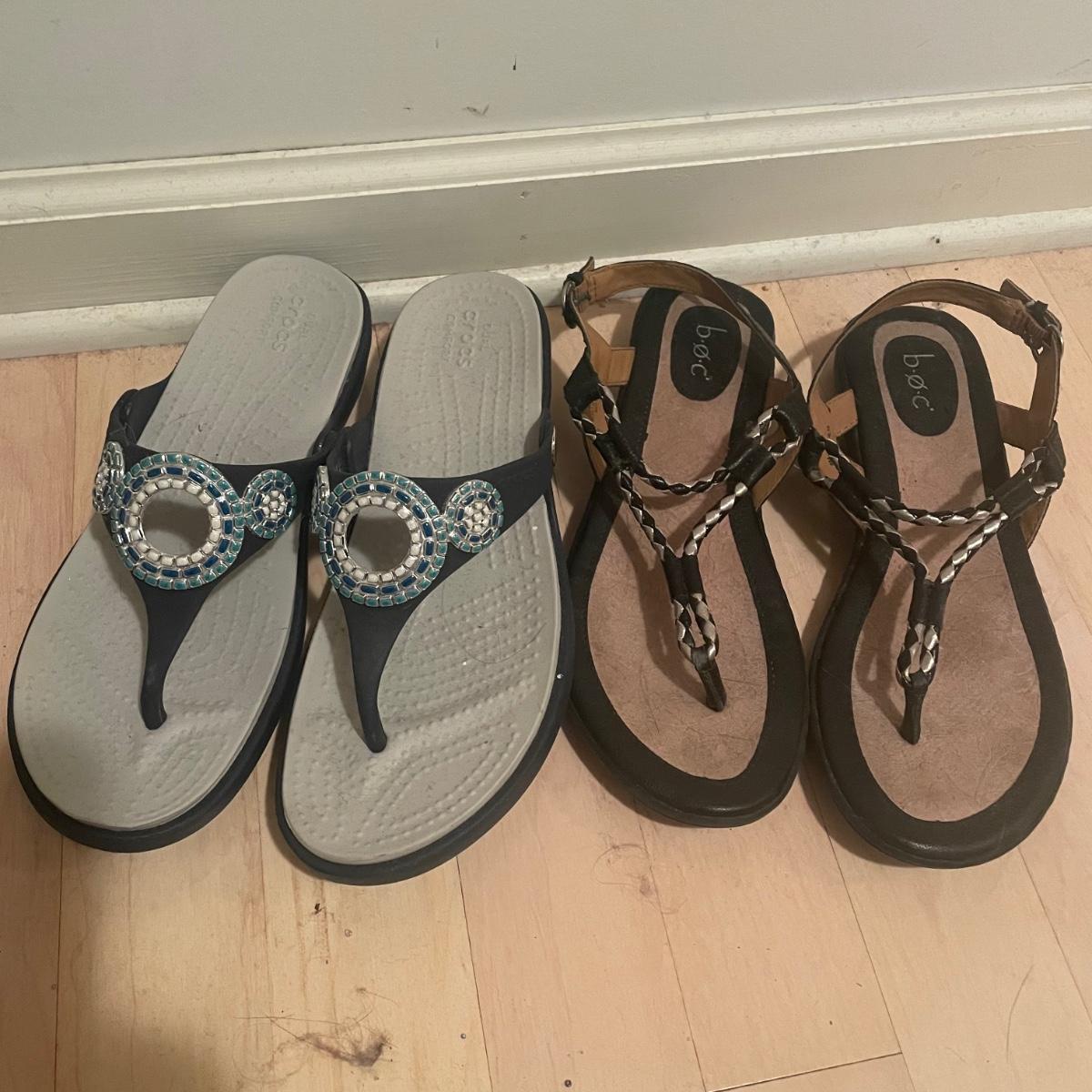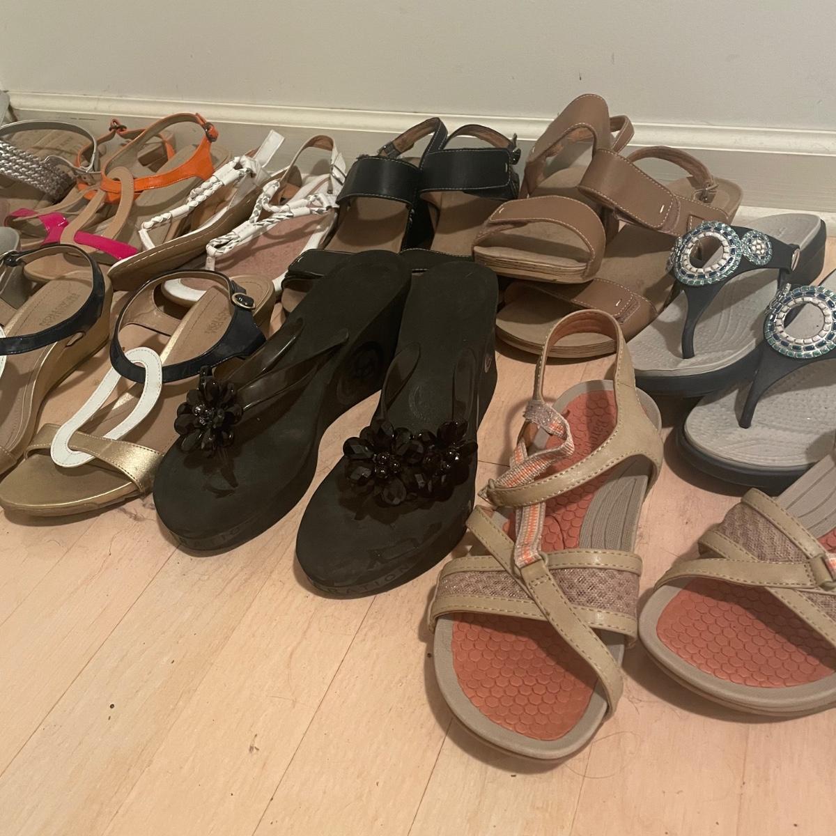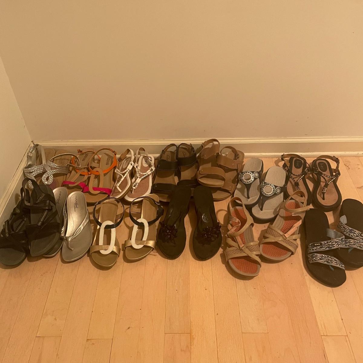 14 pairs of sandals here that are all in good condition; some are a little dusty/dirty. Great brand names include Clarks, Crocs, Kenneth Cole & more, see images. All appear to be between size 8 - 8.5 with the exception of the Clark’s Bendable sandals which are size 7.5.