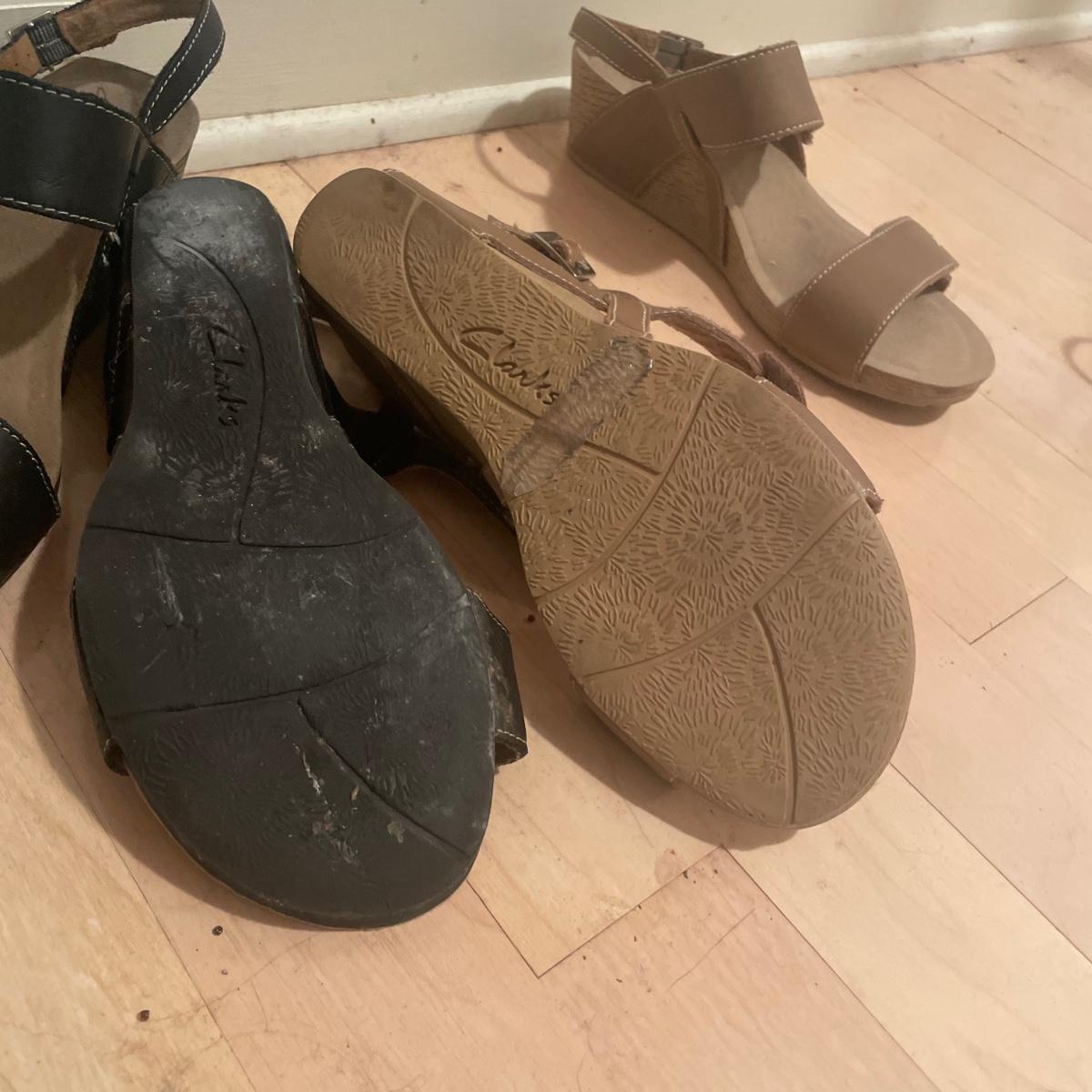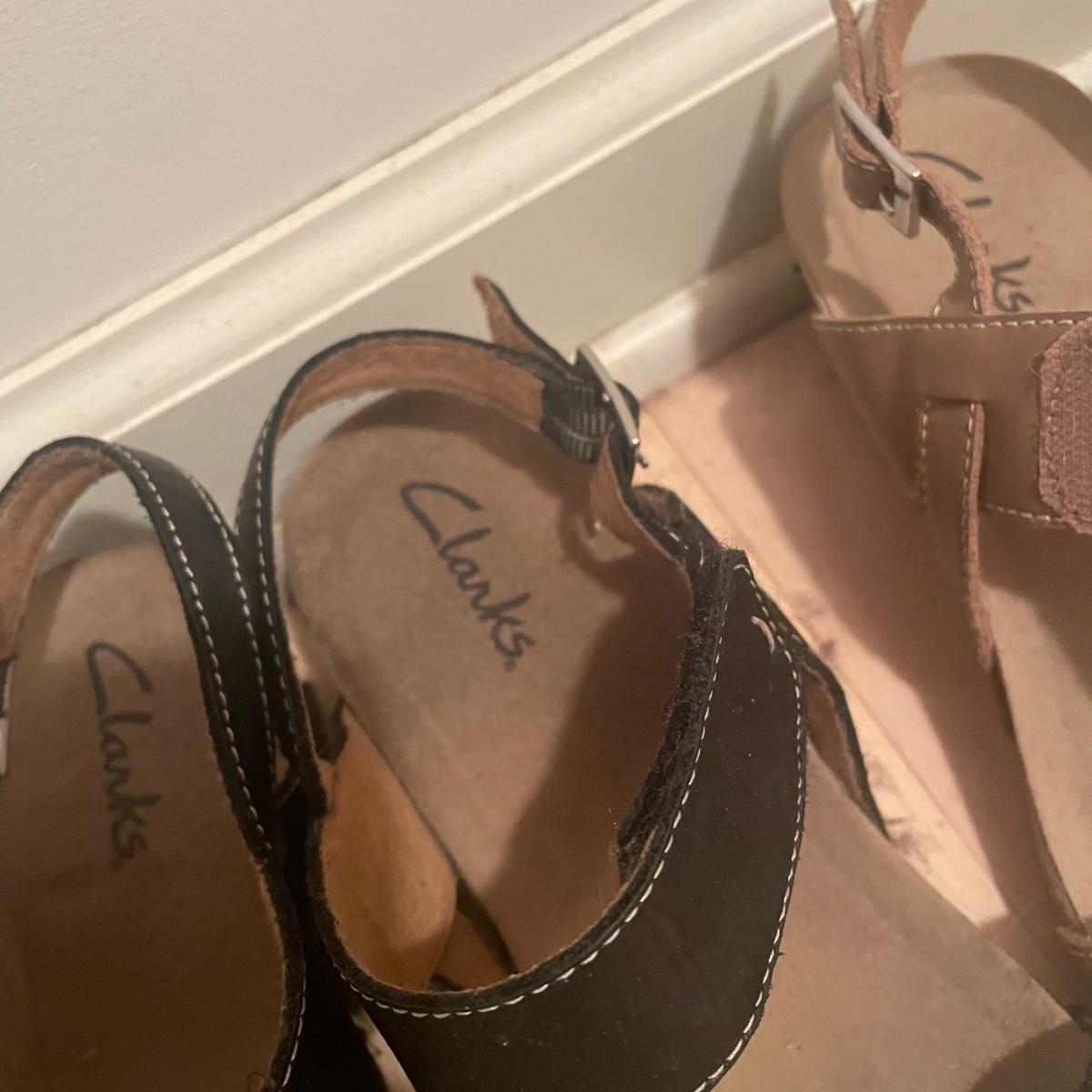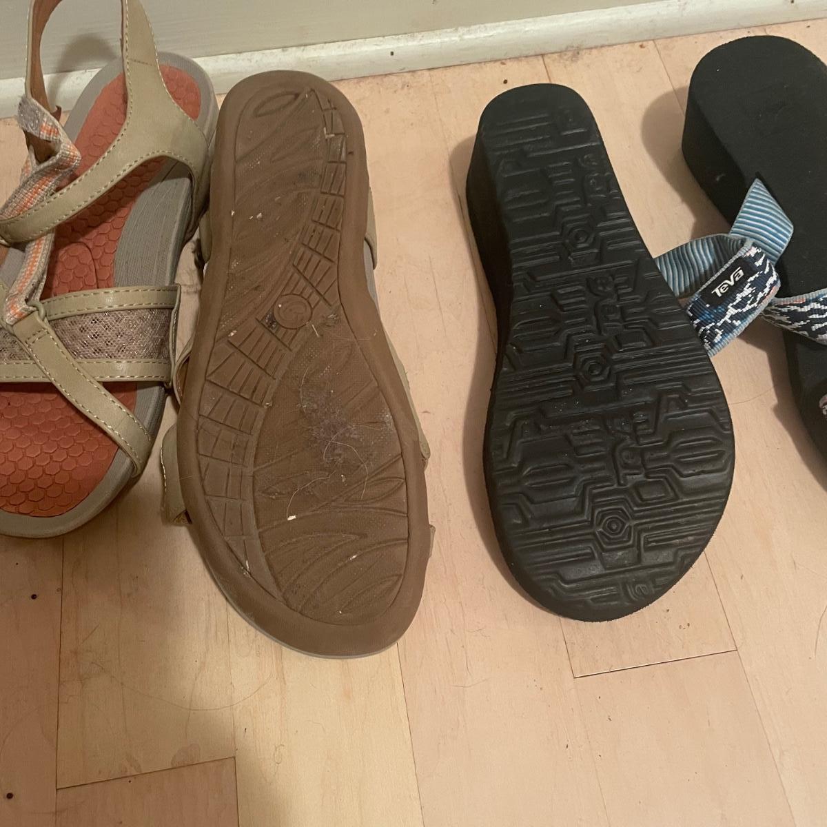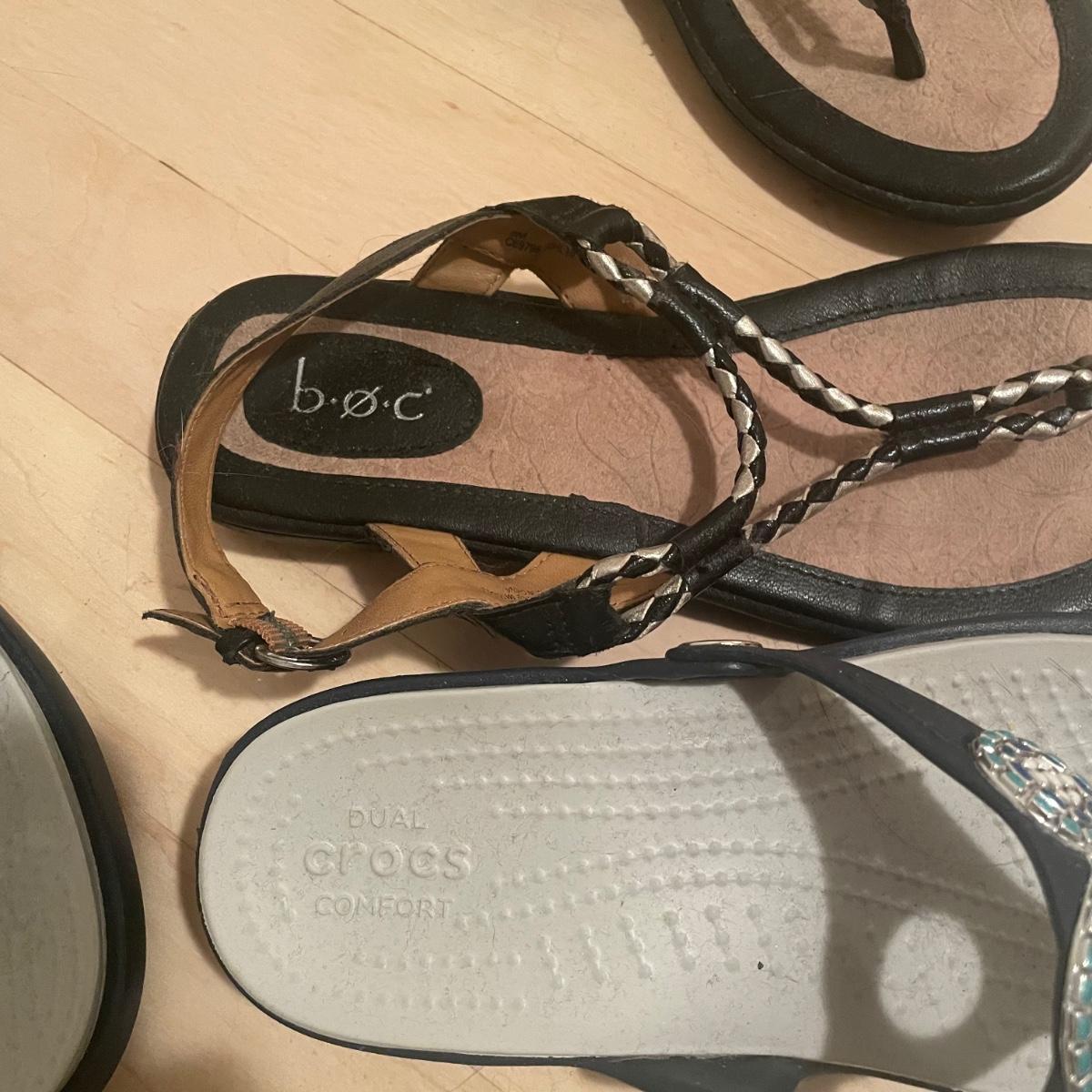 14 pairs of sandals here that are all in good condition; some are a little dusty/dirty. Great brand names include Clarks, Crocs, Kenneth Cole & more, see images. All appear to be between size 8 - 8.5 with the exception of the Clark’s Bendable sandals which are size 7.5.