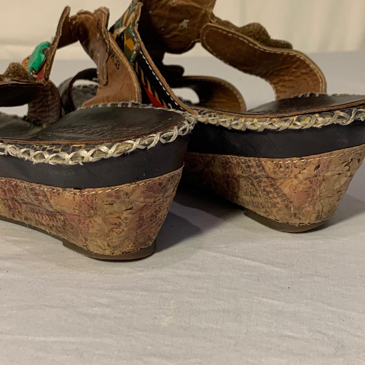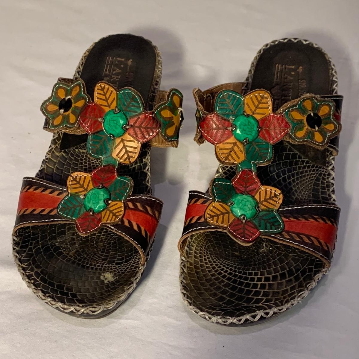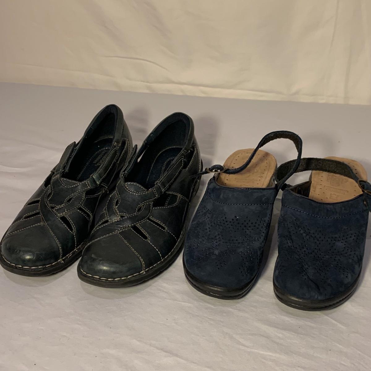 12 total pairs of shoes and sandals. Nine of the pairs are Clarks brand. There are also shoes by L’Artiste, Fly Flot, and Naturalizer. All show some wear. Please see photos for inventory, details, and sizes.
