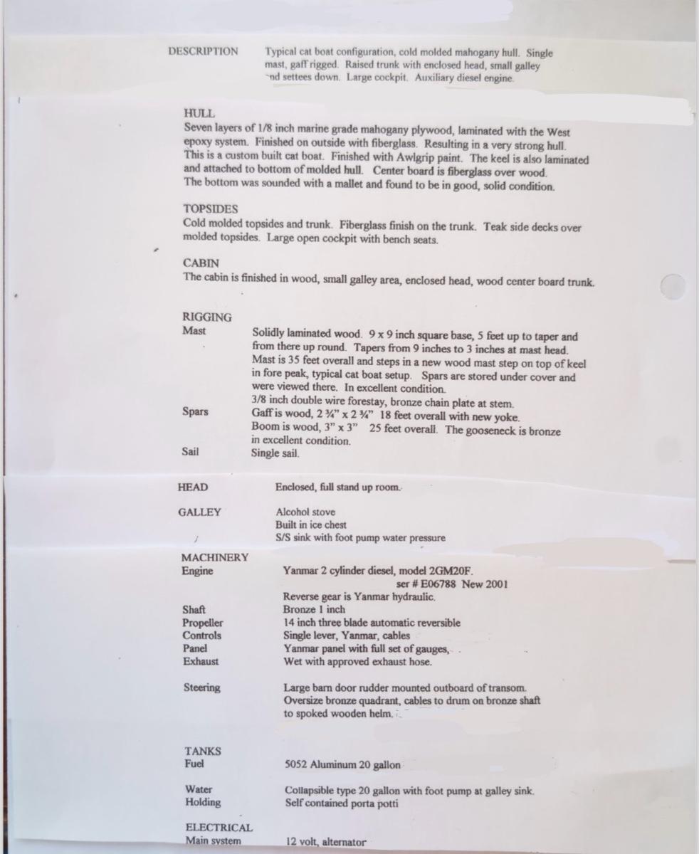1981 Vintage Classic 23’-6” Catboat “Periwinkle” Custom built cold molded mahogany and fiberglass cruising catboat built by Daybreak Boatyard in Connecticut. Newer 17Hp Yanmar Diesel, folding prop, teak decks. Full head room. Separate head with porta -potti.