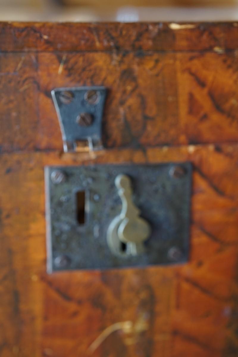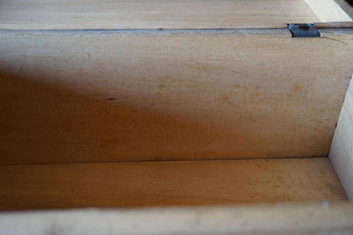 larger size box. used as a storage chest. The lock is hand forged no key and it has some damage to the top part. see photos. nice early handles. the interior is old but clean.