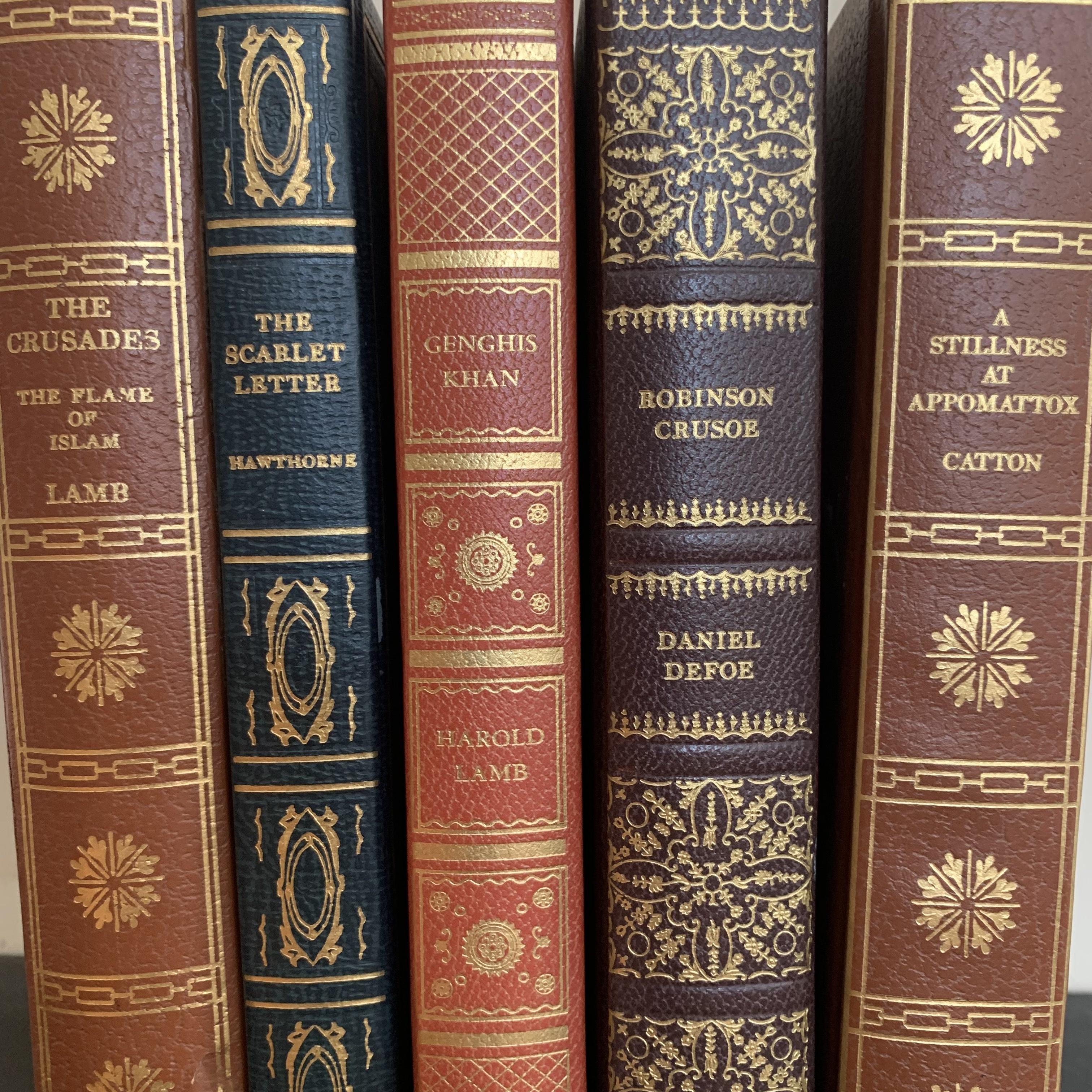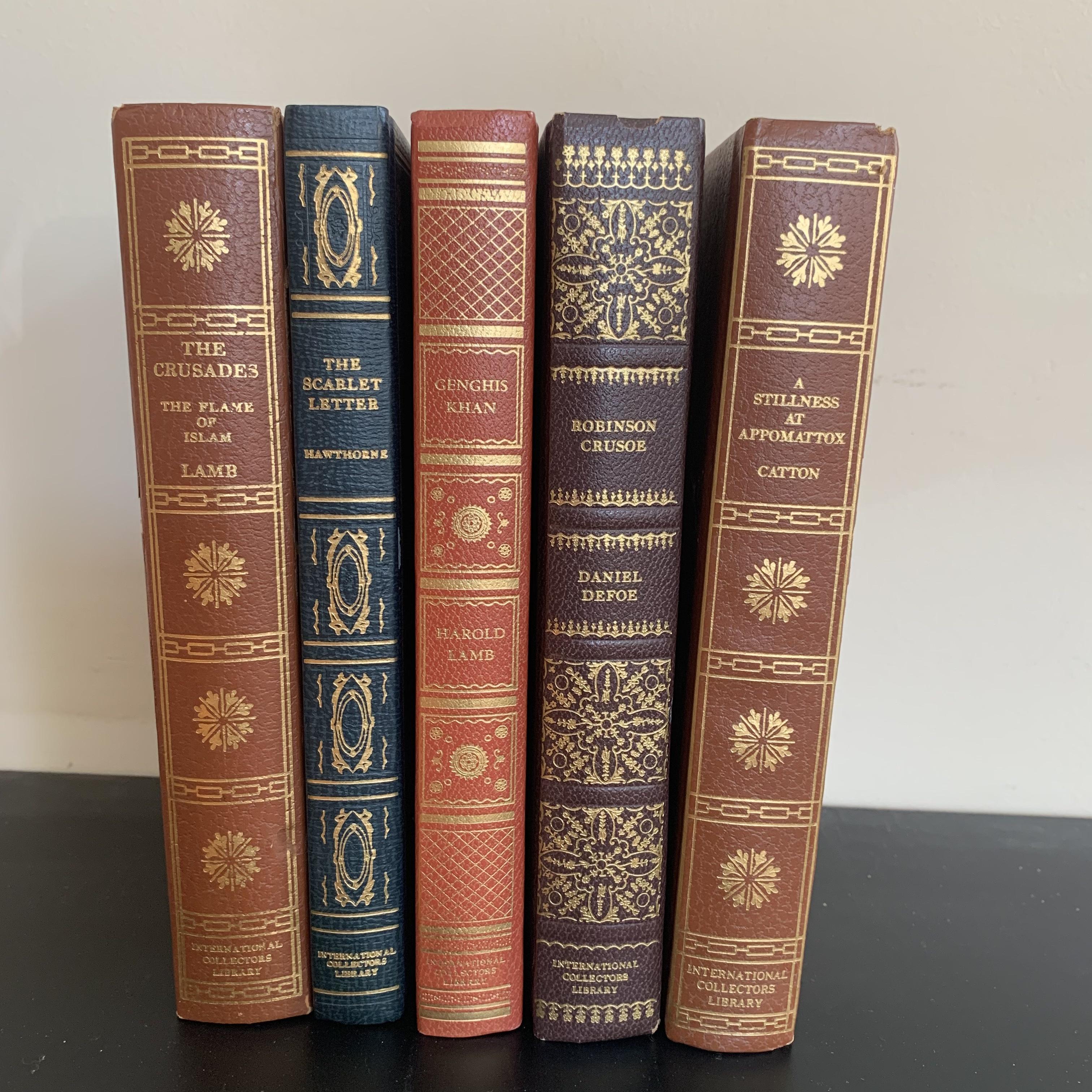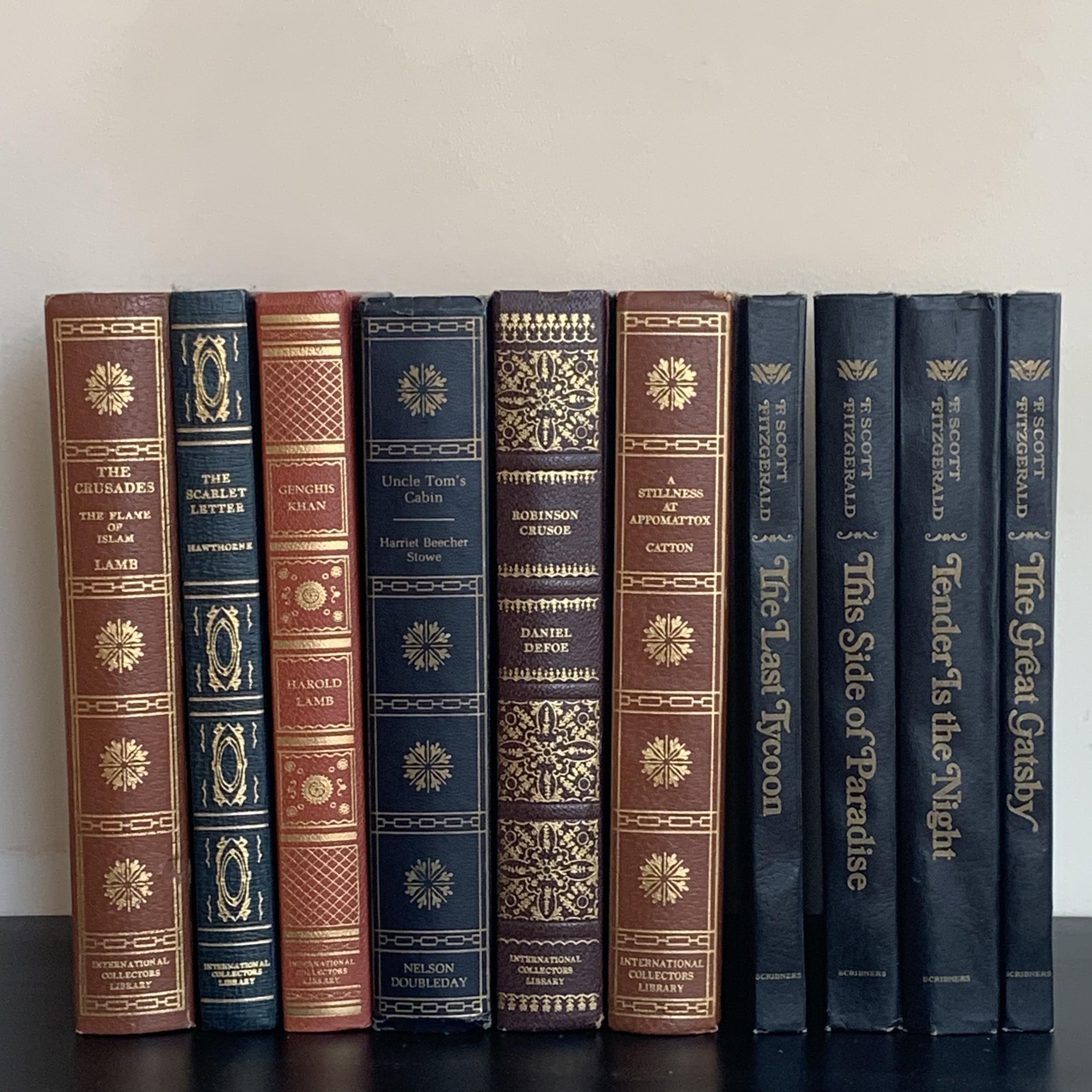 Ten classic hardcover books from the International Collector’s Library, Nelson Doubleday, & Scribners. The books appear to be leather bound (except the F. Scott Fitzgerald’s). A few of the books have leaflets that state there is 24K gold on the bindings. There is some wear seen on the corners and they are a bit dusty. Please see photos for book titles and information.