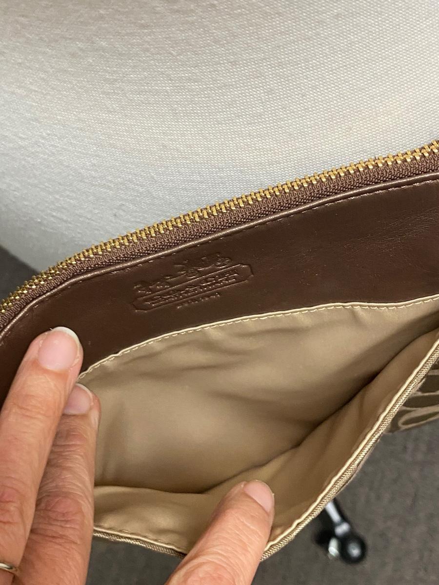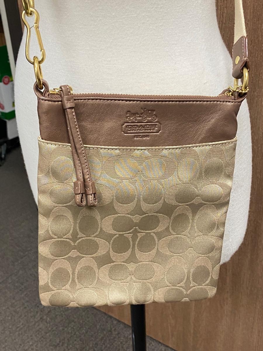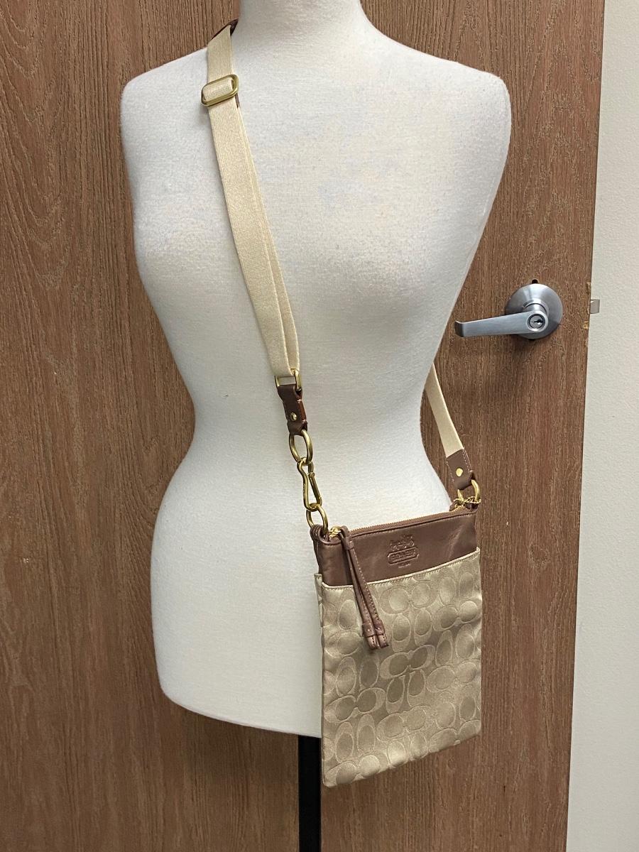 Classic Brown COACH Cross Body Bag. Light beige color. Multiple COACH stamped pieces, including the inside label with serial number. Looks unused. Adjustable shoulder strap, single zipper pocket with two outer pockets. Small sized, great for vacation or traveling.