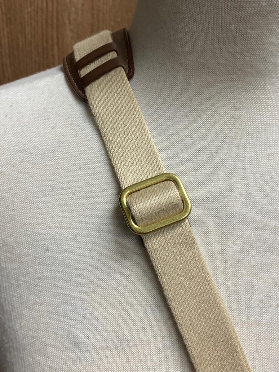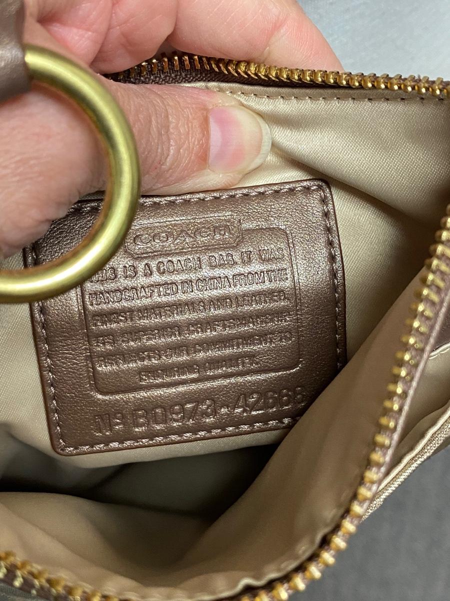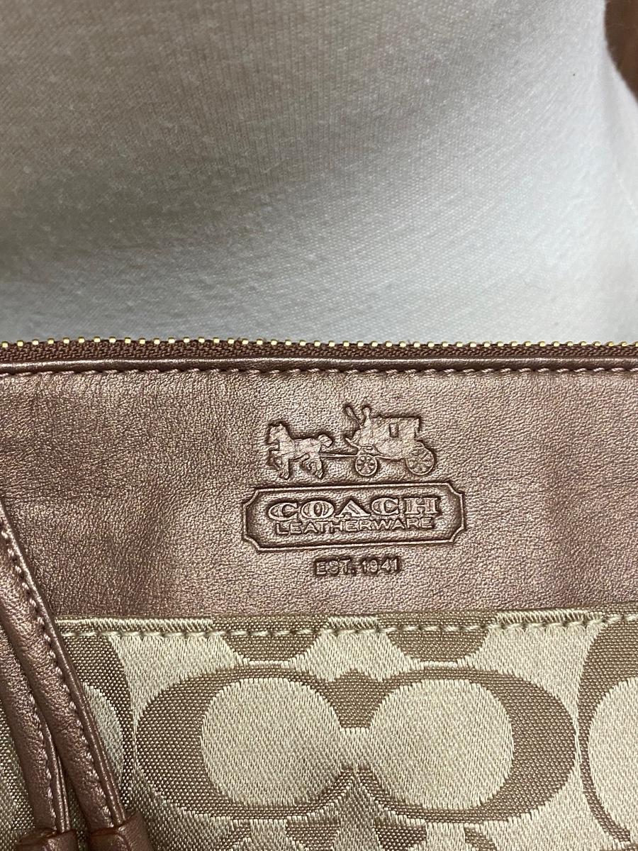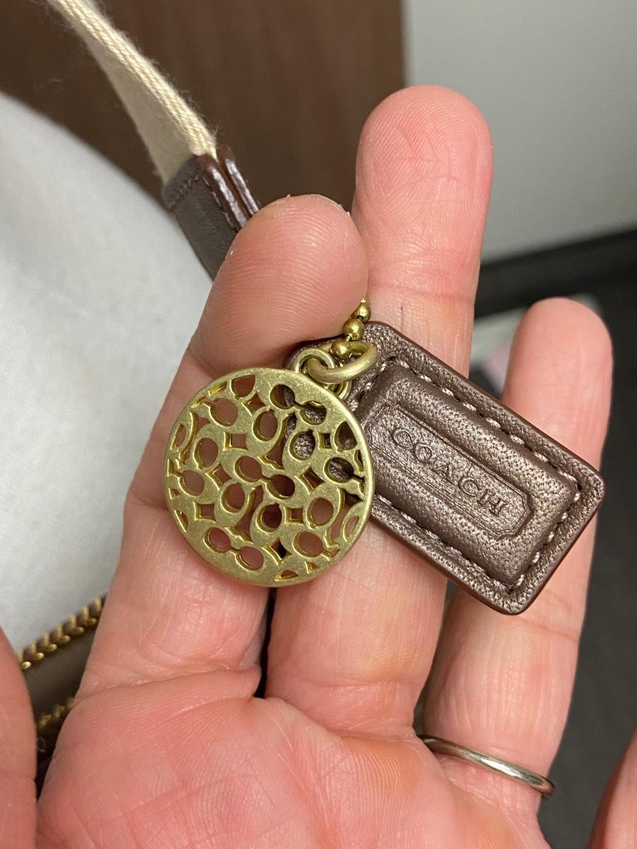 Classic Brown COACH Cross Body Bag. Light beige color. Multiple COACH stamped pieces, including the inside label with serial number. Looks unused. Adjustable shoulder strap, single zipper pocket with two outer pockets. Small sized, great for vacation or traveling.