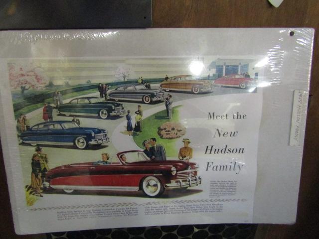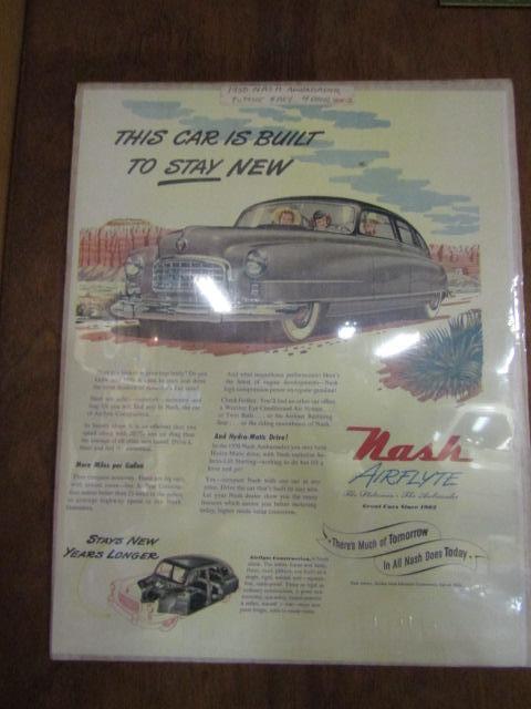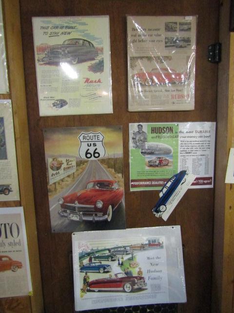 Classic Car Advertising from Vintage Magazines- for various makes and models of vehicles. Route 66 sign is metal.