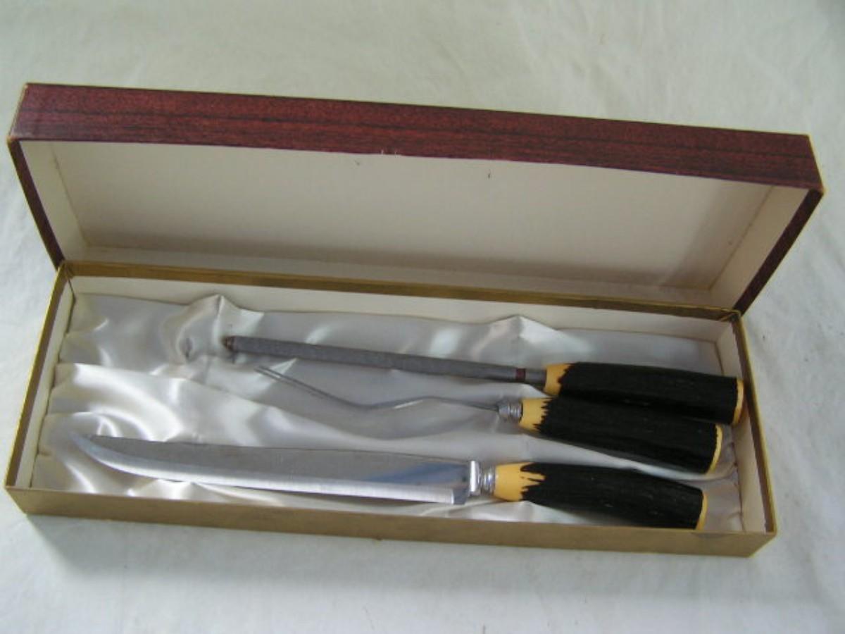 Classic carving set. 3 piece in flip top storage box. Appears like new/unused but box is a bit weathered & tattered.