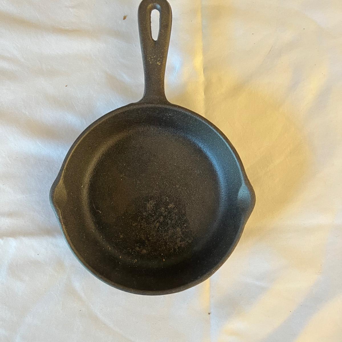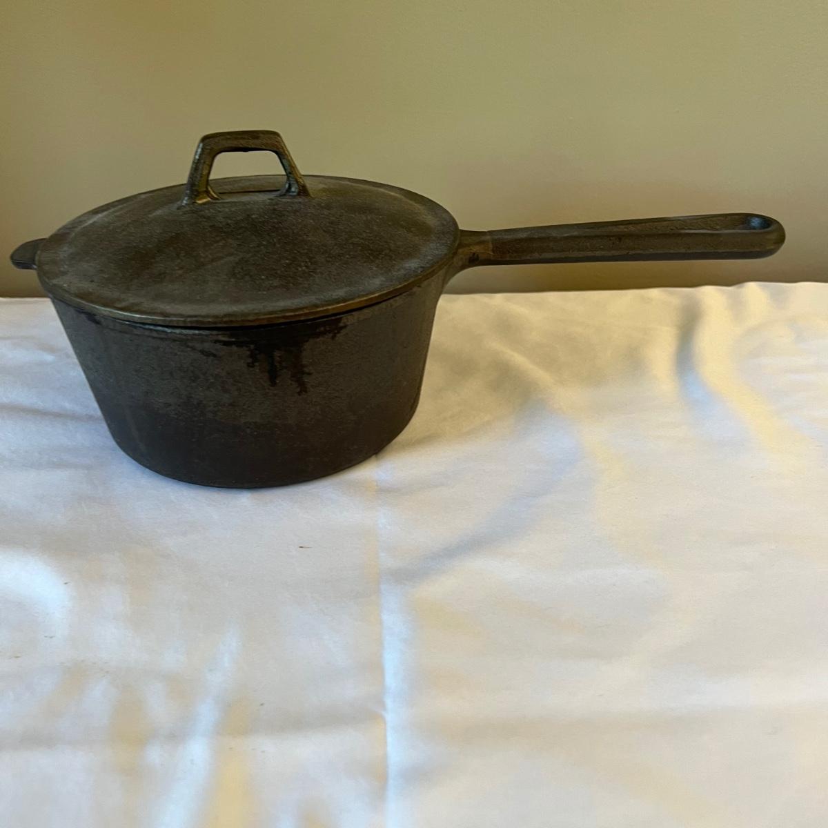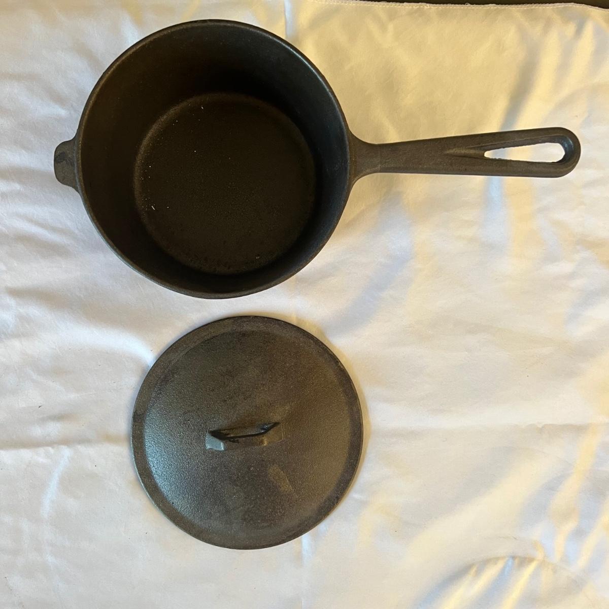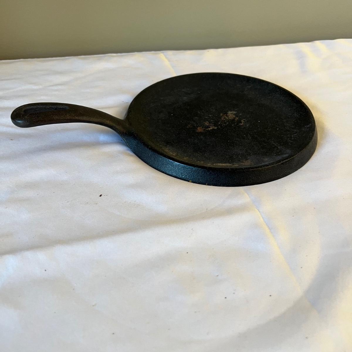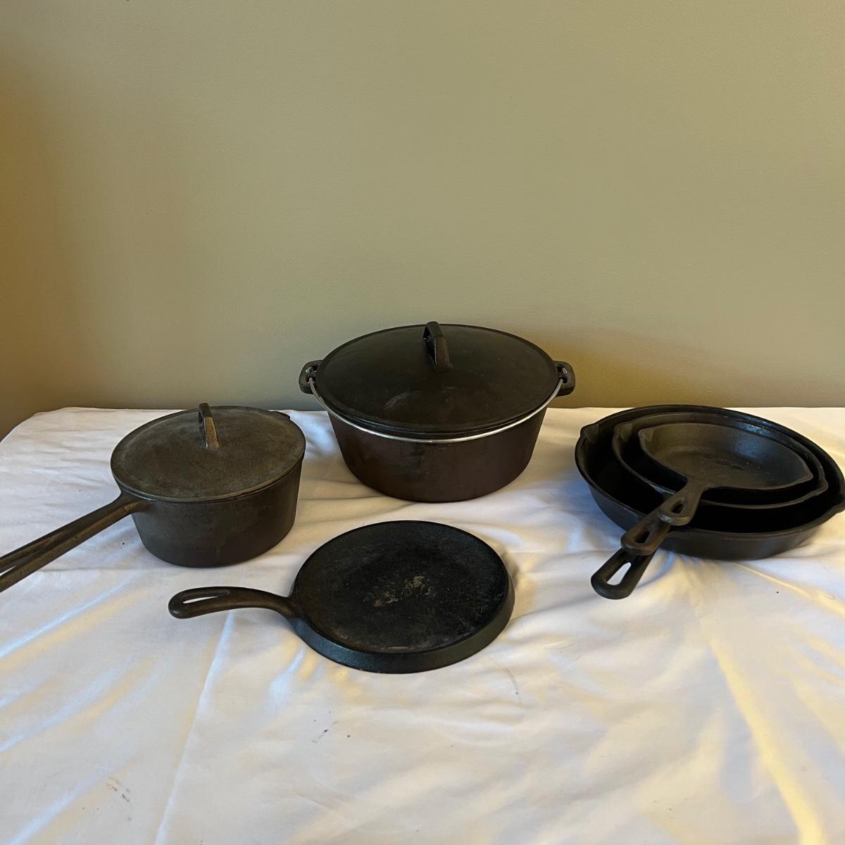 Six pieces of Classic cast iron cookware. One 7.5” D griddle. Three frying pans, 6” D, 7.5” D, and 9.5” D. Two pots, one 6.75” D x 3.5” H and one 10” D x 4” H. Both pots have matching cast iron lids.